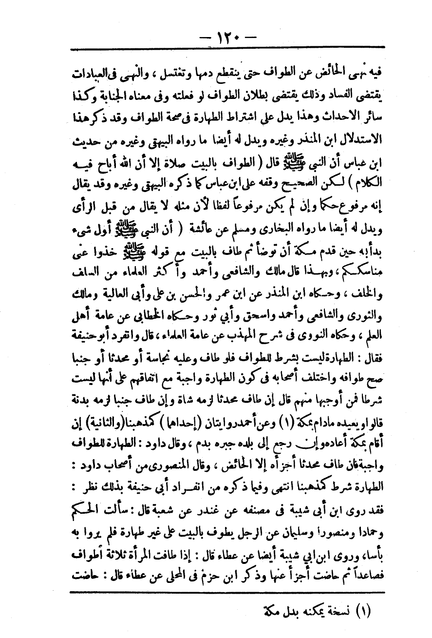 ـــــــــــــــــــــــــــــQفِيهِ نَهْيُ الْحَائِضِ عَنْ الطَّوَافِ حَتَّى يَنْقَطِعَ دَمُهَا وَتَغْتَسِلَ، وَالنَّهْيُ فِي الْعِبَادَاتِ يَقْتَضِي الْفَسَادَ وَذَلِكَ يَقْتَضِي بُطْلَانَ الطَّوَافِ لَوْ فَعَلَتْهُ وَفِي مَعْنَاهُ الْجَنَابَةُ وَكَذَا سَائِرُ الْأَحْدَاثِ وَهَذَا يَدُلُّ عَلَى اشْتِرَاطِ الطَّهَارَةِ فِي صِحَّةِ الطَّوَافِ وَقَدْ ذَكَرَ هَذَا الِاسْتِدْلَال ابْنُ الْمُنْذِرِ وَغَيْرُهُ وَيَدُلُّ لَهُ أَيْضًا مَا رَوَاهُ الْبَيْهَقِيُّ وَغَيْرُهُ مِنْ حَدِيثِ ابْنِ عَبَّاسٍ أَنَّ النَّبِيَّ - صَلَّى اللَّهُ عَلَيْهِ وَسَلَّمَ - قَالَ «الطَّوَافُ بِالْبَيْتِ صَلَاةٌ إلَّا أَنَّ اللَّهَ أَبَاحَ فِيهِ الْكَلَامَ» لَكِنَّ الصَّحِيحَ وَقْفُهُ عَلَى ابْنِ عَبَّاسٍ كَمَا ذَكَرَهُ الْبَيْهَقِيُّ وَغَيْرُهُ وَقَدْ يُقَالُ إنَّهُ مَرْفُوعٌ حُكْمًا وَإِنْ لَمْ يَكُنْ مَرْفُوعًا لَفْظًا لِأَنَّ مِثْلَهُ لَا يُقَالُ مِنْ قِبَلِ الرَّأْيِ وَيَدُلُّ لَهُ أَيْضًا مَا رَوَاهُ الْبُخَارِيُّ وَمُسْلِمٌ عَنْ عَائِشَةَ «إنَّ النَّبِيَّ - صَلَّى اللَّهُ عَلَيْهِ وَسَلَّمَ - أَوَّلُ شَيْءٍ بَدَأَ بِهِ حِينَ قَدِمَ مَكَّةَ أَنْ تَوَضَّأَ ثُمَّ طَافَ بِالْبَيْتِ مَعَ قَوْلِهِ - صَلَّى اللَّهُ عَلَيْهِ وَسَلَّمَ - خُذُوا عَنَى مَنَاسِكَكُمْ» وَبِهَذَا قَالَ مَالِكٌ وَالشَّافِعِيُّ وَأَحْمَدُ وَأَكْثَرُ الْعُلَمَاءِ مِنْ السَّلَفِ وَالْخَلَفِ وَحَكَاهُ ابْنُ الْمُنْذِرِ عَنْ ابْنِ عُمَرَ وَالْحَسَنِ بْنِ عَلِيٍّ وَأَبِي الْعَالِيَةِ وَمَالِكٍ وَالثَّوْرِيِّ وَالشَّافِعِيِّ وَأَحْمَدَ وَإِسْحَاقُ وَأَبِي ثَوْرٍ وَحَكَاهُ الْخَطَّابِيُّ عَنْ عَامَّةِ أَهْلِ الْعِلْمِ: وَحَكَاهُ النَّوَوِيُّ فِي شَرْحِ الْمُهَذَّبِ عَنْ عَامَّةِ الْعُلَمَاءِ. قَالَ وَانْفَرَدَ أَبُو حَنِيفَةَ فَقَالَ: الطَّهَارَةُ لَيْسَتْ بِشَرْطٍ لِلطَّوَافِ فَلَوْ طَافَ وَعَلَيْهِ نَجَاسَةٌ أَوْ مُحْدِثًا أَوْ جُنُبًا صَحَّ طَوَافُهُ وَاخْتَلَفَ أَصْحَابُهُ فِي كَوْنِ الطَّهَارَةِ وَاجِبَةً مَعَ اتِّفَاقِهِمْ عَلَى أَنَّهَا لَيْسَتْ شَرْطًا فَمَنْ أَوْجَبَهَا مِنْهُمْ قَالَ إنْ طَافَ مُحْدِثًا لَزِمَهُ شَاةٌ وَإِنْ طَافَ جُنُبًا لَزِمَهُ بَدَنَةٌ قَالُوا وَيُعِيدُهُ مَا دَامَ بِمَكَّةَ وَعَنْ أَحْمَدَ رِوَايَتَانِ (إحْدَاهُمَا) كَمَذْهَبِنَا.