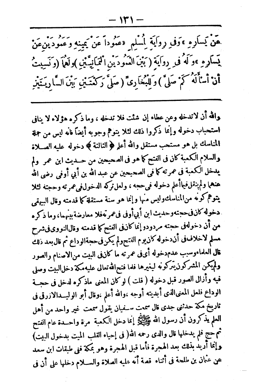 وَقَالَ أَبُو الْوَلِيدِ الْأَزْرَقِيُّ فِي تَارِيخِ مَكَّةَ حَدَّثَنِي جَدِّي قَالَ سَمِعْت سُفْيَانَ يَقُولُ سَمِعْت غَيْرَ وَاحِدٍ مِنْ أَهْلِ الْعِلْمِ يَذْكُرُونَ «أَنَّ رَسُولَ اللَّهِ - صَلَّى اللَّهُ عَلَيْهِ وَسَلَّمَ - إنَّمَا دَخَلَ الْكَعْبَةَ مَرَّةً وَاحِدَةً عَامَ الْفَتْحِ ثُمَّ حَجَّ فَلَمْ يَدْخُلْهَا» قَالَ وَالِدِي - رَحِمَهُ اللَّهُ - (فِي إحْيَاءِ الْقَلْبِ الْمَيِّتِ بِدُخُولِ الْبَيْتِ) وَإِنَّمَا أُرِيدَ بِذَلِكَ بَعْدَ الْهِجْرَةِ فَأَمَّا قَبْلَ الْهِجْرَةِ وَهُوَ بِمَكَّةَ فَفِي طَبَقَاتِ ابْنِ سَعْدٍ عَنْ عُثْمَانَ بْنِ طَلْحَةَ فِي أَثْنَاءِ قِصَّةٍ أَنَّهُ - عَلَيْهِ الصَّلَاةُ وَالسَّلَامُ - دَخَلَهَا عَلَى أَنَّ فِي