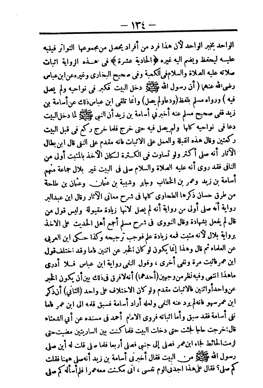 (الثَّانِي) أَنَّ ذِكْرَ ابْنِ عُمَرَ سَهْوٌ فَإِنَّهُ لَمْ يَرِدْ عَنْهُ النَّفْيَ وَلَعَلَّهُ أَرَادَ أُسَامَةَ فَسَبَقَ قَلَمُهُ إلَى ابْنِ عُمَرَ فَأَمَّا نَفْيُ أُسَامَةَ فَقَدْ سَبَقَ وَأَمَّا إثْبَاتُهُ فَرَوَى الْإِمَامُ أَحْمَدُ فِي مُسْنَدِهِ عَنْ أَبِي الشَّعْثَاءِ قَالَ: «خَرَجْت حَاجًّا فَجِئْت حَتَّى دَخَلْت الْبَيْتَ فَلَمَّا كُنْت بَيْنَ السَّارِيَتَيْنِ مَضَيْت حَتَّى لَزِمْت الْحَائِطَ فَجَاءَ ابْنُ عُمَرَ فَصَلَّى إلَى جَنْبِي فَصَلَّى أَرْبَعًا فَلَمَّا صَلَّى قُلْت لَهُ أَيْنَ صَلَّى رَسُولُ اللَّهِ - صَلَّى اللَّهُ عَلَيْهِ وَسَلَّمَ - مِنْ الْبَيْتِ فَقَالَ أَخْبَرَنِي أُسَامَةُ بْنُ زَيْدٍ أَنَّهُ صَلَّى هَهُنَا فَقُلْت كَمْ صَلَّى؟ فَقَالَ عَلَى هَذَا أَجِدُنِي أَلُومُ نَفْسِي. إنِّي مَكَثْت مَعَهُ عُمْرًا فَلَمْ أَسْأَلْهُ كَمْ صَلَّى»