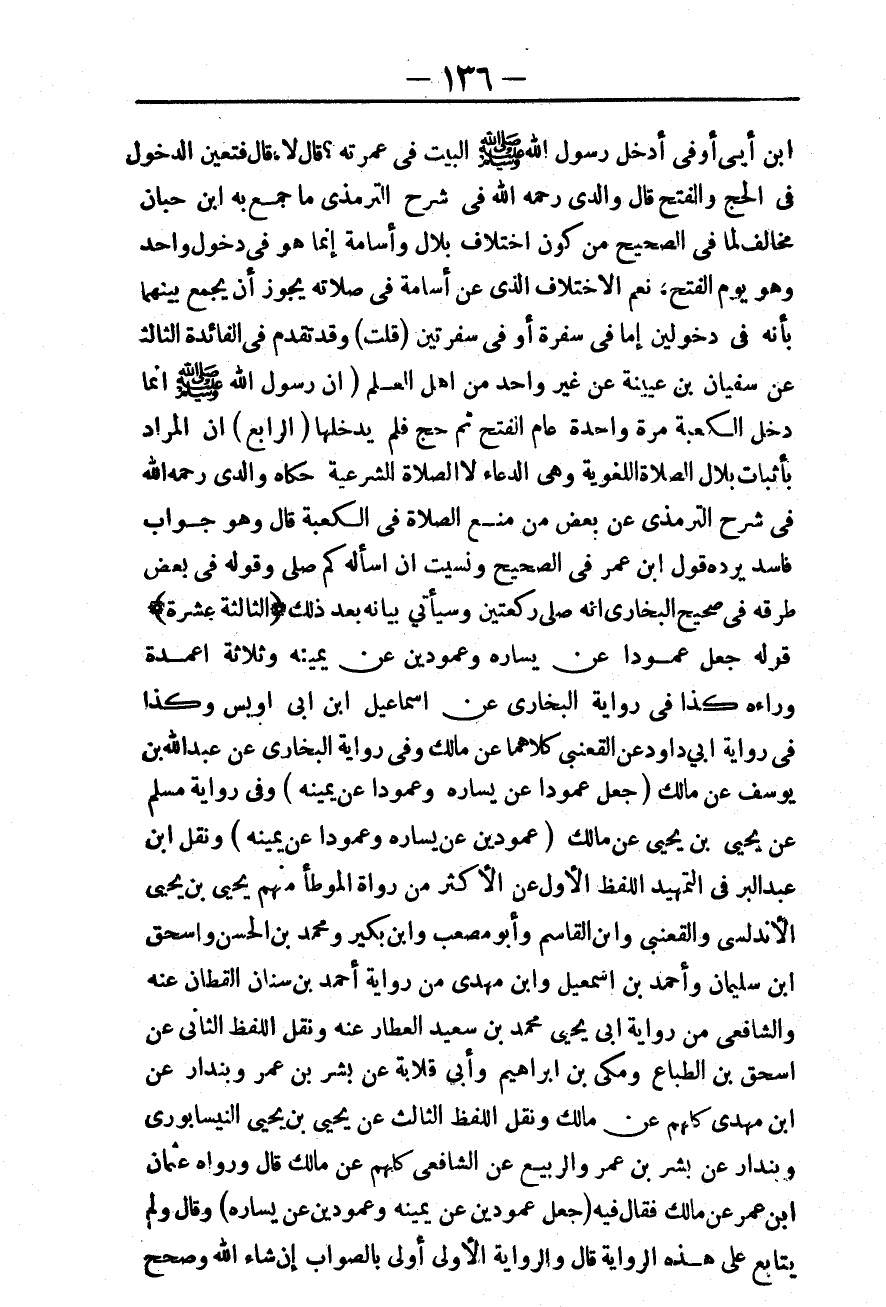 ـــــــــــــــــــــــــــــQأَدَخَلَ رَسُولُ اللَّهِ - صَلَّى اللَّهُ عَلَيْهِ وَسَلَّمَ - الْبَيْتَ فِي عُمْرَتِهِ؟ قَالَ لَا» ، قَالَ فَتَعَيَّنَ الدُّخُولُ فِي الْحَجِّ وَالْفَتْحِ قَالَ وَالِدِي - رَحِمَهُ اللَّهُ - فِي شَرْحِ التِّرْمِذِيِّ مَا جَمَعَ بِهِ ابْنُ حِبَّانَ مُخَالِفٌ لِمَا فِي الصَّحِيحِ مِنْ كَوْنِ اخْتِلَافِ بِلَالٍ وَأُسَامَةَ إنَّمَا هُوَ فِي دُخُولٍ وَاحِدٍ وَهُوَ يَوْمُ الْفَتْحِ نَعَمْ الِاخْتِلَافُ الَّذِي عَنْ أُسَامَةَ فِي صَلَاتِهِ يَجُوزُ أَنْ يَجْمَعَ بَيْنَهُمَا بِأَنَّهُ فِي دُخُولَيْنِ إمَّا فِي سُفْرَةٍ أَوْ فِي سُفْرَتَيْنِ (قُلْتُ) وَقَدْ تَقَدَّمَ فِي الْفَائِدَةِ الثَّالِثَةِ عَنْ سُفْيَانَ بْنِ عُيَيْنَةَ عَنْ غَيْرِ وَاحِدٍ مِنْ أَهْلِ الْعِلْمِ «أَنَّ رَسُولَ اللَّهِ - صَلَّى اللَّهُ عَلَيْهِ وَسَلَّمَ - إنَّمَا دَخَلَ الْكَعْبَةَ مَرَّةً وَاحِدَةً عَامَ الْفَتْحِ ثُمَّ حَجَّ فَلَمْ يَدْخُلْهَا» الرَّابِعُ أَنَّ الْمُرَادَ بِإِثْبَاتِ بِلَالٍ الصَّلَاةَ اللُّغَوِيَّةَ وَهِيَ الدُّعَاءُ لَا الصَّلَاةَ الشَّرْعِيَّةَ حَكَاهُ وَالِدِي - رَحِمَهُ اللَّهُ - فِي شَرْحِ التِّرْمِذِيِّ عَنْ بَعْضِ مَنْ مَنَعَ الصَّلَاةَ فِي الْكَعْبَةِ قَالَ وَهُوَ جَوَابٌ فَاسِدٌ يَرُدُّهُ قَوْلُ ابْنِ عُمَرَ فِي الصَّحِيحِ وَنَسِيتُ أَنْ أَسْأَلَهُ كَمْ صَلَّى وَقَوْلُهُ فِي بَعْضِ طُرُقِهِ فِي صَحِيحِ الْبُخَارِيِّ «أَنَّهُ صَلَّى رَكْعَتَيْنِ» وَسَيَأْتِي بَيَانُهُ بَعْدَ ذَلِكَ {الثَّالِثَةَ عَشْرَةَ} قَوْلُهُ «جَعَلَ عَمُودًا عَنْ يَسَارِهِ وَعَمُودَيْنِ عَنْ يَمِينِهِ وَثَلَاثَةَ أَعْمِدَةٍ وَرَاءَهُ» كَذَا فِي رِوَايَةِ الْبُخَارِيِّ عَنْ إسْمَاعِيلَ بْنِ أَبِي أُوَيْسٍ وَكَذَا فِي رِوَايَةِ أَبِي دَاوُد عَنْ الْقَعْنَبِيِّ كِلَاهُمَا عَنْ مَالِكٍ وَفِي رِوَايَةِ الْبُخَارِيِّ عَنْ عَبْدِ اللَّهِ بْنِ يُوسُفَ عَنْ مَالِكٍ «جَعَلَ عَمُودًا عَنْ يَسَارِهِ وَعَمُودًا عَنْ يَمِينِهِ» وَفِي رِوَايَةٍ مُسْلِمٍ عَنْ يَحْيَى بْنِ يَحْيَى عَنْ مَالِكٍ «عَمُودَيْنِ عَنْ يَسَارِهِ وَعَمُودًا عَنْ يَمِينِهِ» وَنَقَلَ ابْنُ عَبْدِ الْبَرِّ فِي التَّمْهِيدِ اللَّفْظُ الْأَوَّلُ عَنْ الْأَكْثَرِ مِنْ رُوَاةِ الْمُوَطَّإِ مِنْهُمْ يَحْيَى بْنُ يَحْيَى الْأَنْدَلُسِيُّ وَالْقَعْنَبِيُّ وَابْنُ الْقَاسِمِ وَأَبُو مُصْعَبٍ وَابْنُ بُكَيْر وَمُحَمَّدُ بْنُ الْحَسَنِ وَإِسْحَاقُ بْنُ سُلَيْمَانَ وَأَحْمَدُ بْنُ إسْمَاعِيلَ وَابْنُ مَهْدِيٍّ مِنْ رِوَايَةِ أَحْمَدَ بْنِ سِنَانٍ الْقَطَّانِ عَنْهُ وَالشَّافِعِيِّ مِنْ رِوَايَةِ أَبِي يَحْيَى مُحَمَّدِ بْنِ سَعِيدٍ الْعَطَّارِ عَنْهُ وَنَقَلَ اللَّفْظَ الثَّانِي عَنْ إِسْحَاقَ بْنِ الطَّبَّاعِ وَمَكِّيِّ بْنِ إبْرَاهِيمَ وَأَبِي قِلَابَةَ عَنْ بِشْرِ بْنِ عُمَرَ وَبُنْدَارٍ عَنْ ابْنِ مَهْدِيٍّ كُلُّهُمْ عَنْ مَالِكٍ وَنَقَلَ اللَّفْظَ الثَّالِثَ عَنْ يَحْيَى بْنِ يَحْيَى النَّيْسَابُورِيِّ وَبُنْدَارٍ عَنْ بِشْرِ بْنِ عُمَرَ وَالرَّبِيعِ عَنْ الشَّافِعِيِّ كُلِّهِمْ عَنْ مَالِكٍ قَالَ وَرَوَاهُ عُثْمَانُ بْنُ عُمَرَ عَنْ مَالِكٍ فَقَالَ فِيهِ «جَعَلَ عَمُودَيْنِ عَنْ يَمِينِهِ وَعَمُودَيْنِ عَنْ يَسَارِهِ» وَقَالَ وَلَمْ يُتَابِعْ عَلَى هَذِهِ الرِّوَايَةِ قَالَ وَالرِّوَايَةُ الْأُولَى أَوْلَى بِالصَّوَابِ إنْ شَاءَ اللَّهُ وَصَحَّحَ