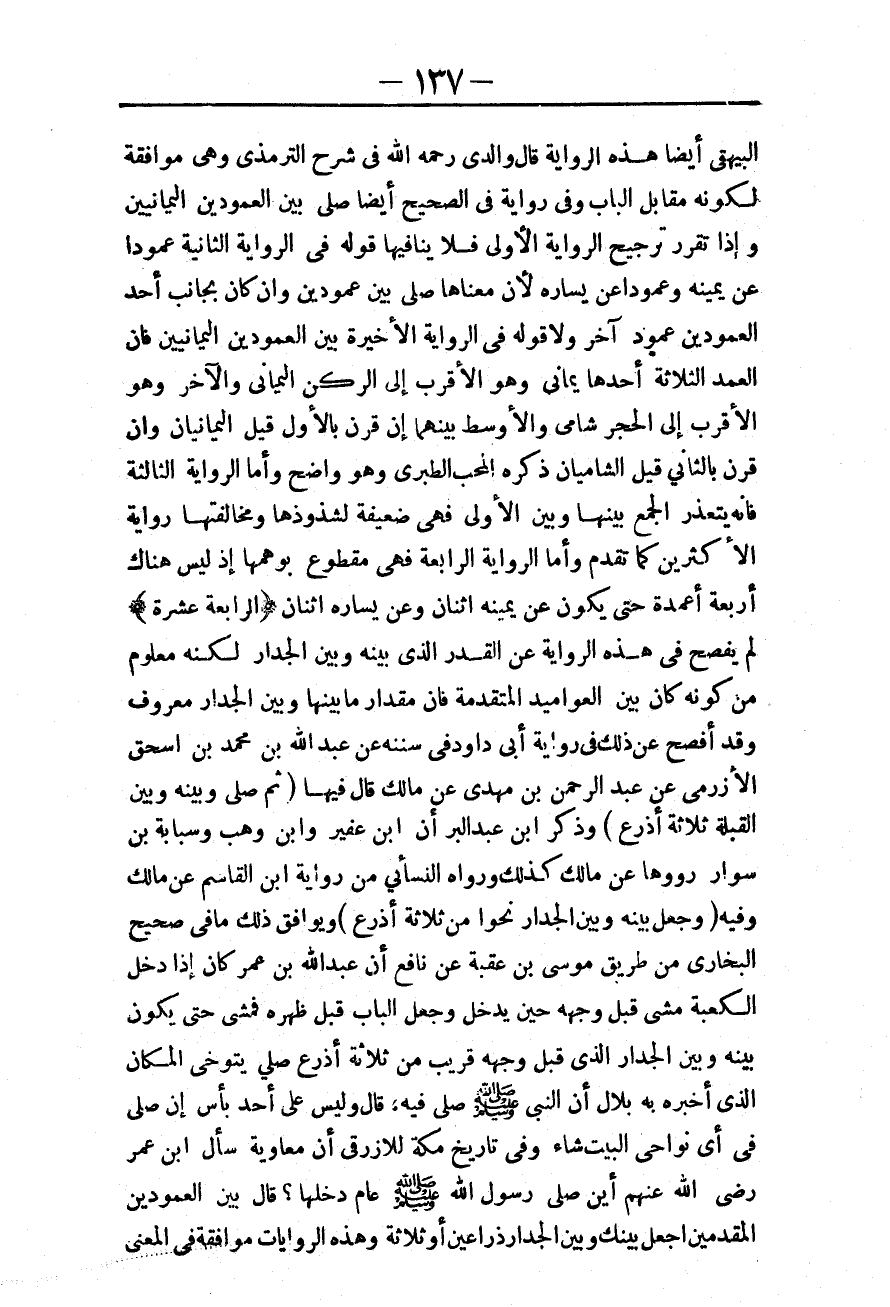 ـــــــــــــــــــــــــــــQالْبَيْهَقِيُّ أَيْضًا هَذِهِ الرِّوَايَةَ قَالَ وَالِدِي - رَحِمَهُ اللَّهُ - فِي شَرْحِ التِّرْمِذِيِّ وَهِيَ مُوَافِقَةٌ لِكَوْنِهِ مُقَابِلَ الْبَابِ وَفِي رِوَايَةٍ فِي الصَّحِيحِ أَيْضًا «صَلَّى بَيْنَ الْعَمُودَيْنِ الْيَمَانِيَيْنِ» وَإِذَا تَقَرَّرَ تَرْجِيحُ الرِّوَايَةِ الْأُولَى فَلَا يُنَافِيهَا قَوْلُهُ فِي الرِّوَايَةِ الثَّانِيَةِ عَمُودًا عَنْ يَمِينِهِ وَعَمُودًا عَنْ يَسَارِهِ لِأَنَّ مَعْنَاهَا صَلَّى بَيْنَ عَمُودَيْنِ وَإِنْ كَانَ بِجَانِبِ أَحَدِ الْعَمُودَيْنِ عَمُودٌ آخَرُ وَلَا قَوْلُهُ فِي الرِّوَايَةِ الْأَخِيرَةِ بَيْنَ الْعَمُودَيْنِ الْيَمَانِيَيْنِ فَإِنَّ الْعُمُدَ الثَّلَاثَةَ أَحَدُهَا يَمَانِيٌّ وَهُوَ الْأَقْرَبُ إلَى الرُّكْنِ الْيَمَانِيِّ وَالْآخَرُ وَهُوَ الْأَقْرَبُ إلَى الْحَجَرِ شَامِيٌّ وَالْأَوْسَطُ بَيْنَهُمَا إنْ قُرِنَ بِالْأَوَّلِ قِيلَ الْيَمَانِيَّانِ وَإِنْ قُرِنَ بِالثَّانِي قِيلَ الشَّامِيَّانِ ذَكَرَهُ الْمُحِبُّ الطَّبَرِيُّ وَهُوَ وَاضِحٌ وَأَمَّا الرِّوَايَةُ الثَّالِثَةُ فَإِنَّهُ يَتَعَذَّرُ الْجَمْعُ بَيْنَهَا وَبَيْنَ الْأُولَى فَهِيَ ضَعِيفَةٌ لِشُذُوذِهَا وَمُخَالَفَتِهَا رِوَايَةَ الْأَكْثَرِينَ كَمَا تَقَدَّمَ وَأَمَّا الرِّوَايَةُ الرَّابِعَةُ فَهِيَ مَقْطُوعٌ بِوَهْمِهَا إذْ لَيْسَ هُنَاكَ أَرْبَعَةُ أَعْمِدَةٍ حَتَّى يَكُونَ عَنْ يَمِينِهِ اثْنَانِ وَعَنْ يَسَارِهِ اثْنَانِ {الرَّابِعَةَ عَشْرَةَ} لَمْ يُفْصِحْ فِي هَذِهِ الرِّوَايَةِ عَنْ الْقَدْرِ الَّذِي بَيْنَهُ وَبَيْنَ الْجِدَارِ لَكِنَّهُ مَعْلُومٌ مِنْ كَوْنِهِ كَانَ بَيْنَ الْعَوَامِيدِ الْمُتَقَدِّمَةِ فَإِنَّ مِقْدَارَ مَا بَيْنَهَا وَبَيْنَ الْجِدَارِ مَعْرُوفٌ وَقَدْ أَفْصَحَ عَنْ ذَلِكَ فِي رِوَايَةِ أَبِي دَاوُد فِي سُنَنِهِ عَنْ عَبْدِ اللَّهِ بْنِ مُحَمَّدِ بْنِ إِسْحَاقَ الْأَزْرَمِيِّ عَنْ عَبْدِ الرَّحْمَنِ بْنِ مَهْدِيٍّ عَنْ مَالِكٍ قَالَ فِيهَا «ثُمَّ صَلَّى وَبَيْنَهُ وَبَيْنَ الْقِبْلَةِ ثَلَاثَةُ أَذْرُعٍ» وَذَكَرَ ابْنُ عَبْدِ الْبَرِّ أَنَّ ابْنَ عُفَيْرٍ وَابْنَ وَهْبٍ وَشَبَّابَةَ بْنَ سَوَّارٍ رَوَوْهَا عَنْ مَالِكٍ كَذَلِكَ وَرَوَاهُ النَّسَائِيّ مِنْ رِوَايَةِ ابْنِ الْقَاسِمِ عَنْ مَالِكٍ وَفِيهِ «وَجَعَلَ بَيْنَهُ وَبَيْنَ الْجِدَارِ نَحْوًا مِنْ ثَلَاثَةِ أَذْرُعٍ» وَيُوَافِقُ ذَلِكَ مَا فِي صَحِيحِ الْبُخَارِيِّ مِنْ طَرِيقِ مُوسَى بْنِ عُقْبَةَ عَنْ نَافِعٍ أَنَّ عَبْدَ اللَّهَ بْنَ عُمَرَ كَانَ إذَا دَخَلَ الْكَعْبَةَ مَشَى قِبَلَ وَجْهِهِ حِينَ يَدْخُلُ وَجَعَلَ الْبَابَ قِبَلَ ظَهْرِهِ فَمَشَى حَتَّى يَكُونَ بَيْنَهُ وَبَيْنَ الْجِدَارِ الَّذِي قِبَلَ وَجْهِهِ قَرِيبٌ مِنْ ثَلَاثَةِ أَذْرُعٍ صَلَّى يَتَوَخَّى الْمَكَانَ الَّذِي أَخْبَرَهُ بِهِ بِلَالٌ أَنَّ النَّبِيَّ - صَلَّى اللَّهُ عَلَيْهِ وَسَلَّمَ - صَلَّى فِيهِ، قَالَ وَلَيْسَ عَلَى أَحَدٍ بَأْسٌ إنْ صَلَّى فِي أَيِّ نَوَاحِي الْبَيْتِ شَاءَ وَفِي تَارِيخِ مَكَّةَ لِلْأَزْرَقِيِّ أَنَّ مُعَاوِيَةَ «سَأَلَ ابْنَ عُمَرَ - رَضِيَ اللَّهُ عَنْهُمْ - أَيْنَ صَلَّى رَسُولُ اللَّهِ - صَلَّى اللَّهُ عَلَيْهِ وَسَلَّمَ - عَامَ دَخَلَهَا؟ قَالَ بَيْنَ الْعَمُودَيْنِ الْمُقَدَّمَيْنِ اجْعَلْ بَيْنَك وَبَيْنَ الْجِدَارِ ذِرَاعَيْنِ أَوْ ثَلَاثَةً» وَهَذِهِ الرِّوَايَاتُ مُوَافِقَةٌ فِي الْمَعْنَى