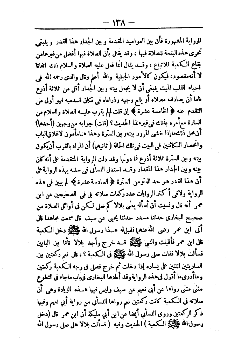 (أَحَدُهُمَا) أَنَّ مَحَلَّ ذَلِكَ مَا إذَا خَشِيَ الْمُرُورَ بَيْنَهُ وَبَيْنَ السُّتْرَةِ وَهَذَا هُنَا مَأْمُونٌ لِإِغْلَاقِ الْبَابِ وَانْحِصَارِ الْكَائِنِينَ فِي الْبَيْتِ فِي تِلْكَ الْحَالَةِ (ثَانِيهمَا) أَنَّ الْمُرَادَ بِالْقُرْبِ أَنْ يَكُونَ بَيْنَهُ وَبَيْنَ السُّتْرَةِ ثَلَاثَةُ أَذْرُعٍ فَمَا دُونَهَا وَقَدْ دَلَّتْ الرِّوَايَةُ الْمُتَقَدِّمَةُ عَلَى أَنَّهُ كَانَ بَيْنَهُ وَبَيْنَ الْجِدَارِ هَذَا الْمِقْدَارُ وَقَدْ اسْتَدَلَّ النَّسَائِيّ فِي سُنَنِهِ بِهَذِهِ الرِّوَايَةِ عَلَى أَنَّ هَذَا الْقَدْرَ هُوَ حَدُّ الدُّنُوِّ مِنْ السُّتْرَةِ {السَّادِسَةَ عَشْرَةَ} لَمْ يُبَيِّنْ فِي هَذِهِ الرِّوَايَةِ وَلَا فِي أَكْثَرِ الرِّوَايَاتِ عَدَدَ رَكَعَاتِ صَلَاتِهِ بَلْ فِي الصَّحِيحَيْنِ عَنْ ابْنِ عُمَرَ «أَنَّهُ قَالَ وَنَسِيت أَنْ أَسْأَلَهُ يَعْنِي بِلَالًا كَمْ صَلَّى» لَكِنْ فِي أَوَائِلِ الصَّلَاةِ مِنْ صَحِيحِ الْبُخَارِيِّ حَدَّثَنَا مُسَدَّدٌ حَدَّثَنَا يَحْيَى عَنْ سَيْفٍ قَالَ سَمِعْت مُجَاهِدًا قَالَ «أُتِيَ ابْنَ عُمَرَ - رَضِيَ اللَّهُ عَنْهُمَا - فَقِيلَ لَهُ هَذَا رَسُولُ اللَّهِ - صَلَّى اللَّهُ عَلَيْهِ وَسَلَّمَ - دَخَلَ الْكَعْبَةَ قَالَ ابْنُ عُمَرَ فَأَقْبَلْت وَالنَّبِيُّ - صَلَّى اللَّهُ عَلَيْهِ وَسَلَّمَ - قَدْ خَرَجَ وَأَجِدُ بِلَالًا قَائِمًا بَيْنَ الْبَابَيْنِ فَسَأَلْت بِلَالًا فَقُلْتُ صَلَّى رَسُولُ اللَّهِ - صَلَّى اللَّهُ عَلَيْهِ وَسَلَّمَ - فِي الْكَعْبَةِ؟ قَالَ نَعَمْ رَكْعَتَيْنِ بَيْنَ السَّارِيَتَيْنِ اللَّتَيْنِ عَلَى يَسَارِهِ إذَا دَخَلْت ثُمَّ خَرَجَ فَصَلَّى فِي وَجْهِ الْكَعْبَةِ رَكْعَتَيْنِ» وَمَا أَدْرِي مَا أَقُولُ فِي هَذِهِ الرِّوَايَةِ وَقَدْ أَعَادَهَا الْبُخَارِيُّ فِي بَابِ مَا جَاءَ فِي التَّطَوُّعِ مَثْنَى مَثْنَى رَوَاهَا عَنْ أَبِي نُعَيْمٍ عَنْ سَيْفٍ وَلَيْسَ فِيهَا هَذِهِ الزِّيَادَةُ وَهِيَ أَنَّ صَلَاتَهُ فِي الْكَعْبَةِ كَانَتْ رَكْعَتَيْنِ نَعَمْ رَوَاهَا النَّسَائِيّ مِنْ رِوَايَةِ أَبِي نُعَيْمٍ وَفِيهَا ذِكْرُ الرَّكْعَتَيْنِ وَرَوَى النَّسَائِيّ أَيْضًا عَنْ ابْنِ أَبِي مُلَيْكَةَ أَنَّ عُمَرَ قَالَ «دَخَلَ رَسُولُ اللَّهِ - صَلَّى اللَّهُ عَلَيْهِ وَسَلَّمَ - الْكَعْبَةَ» الْحَدِيثَ وَفِيهِ «فَسَأَلْت بِلَالًا هَلْ صَلَّى رَسُولُ اللَّهِ