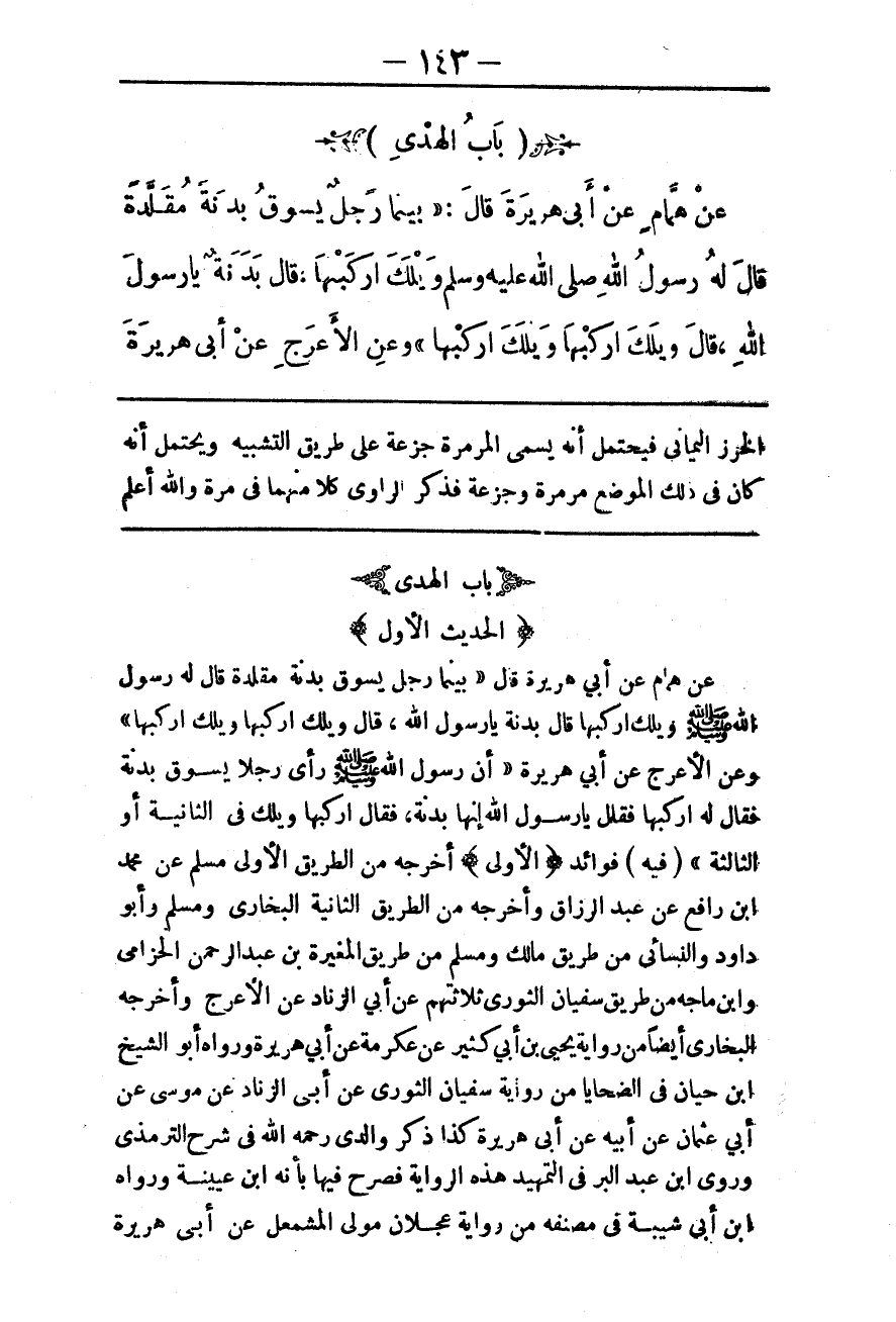 {بَابُ الْهَدْيِ} {الْحَدِيثُ الْأَوَّلُ} عَنْ هَمَّامٍ عَنْ أَبِي هُرَيْرَةَ قَالَ «بَيْنَمَا رَجُلٌ يَسُوقُ بَدَنَةً مُقَلَّدَةً قَالَ لَهُ رَسُولُ اللَّهِ - صَلَّى اللَّهُ عَلَيْهِ وَسَلَّمَ - وَيْلَك ارْكَبْهَا قَالَ بَدَنَةٌ يَا رَسُولَ اللَّهِ، قَالَ وَيْلَك ارْكَبْهَا وَيْلَك ارْكَبْهَا» وَعَنْ الْأَعْرَجِ عَنْ أَبِي هُرَيْرَةَ «أَنَّ رَسُولَ اللَّهِ - صَلَّى اللَّهُ عَلَيْهِ وَسَلَّمَ - رَأَى رَجُلًا يَسُوقُ بَدَنَةً فَقَالَ لَهُ ارْكَبْهَا فَقَالَ يَا رَسُولَ اللَّهِ إنَّهَا بَدَنَةٌ، فَقَالَ ارْكَبْهَا وَيْلَك فِي الثَّانِيَةِ أَوْ الثَّالِثَةِ» (فِيهِ) فَوَائِدُ: