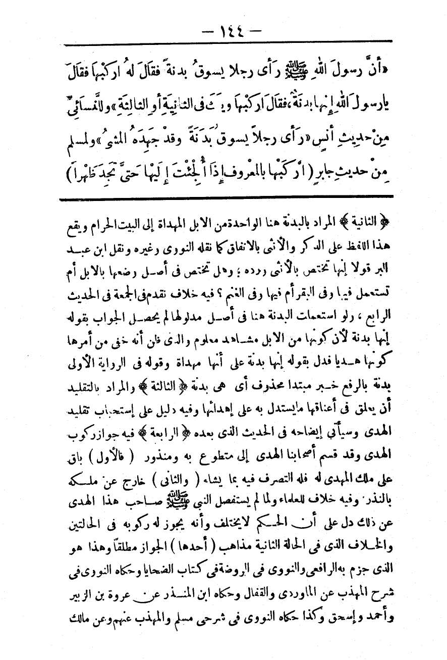«أَنَّ رَسُولَ اللَّهِ - صَلَّى اللَّهُ عَلَيْهِ وَسَلَّمَ - رَأَى رَجُلًا يَسُوقُ بَدَنَةً فَقَالَ لَهُ ارْكَبْهَا فَقَالَ يَا رَسُولَ اللَّهِ إنَّهَا بَدَنَةٌ، فَقَالَ ارْكَبْهَا وَيْلَك فِي الثَّانِيَةِ أَوْ الثَّالِثَةِ» وَلِلنَّسَائِيِّ مِنْ حَدِيثِ أَنَسٍ «رَأَى رَجُلًا يَسُوقَ بَدَنَةً وَقَدْ جَهِدَهُ الْمَشْيُ» وَلِمُسْلِمٍ مِنْ حَدِيثِ جَابِرٍ «ارْكَبْهَا بِالْمَعْرُوفِ إذَا أُلْجِئْت إلَيْهَا حَتَّى تَجِدَ ظَهْرًا»