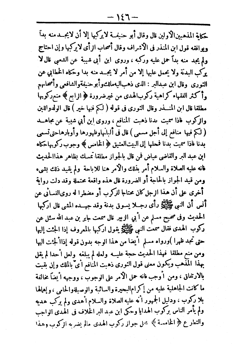 ـــــــــــــــــــــــــــــQحِكَايَةِ الْمَذْهَبَيْنِ الْأَوَّلَيْنِ قَالَ وَقَالَ أَبُو حَنِيفَةَ لَا يَرْكَبُهَا إلَّا أَنْ لَا يَجِدَ مِنْهُ بُدًّا وَيُوَافِقُهُ قَوْلُ ابْنِ الْمُنْذِرِ فِي الْإِشْرَافِ وَقَالَ أَصْحَابُ الرَّأْيِ لَا يَرْكَبُهَا وَإِنْ احْتَاجَ وَلَمْ يَجِدْ مِنْهُ بُدًّا حَمَلَ عَلَيْهِ وَرَكِبَهُ، وَرَوَى ابْنُ أَبِي شَيْبَةَ عَنْ الشَّعْبِيِّ قَالَ لَا يَرْكَبُ الْبَدَنَةَ وَلَا يَحْمِلُ عَلَيْهَا إلَّا مِنْ أَمْرٍ لَا يَجِدُ مِنْهُ بُدًّا وَحَكَاهُ الْخَطَّابِيُّ عَنْ الثَّوْرِيِّ وَقَالَ ابْنُ عَبْدِ الْبَرِّ: الَّذِي ذَهَبَ إلَيْهِ مَالِكٌ وَأَبُو حَنِيفَةَ وَالشَّافِعِيُّ وَأَصْحَابُهُمْ وَأَكْثَرُ الْفُقَهَاءِ كَرَاهِيَةُ رُكُوبِ الْهَدْيِ مِنْ غَيْرِ ضَرُورَةٍ {الرَّابِعُ} مَنْعُ رُكُوبِهَا مُطْلَقًا قَالَ ابْنُ الْمُنْذِرِ وَقَالَ الثَّوْرِيُّ فِي قَوْلِهِ {لَكُمْ فِيهَا خَيْرٌ} [الحج: 36] قَالَ الْوَلَدُ وَاللَّبَنُ وَالرُّكُوبُ فَإِذَا سُمِّيَتْ بُدْنًا ذَهَبَتْ الْمَنَافِعُ، وَرَوَى ابْنُ أَبِي شَيْبَةَ عَنْ مُجَاهِدٍ {لَكُمْ فِيهَا مَنَافِعُ إِلَى أَجَلٍ مُسَمًّى} [الحج: 33] قَالَ فِي أَلْبَانِهَا وَظُهُورِهَا وَأَوْبَارِهَا حَتَّى تُسَمَّى بُدْنًا فَإِذَا سُمِّيَتْ بُدْنًا فَمَحِلُّهَا إلَى الْبَيْتِ الْعَتِيقِ {الْخَامِسُ} وُجُوبُ رُكُوبِهَا حَكَاهُ ابْنُ عَبْدِ الْبَرِّ وَالْقَاضِي عِيَاضٌ فَمَنْ قَالَ بِالْجَوَازِ مُطْلَقًا تَمَسَّكَ بِظَاهِرِ هَذَا الْحَدِيثِ فَإِنَّهُ - عَلَيْهِ الصَّلَاةُ وَالسَّلَامُ - أَمَرَ بِذَلِكَ وَالْأَمْرُ هُنَا لِلْإِبَاحَةِ وَلَمْ يُقَيِّدْ ذَلِكَ شَيْءٌ وَمَنْ قَيَّدَ الْجَوَازَ بِالْحَاجَةِ أَوْ الضَّرُورَةِ قَالَ هَذِهِ وَاقِعَةٌ مُحْتَمَلَةٌ وَقَدْ دَلَّتْ رِوَايَةٌ أُخْرَى عَلَى أَنَّ هَذَا الرَّجُلَ كَانَ مُحْتَاجًا لِلرُّكُوبِ أَوْ مُضْطَرًّا لَهُ رَوَى النَّسَائِيّ عَنْ أَنَسٍ «أَنَّ النَّبِيَّ - صَلَّى اللَّهُ عَلَيْهِ وَسَلَّمَ - رَأَى رَجُلًا يَسُوقُ بَدَنَةً وَقَدْ جَهِدَهُ الْمَشْيُ قَالَ ارْكَبْهَا» الْحَدِيثَ.
