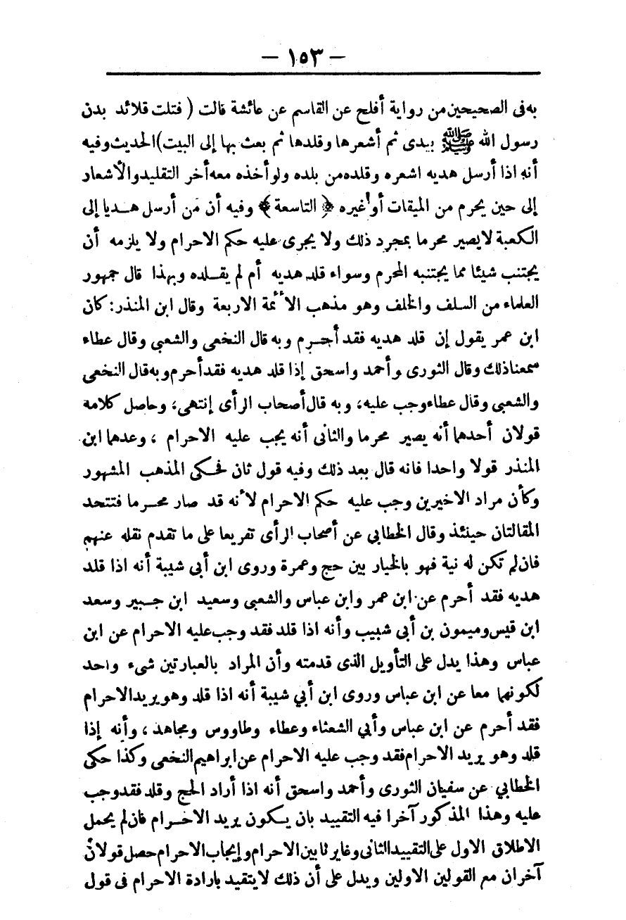 وَحَاصِلُ كَلَامِهِ قَوْلَانِ أَحَدُهُمَا أَنَّهُ يَصِيرُ مُحْرِمًا وَالثَّانِي أَنَّهُ يَجِبُ عَلَيْهِ الْإِحْرَامُ، وَعَدَّهُمَا ابْنُ الْمُنْذِرِ قَوْلًا وَاحِدًا فَإِنَّهُ قَالَ بَعْدَ ذَلِكَ وَفِيهِ قَوْلٌ ثَانٍ فَحَكَى الْمَذْهَبَ الْمَشْهُورَ وَكَأَنَّ مُرَادَ الْأَخِيرَيْنِ وَجَبَ عَلَيْهِ حُكْمُ الْإِحْرَامِ لِأَنَّهُ قَدْ صَارَ مُحْرِمًا فَتَتَّحِدَ الْمَقَالَتَانِ حِينَئِذٍ وَقَالَ الْخَطَّابِيُّ عَنْ أَصْحَابِ الرَّأْيِ تَفْرِيعًا عَلَى مَا تَقَدَّمَ نَقَلَهُ عَنْهُمْ فَإِنْ لَمْ تَكُنْ لَهُ نِيَّةٌ فَهُوَ بِالْخِيَارِ بَيْنَ حَجٍّ وَعُمْرَةٍ وَرَوَى ابْنُ أَبِي شَيْبَةَ أَنَّهُ إذَا قَلَّدَ هَدْيَهُ فَقَدْ أَحْرَمَ عَنْ ابْنِ عُمَرَ وَابْنِ عَبَّاسٍ وَالشَّعْبِيِّ وَسَعِيدِ بْنِ جُبَيْرٍ وَسَعْدِ بْنُ قَيْسٍ وَمَيْمُونِ بْنُ أَبِي شَبِيبٍ وَأَنَّهُ إذَا قَلَّدَ فَقَدْ وَجَبَ عَلَيْهِ الْإِحْرَامُ عَنْ ابْنِ عَبَّاسٍ وَهَذَا يَدُلُّ عَلَى التَّأْوِيلِ الَّذِي قَدَّمْته وَأَنَّ الْمُرَادَ بِالْعِبَارَتَيْنِ شَيْءٌ وَاحِدٌ لِكَوْنِهِمَا مَعًا عَنْ ابْنِ عَبَّاسٍ وَرَوَى ابْنُ أَبِي شَيْبَةَ أَنَّهُ إذَا قَلَّدَ وَهُوَ يُرِيدُ الْإِحْرَامَ فَقَدْ أَحْرَمَ عَنْ ابْنِ عَبَّاسٍ وَأَبِي الشَّعْثَاءِ وَعَطَاءٍ وَطَاوُسٍ وَمُجَاهِدٍ، وَأَنَّهُ إذَا قَلَّدَ وَهُوَ يُرِيدُ الْإِحْرَامَ فَقَدْ وَجَبَ عَلَيْهِ الْإِحْرَامُ عَنْ إبْرَاهِيمَ النَّخَعِيّ وَكَذَا حَكَى الْخَطَّابِيُّ عَنْ سُفْيَانَ الثَّوْرِيِّ وَأَحْمَدَ وَإِسْحَاقَ أَنَّهُ إذَا أَرَادَ الْحَجَّ وَقَلَّدَ فَقَدْ وَجَبَ عَلَيْهِ وَهَذَا الْمَذْكُورُ آخِرًا فِيهِ التَّقْيِيدُ بِأَنْ يَكُونَ يُرِيدُ الْإِحْرَامَ فَإِنْ لَمْ يُحْمَلْ الْإِطْلَاقُ الْأَوَّلُ عَلَى التَّقْيِيدِ الثَّانِي وَغَايَرْنَا بَيْنَ الْإِحْرَامِ وَإِيجَابِ الْإِحْرَامِ حَصَلَ قَوْلَانِ آخَرَانِ مَعَ الْقَوْلَيْنِ الْأَوَّلَيْنِ وَيَدُلُّ عَلَى أَنَّ ذَلِكَ لَا يَتَقَيَّدُ بِإِرَادَةِ الْإِحْرَامِ فِي قَوْلِ