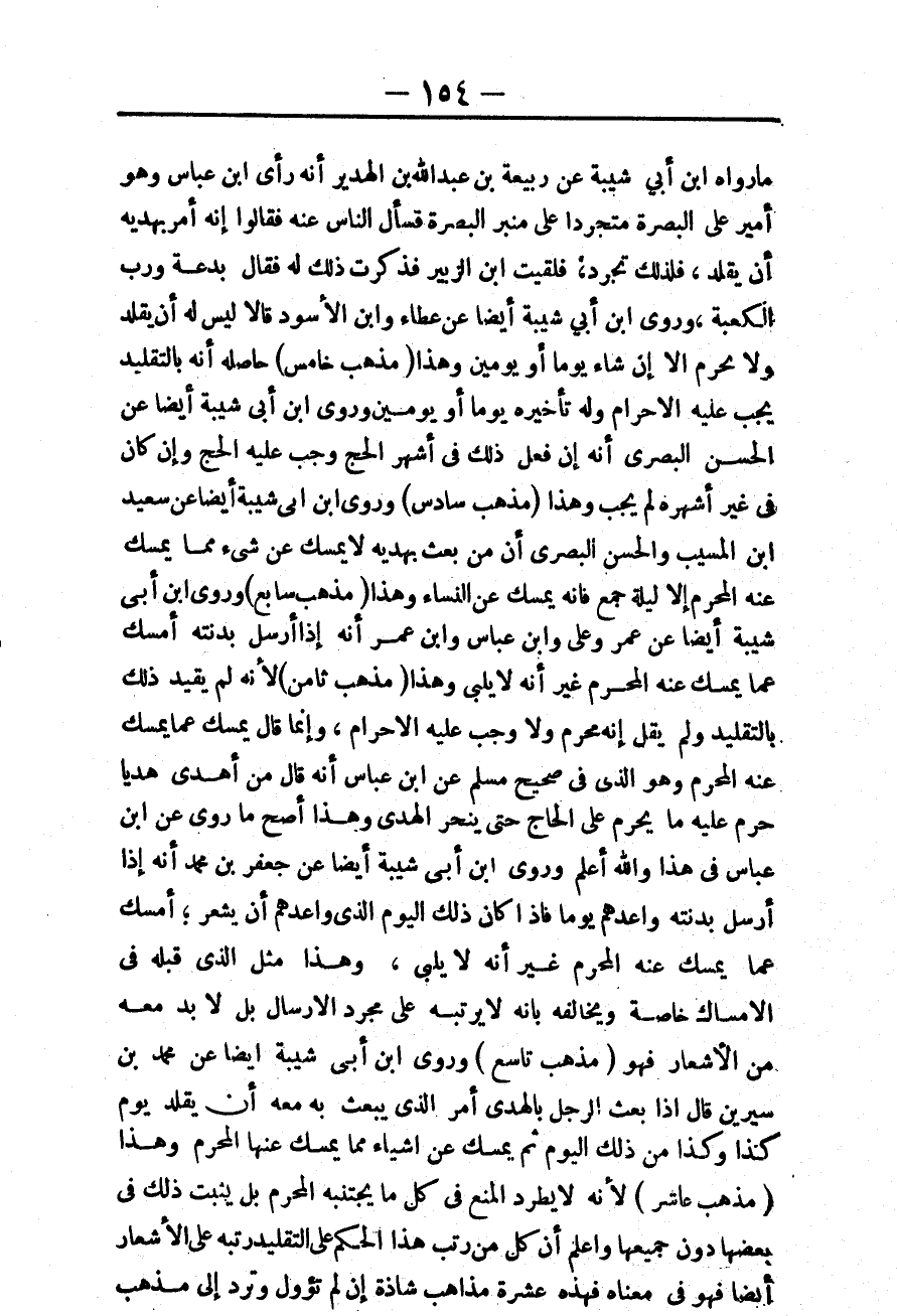 ـــــــــــــــــــــــــــــQمَا رَوَاهُ ابْنُ أَبِي شَيْبَةَ عَنْ رَبِيعَةَ بْنِ عَبْدِ اللَّهِ بْنِ الْهُدَيْرِ أَنَّهُ رَأَى ابْنَ عَبَّاسٍ وَهُوَ أَمِيرٌ عَلَى الْبَصْرَةِ مُتَجَرِّدًا عَلَى مِنْبَرِ الْبَصْرَةِ فَسَأَلَ النَّاسَ عَنْهُ فَقَالُوا إنَّهُ أَمَرَ بِهَدْيِهِ أَنْ يُقَلَّدَ، فَلِذَلِكَ تَجَرَّدَ، فَلَقِيت ابْنَ الزُّبَيْرِ فَذَكَرْت ذَلِكَ لَهُ فَقَالَ بِدْعَةٌ وَرَبِّ الْكَعْبَةِ. وَرَوَى ابْنُ أَبِي شَيْبَةَ أَيْضًا عَنْ عَطَاءٍ وَابْنِ الْأَسْوَدِ قَالَا لَيْسَ لَهُ أَنْ يُقَلِّدَ وَلَا يُحْرِمُ إلَّا إنْ شَاءَ يَوْمًا أَوْ يَوْمَيْنِ وَهَذَا (مَذْهَبٌ خَامِسٌ) حَاصِلُهُ أَنَّهُ بِالتَّقْلِيدِ يَجِبُ عَلَيْهِ الْإِحْرَامُ وَلَهُ تَأْخِيرُهُ يَوْمًا أَوْ يَوْمَيْنِ وَرَوَى ابْنُ أَبِي شَيْبَةَ أَيْضًا عَنْ الْحَسَنِ الْبَصْرِيِّ أَنَّهُ إنْ فَعَلَ ذَلِكَ فِي أَشْهُرِ الْحَجِّ وَجَبَ عَلَيْهِ الْحَجُّ وَإِنْ كَانَ فِي غَيْرِ أَشْهُرِهِ لَمْ يَجِبْ وَهَذَا (مَذْهَبٌ سَادِسٌ) وَرَوَى ابْنُ أَبِي شَيْبَةَ أَيْضًا عَنْ سَعِيدِ بْنِ الْمُسَيِّبِ وَالْحَسَنِ الْبَصْرِيِّ أَنَّ مَنْ بَعَثَ بِهَدْيِهِ لَا يُمْسِكُ عَنْ شَيْءٍ مِمَّا يُمْسِكُ عَنْهُ الْمُحْرِمُ إلَّا لَيْلَةَ جَمْعٍ فَإِنَّهُ يُمْسِكُ عَنْ النِّسَاءِ وَهَذَا (مَذْهَبٌ سَابِعٌ) وَرَوَى ابْنُ أَبِي شَيْبَةَ أَيْضًا عَنْ عُمَرَ وَعَلِيٍّ وَابْنِ عَبَّاسٍ وَابْنِ عُمَرَ أَنَّهُ إذَا أَرْسَلَ بَدَنَتَهُ أَمْسَكَ عَمَّا يُمْسِكُ عَنْهُ الْمُحْرِمُ غَيْرَ أَنَّهُ لَا يُلَبِّي وَهَذَا (مَذْهَبٌ ثَامِنٌ) لِأَنَّهُ لَمْ يُقَيِّدْ ذَلِكَ بِالتَّقْلِيدِ وَلَمْ يَقُلْ إنَّهُ مُحْرِمٌ وَلَا وَجَبَ عَلَيْهِ الْإِحْرَامُ، وَإِنَّمَا قَالَ يُمْسِكُ عَمَّا يُمْسِكُ عَنْهُ الْمُحْرِمُ وَهُوَ الَّذِي فِي صَحِيحِ مُسْلِمٍ عَنْ ابْنِ عَبَّاسٍ أَنَّهُ قَالَ مَنْ أَهْدَى هَدْيًا حَرُمَ عَلَيْهِ مَا يَحْرُمُ عَلَى الْحَاجِّ حَتَّى يَنْحَرَ الْهَدْيَ وَهَذَا أَصَحُّ مَا رُوِيَ عَنْ ابْنِ عَبَّاسٍ فِي هَذَا وَاَللَّهُ أَعْلَمُ.