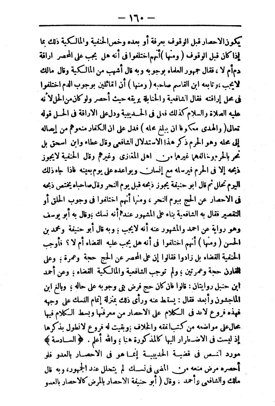 ـــــــــــــــــــــــــــــQيَكُونَ الْإِحْصَارُ قَبْلَ الْوُقُوفِ بِعَرَفَةَ أَوْ بَعْدَهُ وَخَصَّ الْحَنَفِيَّةُ وَالْمَالِكِيَّةُ ذَلِكَ بِمَا إذَا كَانَ قَبْلَ الْوُقُوفِ (وَمِنْهَا) أَنَّهُمْ اخْتَلَفُوا فِي أَنَّهُ هَلْ يَجِبُ عَلَى الْمُحْصَرِ إرَاقَةُ دَمٍ أَمْ لَا، فَقَالَ جُمْهُورُ الْعُلَمَاءِ بِوُجُوبِهِ وَبِهِ قَالَ أَشْهَبُ مِنْ الْمَالِكِيَّةِ وَقَالَ مَالِكٌ لَا يَجِبُ، وَتَابَعَهُ ابْنُ الْقَاسِمِ صَاحِبُهُ (وَمِنْهَا) أَنَّ الْقَائِلِينَ بِوُجُوبِ الدَّمِ اخْتَلَفُوا فِي مَحَلِّ إرَاقَتِهِ فَقَالَ الشَّافِعِيَّةُ وَالْحَنَابِلَةُ يُرِيقُهُ حَيْثُ أُحْصِرَ وَلَوْ كَانَ مِنْ الْحِلِّ لِأَنَّهُ - عَلَيْهِ الصَّلَاةُ وَالسَّلَامُ - كَذَلِكَ فَعَلَ فِي الْحُدَيْبِيَةِ وَدَلَّ عَلَى الْإِرَاقَةِ فِي الْحِلِّ قَوْله تَعَالَى {وَالْهَدْيَ مَعْكُوفًا أَنْ يَبْلُغَ مَحِلَّهُ} [الفتح: 25] فَدَلَّ عَلَى أَنَّ الْكُفَّارَ مَنَعُوهُمْ مِنْ إيصَالِهِ إلَى مَحِلِّهِ وَهُوَ الْحَرَمُ ذَكَرَ هَذَا الِاسْتِدْلَالَ الشَّافِعِيُّ وَقَالَ عَطَاءٌ وَابْنُ إِسْحَاقَ بَلْ نَحَرَ بِالْحَرَمِ وَخَالَفَهُمَا غَيْرُهُمَا مِنْ أَهْلِ الْمَغَازِي وَغَيْرِهِمْ وَقَالَ الْحَنَفِيَّةُ لَا يَجُوزُ ذَبْحُهُ إلَّا فِي الْحَرَمِ فَيُرْسِلُهُ مَعَ إنْسَانٍ وَيُوَاعِدُهُ عَلَى يَوْمٍ بِعَيْنِهِ فَإِذَا جَاءَ ذَلِكَ الْيَوْمُ تَحَلَّلَ ثُمَّ قَالَ أَبُو حَنِيفَةَ يَجُوزُ ذَبْحُهُ قَبْلَ يَوْمِ النَّحْرِ وَقَالَ صَاحِبَاهُ يَخْتَصُّ ذَبْحُهُ فِي الْإِحْصَارِ عَنْ الْحَجِّ بِيَوْمِ النَّحْرِ، وَمِنْهَا أَنَّهُمْ اخْتَلَفُوا فِي وُجُوبِ الْحَلْقِ أَوْ التَّقْصِيرِ فَقَالَ بِهِ الشَّافِعِيَّةُ بِنَاءً عَلَى الْمَشْهُورِ عِنْدَهُمْ أَنَّهُ نُسُكٌ؛ وَقَالَ بِهِ أَبُو يُوسُفَ وَهُوَ رِوَايَةٌ عَنْ أَحْمَدَ وَالْمَشْهُورُ عَنْهُ أَنَّهُ لَا يَجِبُ؛ وَبِهِ قَالَ أَبُو حَنِيفَةَ وَمُحَمَّدُ بْنُ الْحَسَنِ (وَمِنْهَا) أَنَّهُمْ اخْتَلَفُوا فِي أَنَّهُ هَلْ يَجِبُ عَلَيْهِ الْقَضَاءُ أَمْ لَا؟ فَأَوْجَبَ الْحَنَفِيَّةُ الْقَضَاءَ بَلْ زَادُوا فَقَالُوا إنَّ عَلَى الْمُحْصَرِ عَنْ الْحَجِّ حَجَّةً وَعُمْرَةً؛ وَعَلَى الْقَارِنِ حَجَّةً وَعُمْرَتَيْنِ؛ وَلَمْ تُوجِبْ الشَّافِعِيَّةُ وَالْمَالِكِيَّةُ الْقَضَاءَ؛ وَعَنْ أَحْمَدَ بْنِ حَنْبَلٍ رِوَايَتَانِ: قَالُوا فَإِنْ كَانَ حَجَّ فَرْضٍ بَقِيَ وُجُوبُهُ عَلَى حَالِهِ؛ وَبَالَغَ ابْنُ الْمَاجِشُونِ وَأَبْعَدَ فَقَالَ: يَسْقُطُ عَنْهُ وَرَأَى ذَلِكَ بِمَنْزِلَةِ إتْمَامِ النُّسُكِ عَلَى وَجْهِهِ فَهَذِهِ فُرُوعٌ لَا بُدَّ فِي الْكَلَامِ عَلَى الْإِحْصَارِ مِنْ مَعْرِفَتِهَا وَبَسْطُ الْكَلَامِ فِيهَا مُحَالٌ عَلَى مَوَاضِعِهِ مِنْ كُتُبِ الْفِقْهِ وَالْخِلَافِ؛ وَبَقِيَتْ لَهُ فُرُوعٌ لَا نُطَوِّلُ بِذِكْرِهَا إذْ لَيْسَتْ فِي الِاضْطِرَارِ إلَيْهَا كَالْمَذْكُورَةِ هُنَا؛ وَاَللَّهُ أَعْلَمُ.