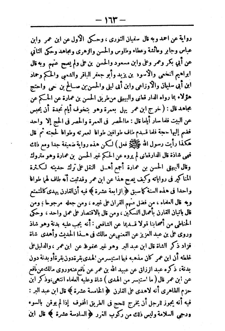 ـــــــــــــــــــــــــــــQرِوَايَةٌ عَنْ أَحْمَدَ وَبِهِ قَالَ سُفْيَانُ الثَّوْرِيُّ، وَحُكِيَ الْأَوَّلَ عَنْ ابْنِ عُمَرَ وَابْنِ عَبَّاسٍ وَجَابِرٍ وَعَائِشَةَ وَعَطَاءٍ وَطَاوُسٍ وَالْحَسَنِ وَالزُّهْرِيِّ وَمُجَاهِدٍ وَحُكِيَ الثَّانِيَ عَنْ أَبِي بَكْرٍ وَعُمَرَ وَعَلِيٍّ وَابْنِ مَسْعُودٍ وَالْحَسَنِ بْنِ عَلِيٍّ وَلَمْ يَصِحَّ عَنْهُمْ وَبِهِ قَالَ إبْرَاهِيمُ النَّخَعِيّ وَالْأَسْوَدُ بْنُ يَزِيدَ وَأَبُو جَعْفَرٍ الْبَاقِرُ وَالشَّعْبِيُّ وَالْحَكَمُ وَحَمَّادُ بْنُ أَبِي سُلَيْمَانَ وَالْأَوْزَاعِيِّ وَابْنُ أَبِي لَيْلَى وَالْحَسَنُ بْنُ صَالِحِ بْنِ حَيٍّ وَاحْتَجَّ هَؤُلَاءِ بِمَا رَوَاهُ الدَّارَقُطْنِيُّ وَالْبَيْهَقِيُّ مِنْ طَرِيقِ الْحَسَنِ بْنِ عُمَارَةَ عَنْ الْحَكَمِ عَنْ مُجَاهِدٍ قَالَ: «خَرَجَ ابْنُ عُمَرَ يُهِلُّ بِعُمْرَةٍ وَهُوَ بِتَخَوُّفِ أَيَّامِ نَجْدَةَ أَنْ يُحْبَسَ عَنْ الْبَيْتِ فَلَمَّا سَارَ أَيَّامًا قَالَ: مَا الْحَصْرُ فِي الْعُمْرَةِ وَالْحَصْرُ فِي الْحَجِّ إلَّا وَاحِدٌ فَضَمَّ إلَيْهَا حَجَّةً فَلَمَّا قَدِمَ طَافَ طَوَافَيْنِ طَوَافًا لِعُمْرَتِهِ وَطَوَافًا لِحَجَّتِهِ ثُمَّ قَالَ هَكَذَا رَأَيْت رَسُولَ اللَّهِ - صَلَّى اللَّهُ عَلَيْهِ وَسَلَّمَ - فَعَلَ» لَكِنَّ هَذِهِ رِوَايَةٌ ضَعِيفَةٌ جِدًّا وَمَعَ ذَلِكَ فَهِيَ شَاذَّةٌ قَالَ الدَّارَقُطْنِيُّ لَمْ يَرَوْهُ عَنْ الْحَكَمِ غَيْرُ الْحَسَنِ بْنِ عُمَارَةَ وَهُوَ مَتْرُوكٌ وَقَالَ الْبَيْهَقِيُّ الْحَسَنُ بْنُ عُمَارَةَ أَجْمَعَ أَهْلُ النَّقْلِ عَلَى تَرْكِ حَدِيثِهِ لِكَثْرَةِ الْمَنَاكِيرِ فِي رِوَايَاتِهِ وَكَيْفَ يَصِحُّ هَذَا عَنْ ابْنِ عُمَرَ وَقَدْ ثَبَتَ أَنَّهُ طَافَ لَهُمَا طَوَافًا وَاحِدًا فِي هَذِهِ السَّنَةِ كَمَا سَبَقَ