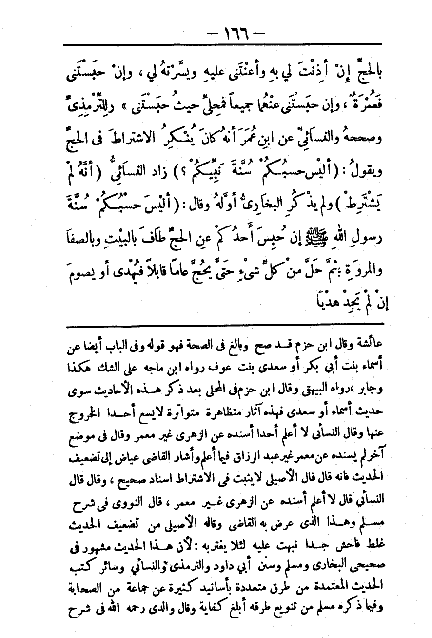«عَنْ ابْنِ عُمَرَ أَنَّهُ كَانَ يُنْكِرُ الِاشْتِرَاطَ فِي الْحَجِّ وَيَقُولُ: أَلَيْسَ حَسْبُكُمْ سُنَّةَ نَبِيِّكُمْ؟» زَادَ النَّسَائِيُّ (أَنَّهُ لَمْ يَشْتَرِطْ) وَلَمْ يَذْكُرْ الْبُخَارِيُّ أَوَّلَهُ وَقَالَ: «أَلَيْسَ حَسْبُكُمْ سُنَّةَ رَسُولِ اللَّهِ - صَلَّى اللَّهُ عَلَيْهِ وَسَلَّمَ - إنْ حُبِسَ أَحَدُكُمْ عَنْ الْحَجِّ طَافَ بِالْبَيْتِ وَبِالصَّفَا وَالْمَرْوَةِ؛ ثُمَّ حَلَّ مِنْ كُلِّ شَيْءٍ حَتَّى يَحُجَّ عَامًا قَابِلًا فَيُهْدِي أَوْ يَصُومَ إنْ لَمْ يَجِدْ هَدْيًا» ..