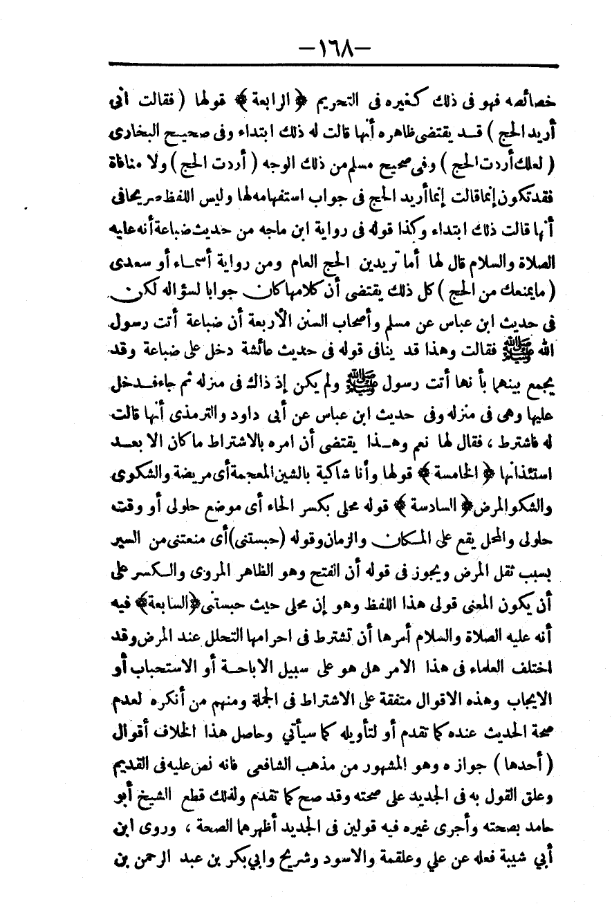 (الرَّابِعَةُ) قَوْلُهَا «فَقَالَتْ إنِّي أُرِيدُ الْحَجَّ» قَدْ يَقْتَضِي ظَاهِرُهُ أَنَّهَا قَالَتْ لَهُ ذَلِكَ ابْتِدَاءً وَفِي صَحِيحِ الْبُخَارِيِّ «لَعَلَّكِ أَرَدْتِ الْحَجَّ» وَفِي صَحِيحِ مُسْلِمٍ مِنْ ذَلِكَ الْوَجْهِ (أَرَدْتُ الْحَجَّ) وَلَا مُنَافَاةَ فَقَدْ تَكُونُ إنَّمَا قَالَتْ إنَّمَا أُرِيدُ الْحَجَّ فِي جَوَابِ اسْتِفْهَامِهِ لَهَا وَلَيْسَ اللَّفْظُ صَرِيحًا فِي أَنَّهَا قَالَتْ ذَلِكَ ابْتِدَاءً وَكَذَا قَوْلُهُ فِي رِوَايَةِ ابْنِ مَاجَهْ مِنْ حَدِيثِ ضُبَاعَةَ «أَنَّهُ - عَلَيْهِ الصَّلَاةُ وَالسَّلَامُ - قَالَ لَهَا أَمَا تُرِيدِينَ الْحَجَّ الْعَامَ» وَمِنْ رِوَايَةِ أَسْمَاءَ أَوْ سُعْدَى «مَا يَمْنَعُكِ مِنْ الْحَجِّ» كُلُّ ذَلِكَ يَقْتَضِي أَنَّ كَلَامَهَا كَانَ جَوَابًا لِسُؤَالِهِ لَكِنْ فِي حَدِيثِ ابْنِ عَبَّاسٍ عَنْ مُسْلِمٍ وَأَصْحَابِ السُّنَنِ الْأَرْبَعَةِ «أَنَّ ضُبَاعَةَ أَتَتْ رَسُولَ اللَّهِ - صَلَّى اللَّهُ عَلَيْهِ وَسَلَّمَ - فَقَالَتْ» وَهَذَا قَدْ يُنَافِي قَوْلَهُ فِي حَدِيثِ عَائِشَةَ «دَخَلَ عَلَى ضُبَاعَةَ» وَقَدْ يُجْمَعُ بَيْنَهُمَا بِأَنَّهَا أَتَتْ رَسُولَ اللَّهِ - صَلَّى اللَّهُ عَلَيْهِ وَسَلَّمَ - وَلَمْ يَكُنْ إذْ ذَاكَ فِي مَنْزِلِهِ ثُمَّ جَاءَ فَدَخَلَ عَلَيْهَا وَهِيَ فِي مَنْزِلِهِ وَفِي حَدِيثِ ابْنِ عَبَّاسٍ عَنْ أَبِي دَاوُد وَالتِّرْمِذِيِّ «أَنَّهَا قَالَتْ لَهُ فَأَشْتَرِطُ، فَقَالَ لَهَا نَعَمْ» وَهَذَا يَقْتَضِي أَنَّ أَمْرَهُ بِالِاشْتِرَاطِ مَا كَانَ إلَّا بَعْدَ اسْتِئْذَانِهَا