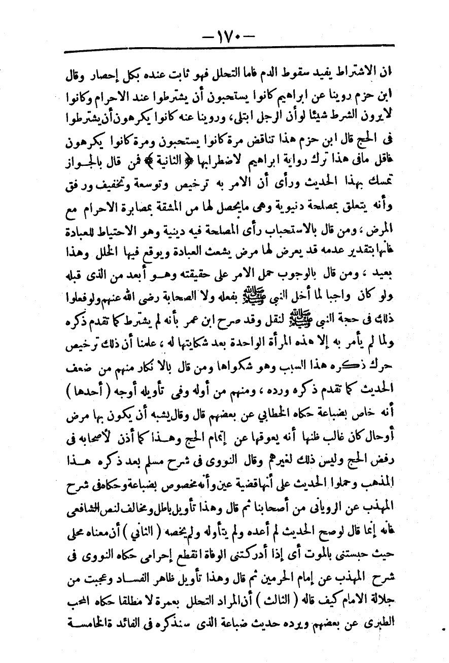 ـــــــــــــــــــــــــــــQأَنَّ الِاشْتِرَاطَ يُفِيدُ سُقُوطَ الدَّمِ فَأَمَّا التَّحَلُّلُ فَهُوَ ثَابِتٌ عِنْدَهُ بِكُلِّ إحْصَارٍ وَقَالَ ابْنُ حَزْمٍ رَوَيْنَا عَنْ إبْرَاهِيمَ كَانُوا يَسْتَحِبُّونَ أَنْ يَشْتَرِطُوا عِنْدَ الْإِحْرَامِ وَكَانُوا لَا يَرَوْنَ الشَّرْطَ شَيْئًا لَوْ أَنَّ الرَّجُلَ اُبْتُلِيَ، وَرَوَيْنَا عَنْهُ كَانُوا يَكْرَهُونَ أَنْ يَشْتَرِطُوا فِي الْحَجِّ قَالَ ابْنُ حَزْمٍ هَذَا تَنَاقُضٌ مَرَّةً كَانُوا يَسْتَحِبُّونَ وَمَرَّةً كَانُوا يَكْرَهُونَ فَأَقَلُّ مَا فِي هَذَا تَرْكُ رِوَايَةِ إبْرَاهِيمَ لِاضْطِرَابِهَا.