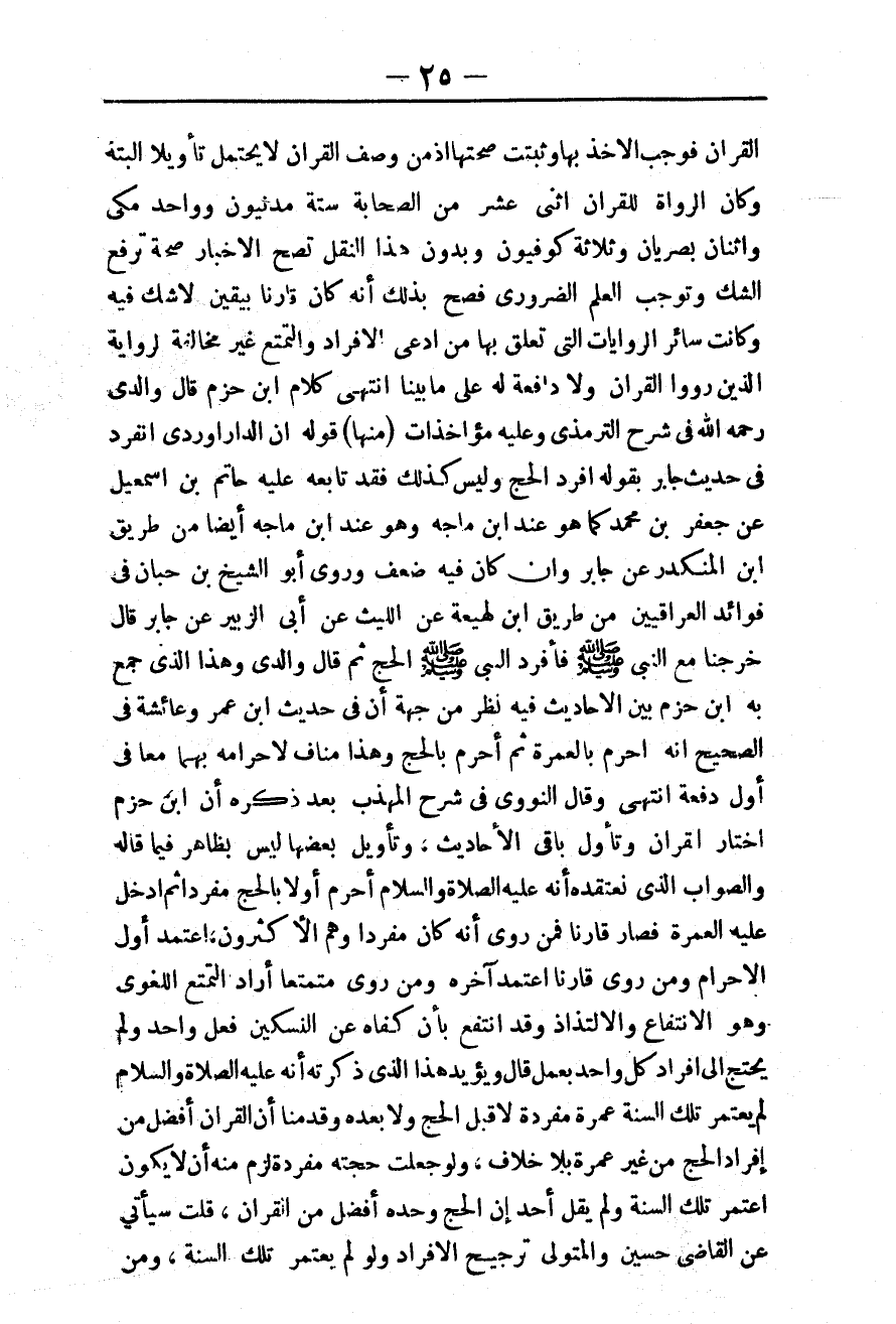 ـــــــــــــــــــــــــــــQالْقِرَانِ فَوَجَبَ الْأَخْذُ بِهَا وَثَبَتَتْ صِحَّتُهَا إذْ مَنْ وَصَفَ الْقِرَانِ لَا يَحْتَمِلُ تَأْوِيلًا أَلْبَتَّةَ وَكَانَ الرُّوَاةُ لِلْقِرَانِ اثْنَيْ عَشَرَ مِنْ الصَّحَابَةِ سِتَّةٌ مَدَنِيُّونَ وَوَاحِدٌ مَكِّيٌّ وَاثْنَانِ بَصْرِيَّانِ وَثَلَاثَةٌ كُوفِيُّونَ وَبِدُونِ هَذَا النَّقْلِ تَصِحُّ الْأَخْبَارُ صِحَّةً تَرْفَعُ الشَّكَّ وَتُوجِبُ الْعِلْمَ الضَّرُورِيَّ فَصَحَّ بِذَلِكَ أَنَّهُ كَانَ قَارِنًا بِيَقِينٍ لَا شَكَّ فِيهِ وَكَانَتْ سَائِرُ الرِّوَايَاتِ الَّتِي تَعَلَّقَ بِهَا مَنْ ادَّعَى الْإِفْرَادَ وَالتَّمَتُّعَ غَيْرَ مُخَالِفَةٍ لِرِوَايَةِ الَّذِينَ رَوَوْا الْقِرَانَ وَلَا دَافِعَةً لَهُ عَلَى مَا بَيَّنَّا انْتَهَى كَلَامُ ابْنِ حَزْمٍ قَالَ وَالِدِي - رَحِمَهُ اللَّهُ - فِي شَرْحِ التِّرْمِذِيِّ وَعَلَيْهِ مُؤَاخَذَاتٌ:
