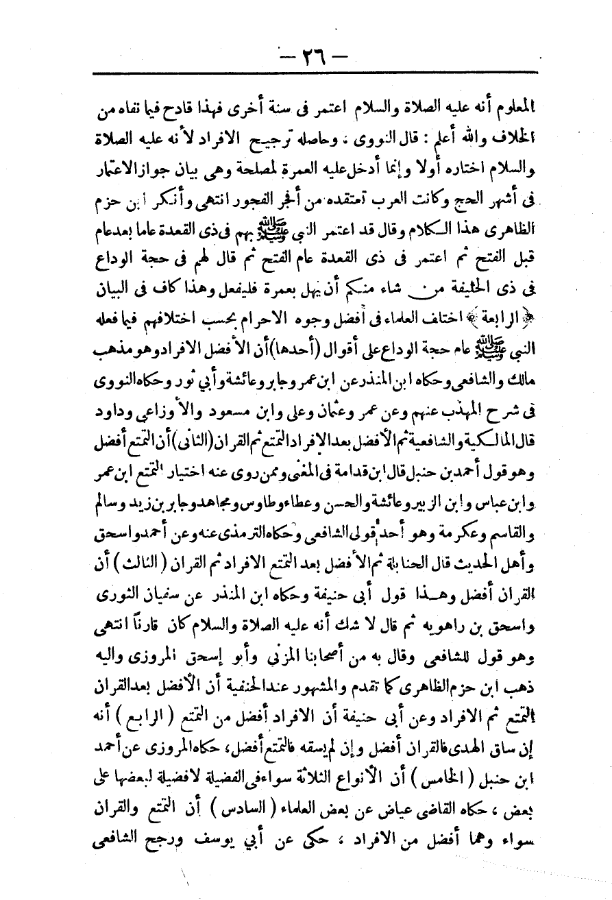 ـــــــــــــــــــــــــــــQالْمَعْلُومِ أَنَّهُ - عَلَيْهِ الصَّلَاةُ وَالسَّلَامُ - اعْتَمَرَ فِي سَنَةٍ أُخْرَى فَهَذَا قَادِحٌ فِيمَا نَفَاهُ مِنْ الْخِلَافِ وَاَللَّهُ أَعْلَمُ: قَالَ النَّوَوِيُّ، وَحَاصِلُهُ تَرْجِيحُ الْإِفْرَادِ لِأَنَّهُ - عَلَيْهِ الصَّلَاةُ وَالسَّلَامُ - اخْتَارَهُ أَوَّلًا وَإِنَّمَا أَدْخَلَ عَلَيْهِ الْعُمْرَةَ لِمَصْلَحَةٍ وَهِيَ بَيَانُ جَوَازِ الِاعْتِمَارِ فِي أَشْهُرِ الْحَجِّ وَكَانَتْ الْعَرَبُ تَعْتَقِدُهُ مِنْ أَفْجَرِ الْفُجُورِ انْتَهَى وَأَنْكَرَ ابْنُ حَزْمٍ الظَّاهِرِيُّ هَذَا الْكَلَامَ. وَقَالَ «قَدْ اعْتَمَرَ النَّبِيُّ - صَلَّى اللَّهُ عَلَيْهِ وَسَلَّمَ - بِهِمْ فِي ذِي الْقَعْدَةِ عَامًا بَعْدَ عَامٍ قَبْلَ الْفَتْحِ ثُمَّ اعْتَمَرَ فِي ذِي الْقَعْدَةِ عَامَ الْفَتْحِ ثُمَّ قَالَ لَهُمْ فِي حَجَّةِ الْوَدَاعِ فِي ذِي الْحُلَيْفَةِ مَنْ شَاءَ مِنْكُمْ أَنْ يُهِلَّ بِعُمْرَةٍ فَلْيَفْعَلْ»