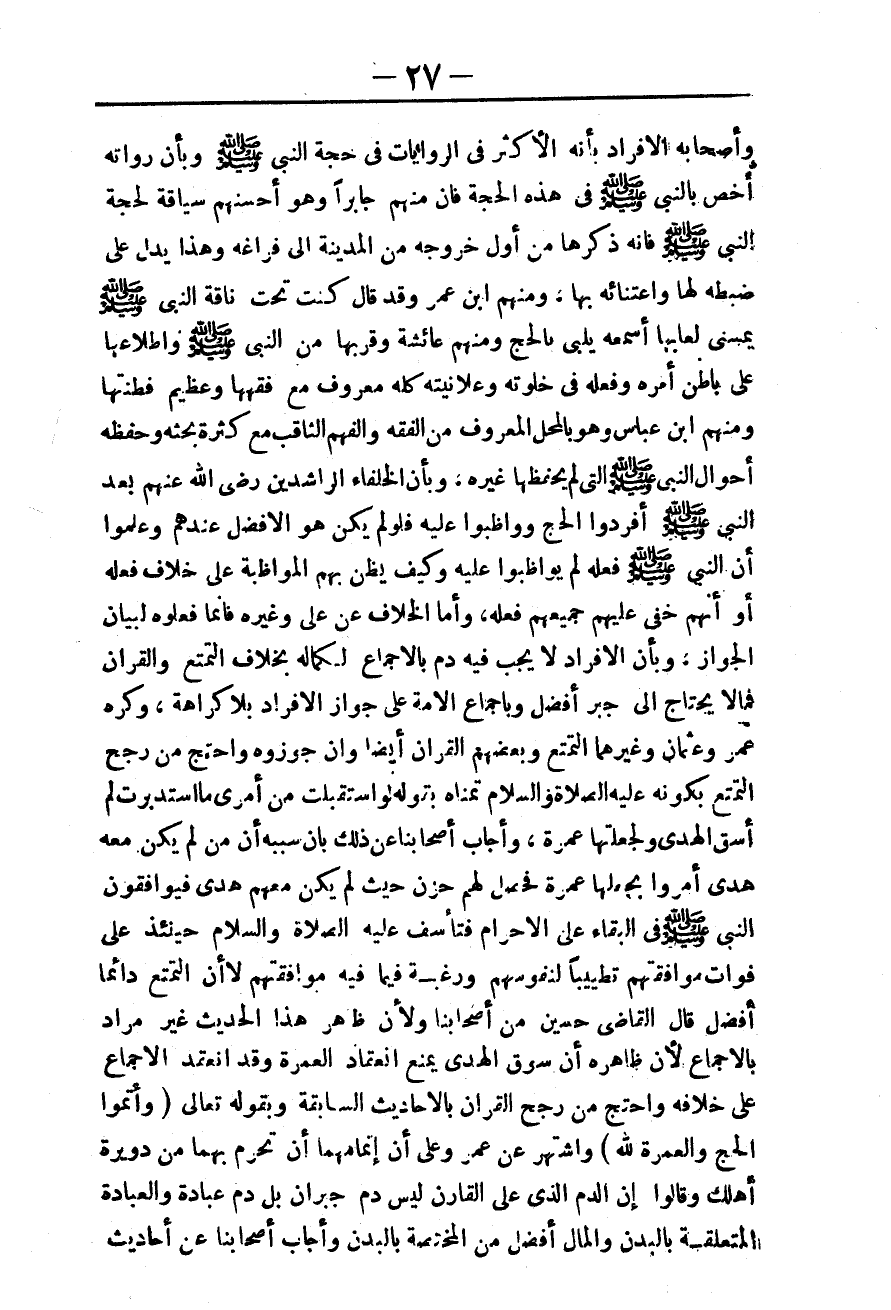 وَمِنْهُمْ عَائِشَةُ وَقُرْبُهَا مِنْ النَّبِيِّ - صَلَّى اللَّهُ عَلَيْهِ وَسَلَّمَ - وَاطِّلَاعُهَا عَلَى بَاطِنِ أَمْرِهِ وَفِعْلِهِ فِي خَلْوَتِهِ وَعَلَانِيَتِهِ كُلُّهُ مَعْرُوفٌ مَعَ فِقْهِهَا وَعَظِيمِ فِطْنَتِهَا وَمِنْهُمْ ابْنُ عَبَّاسٍ وَهُوَ بِالْمَحَلِّ الْمَعْرُوفِ مِنْ الْفِقْهِ وَالْفَهْمِ الثَّاقِبِ مَعَ كَثْرَةِ بَحْثِهِ وَحِفْظِهِ أَحْوَالَ النَّبِيِّ - صَلَّى اللَّهُ عَلَيْهِ وَسَلَّمَ - الَّتِي لَمْ يَحْفَظْهَا غَيْرُهُ، وَبِأَنَّ الْخُلَفَاءَ الرَّاشِدِينَ - رَضِيَ اللَّهُ عَنْهُمْ - بَعْدَ النَّبِيِّ - صَلَّى اللَّهُ عَلَيْهِ وَسَلَّمَ - أَفْرَدُوا الْحَجَّ وَوَاظَبُوا عَلَيْهِ فَلَوْ لَمْ يَكُنْ هُوَ الْأَفْضَلُ عِنْدَهُمْ وَعَلِمُوا أَنَّ النَّبِيَّ - صَلَّى اللَّهُ عَلَيْهِ وَسَلَّمَ - فَعَلَهُ لَمْ يُوَاظِبُوا عَلَيْهِ وَكَيْفَ يُظَنُّ بِهِمْ الْمُوَاظَبَةُ عَلَى خِلَافِ فِعْلِهِ أَوْ أَنَّهُمْ خَفِيَ عَلَيْهِمْ جَمِيعِهِمْ فِعْلُهُ.