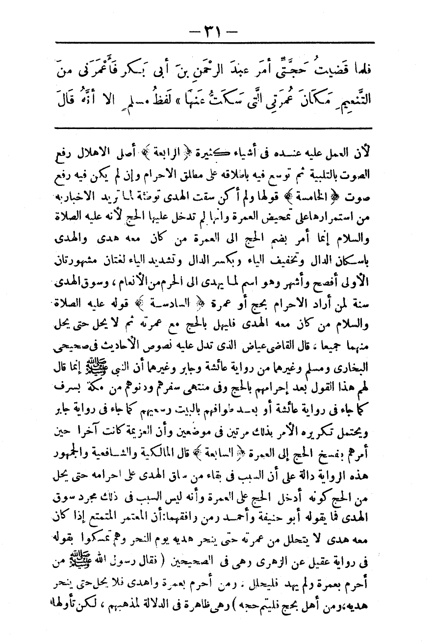 (السَّابِعَةُ) قَالَ الْمَالِكِيَّةُ وَالشَّافِعِيَّةُ وَالْجُمْهُورُ هَذِهِ الرِّوَايَةُ دَالَّةٌ عَلَى أَنَّ السَّبَبَ فِي بَقَاءِ مَنْ سَاقَ الْهَدْيَ عَلَى إحْرَامِهِ حَتَّى يَحِلَّ مِنْ الْحَجِّ كَوْنُهُ أَدْخَلَ الْحَجَّ عَلَى الْعُمْرَةِ وَأَنَّهُ لَيْسَ السَّبَبُ فِي ذَلِكَ مُجَرَّدِ سَوْقِ الْهَدْيِ فَمَا يَقُولُهُ أَبُو حَنِيفَةَ وَأَحْمَدُ وَمَنْ وَافَقَهُمَا: أَنَّ الْمُعْتَمِرَ الْمُتَمَتِّعَ إذَا كَانَ مَعَهُ هَدْيٌ لَا يَتَحَلَّلُ مِنْ عُمْرَتِهِ حَتَّى يَنْحَرَ هَدْيَهُ يَوْمَ النَّحْرِ وَهُمْ تَمَسَّكُوا بِقَوْلِهِ فِي رِوَايَةِ عُقَيْلٍ عَنْ الزُّهْرِيِّ وَهِيَ فِي الصَّحِيحَيْنِ فَقَالَ رَسُولُ اللَّهِ - صَلَّى اللَّهُ عَلَيْهِ وَسَلَّمَ - «مَنْ أَحْرَمَ بِعُمْرَةٍ وَلَمْ يُهْدِ فَلْيَحْلِلْ، وَمَنْ أَحْرَمَ بِعُمْرَةٍ وَأَهْدَى فَلَا يَحِلَّ حَتَّى يَنْحَرَ هَدْيَهُ وَمَنْ أَهَلَّ بِحَجٍّ فَلْيُتِمَّ حَجَّهُ» . وَهِيَ ظَاهِرَةٌ فِي الدَّلَالَةِ لِمَذْهَبِهِمْ، لَكِنْ تَأَوَّلَهَا