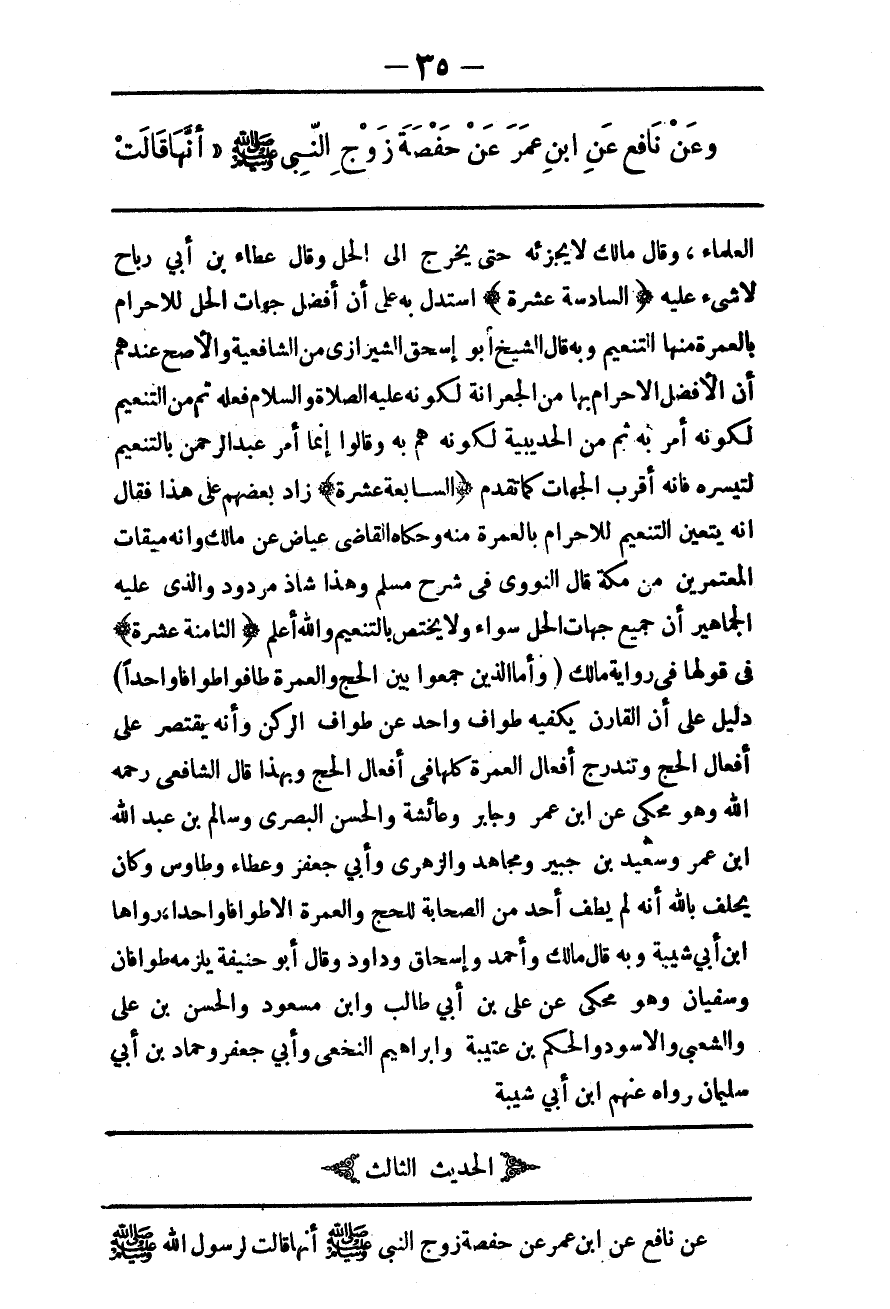 (الْحَدِيثُ الثَّالِثُ) عَنْ نَافِعٍ عَنْ ابْنِ عُمَرَ «عَنْ حَفْصَةَ زَوْجِ النَّبِيِّ - صَلَّى اللَّهُ عَلَيْهِ وَسَلَّمَ - أَنَّهَا قَالَتْ لِرَسُولِ اللَّهِ - صَلَّى اللَّهُ عَلَيْهِ وَسَلَّمَ -