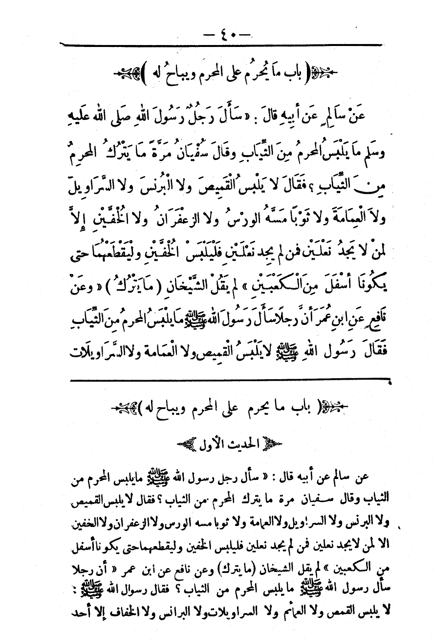 (الْحَدِيثُ الْأَوَّلُ) عَنْ سَالِمٍ عَنْ أَبِيهِ قَالَ: «سَأَلَ رَجُلٌ رَسُولَ اللَّهِ - صَلَّى اللَّهُ عَلَيْهِ وَسَلَّمَ - مَا يَلْبَسُ الْمُحْرِمُ مِنْ الثِّيَابِ وَقَالَ سُفْيَانُ مَرَّةً مَا يَتْرُكُ الْمُحْرِمُ مِنْ الثِّيَابِ؟ فَقَالَ لَا يَلْبَسُ الْقَمِيصَ وَلَا الْبُرْنُسَ وَلَا السَّرَاوِيلَ وَلَا الْعِمَامَةَ وَلَا ثَوْبًا مَسَّهُ الْوَرْسُ وَلَا الزَّعْفَرَانُ وَلَا الْخُفَّيْنِ إلَّا لِمَنْ لَا يَجِدُ نَعْلَيْنِ فَمَنْ لَمْ يَجِدْ نَعْلَيْنِ فَلْيَلْبَسْ الْخُفَّيْنِ وَلْيَقْطَعْهُمَا حَتَّى يَكُونَا أَسْفَلَ مِنْ الْكَعْبَيْنِ» لَمْ يَقُلْ الشَّيْخَانِ «مَا يَتْرُكُ» وَعَنْ نَافِعٍ عَنْ ابْنِ عُمَرَ «أَنَّ رَجُلًا سَأَلَ رَسُولَ اللَّهِ - صَلَّى اللَّهُ عَلَيْهِ وَسَلَّمَ - مَا يَلْبَسُ الْمُحْرِمُ مِنْ الثِّيَابِ؟ فَقَالَ رَسُولُ اللَّهِ - صَلَّى اللَّهُ عَلَيْهِ وَسَلَّمَ - لَا يَلْبَسُ الْقُمُصَ وَلَا الْعَمَائِمَ وَلَا السَّرَاوِيلَاتِ وَلَا الْبَرَانِسَ وَلَا الْخِفَافَ إلَّا أَحَدٌ