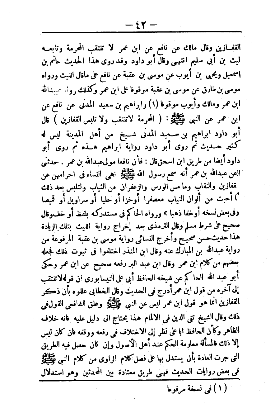 ـــــــــــــــــــــــــــــQالْقُفَّازَيْنِ» وَقَالَ مَالِكٌ عَنْ نَافِعٍ عَنْ ابْنِ عُمَرَ «لَا تَنْتَقِبُ الْمُحْرِمَةُ» وَتَابَعَهُ لَيْثُ بْنُ أَبِي سُلَيْمٍ انْتَهَى وَقَالَ أَبُو دَاوُد وَقَدْ رَوَى هَذَا الْحَدِيثَ حَاتِمُ بْنُ إسْمَاعِيلَ وَيَحْيَى بْنُ أَيُّوبَ عَنْ مُوسَى بْنِ عُقْبَةَ عَنْ نَافِعٍ عَلَى مَا قَالَ اللَّيْثُ وَرَوَاهُ مُوسَى بْنُ طَارِقٍ عَنْ مُوسَى بْنِ عُقْبَةَ مَوْقُوفًا عَلَى ابْنِ عُمَرَ وَكَذَلِكَ رَوَاهُ عُبَيْدُ اللَّهِ بْنُ عُمَرَ وَمَالِكٌ وَأَيُّوبُ مَوْقُوفًا وَإِبْرَاهِيمُ بْنُ سَعِيدٍ الْمَدَنِيِّ عَنْ نَافِعٍ عَنْ ابْنِ عُمَرَ عَنْ النَّبِيِّ - صَلَّى اللَّهُ عَلَيْهِ وَسَلَّمَ -: «الْمُحْرِمَةُ لَا تَنْتَقِبُ وَلَا تَلْبَسُ الْقُفَّازَيْنِ» قَالَ أَبُو دَاوُد إبْرَاهِيمُ بْنُ سَعِيدٍ الْمَدَنِيُّ شَيْخٌ مِنْ أَهْلِ الْمَدِينَةِ لَيْسَ لَهُ كَثِيرُ حَدِيثٍ ثُمَّ رَوَى أَبُو دَاوُد رِوَايَةَ إبْرَاهِيمَ هَذِهِ ثُمَّ رَوَى أَبُو دَاوُد أَيْضًا مِنْ طَرِيقِ ابْنِ إِسْحَاقَ قَالَ: فَإِنَّ نَافِعًا مَوْلَى عَبْدِ اللَّهِ بْنِ عُمَرَ، حَدَّثَنِي عَنْ عَبْدِ اللَّهِ بْنِ عُمَرَ أَنَّهُ سَمِعَ رَسُولَ اللَّهِ - صَلَّى اللَّهُ عَلَيْهِ وَسَلَّمَ - «نَهَى النِّسَاءَ فِي إحْرَامِهِنَّ عَنْ الْقُفَّازَيْنِ وَالنِّقَابِ وَمَا مَسَّ الْوَرْسَ وَالزَّعْفَرَانَ مِنْ الثِّيَابِ وَلْتَلْبَسْ بَعْدَ ذَلِكَ مَا أَحَبَّتْ مِنْ أَلْوَانِ الثِّيَابِ مُعَصْفَرًا أَوْ خَزًّا أَوْ حُلِيًّا أَوْ سَرَاوِيلَ أَوْ قَمِيصًا» وَفِي بَعْضِ نُسَخِهِ «أَوْ خُفًّا ذَهَبًا» وَرَوَاهُ الْحَاكِمُ فِي مُسْتَدْرَكِهِ بِلَفْظِ «أَوْ خُفٍّ» وَقَالَ صَحِيحٌ عَلَى شَرْطِ مُسْلِمٍ وَقَالَ التِّرْمِذِيُّ بَعْدَ إخْرَاجِ رِوَايَةِ اللَّيْثِ بِتِلْكَ الزِّيَادَةِ هَذَا حَدِيثٌ حَسَنٌ صَحِيحٌ وَأَخْرَجَ النَّسَائِيّ رِوَايَةَ مُوسَى بْنِ عُقْبَةَ الْمَرْفُوعَةَ مِنْ رِوَايَةِ عَبْدِ اللَّهِ بْنِ الْمُبَارَكِ عَنْهُ وَقَالَ ابْنُ الْمُنْذِرِ اخْتَلَفُوا فِي ثُبُوتِ ذَلِكَ فَجَعَلَهُ بَعْضُهُمْ مِنْ كَلَامِ ابْنِ عُمَرَ وَقَالَ ابْنُ عَبْدِ الْبَرِّ رَفَعَهُ صَحِيحٌ عَنْ ابْنِ عُمَرَ وَحَكَى أَبُو عَبْدِ اللَّهِ الْحَاكِمُ عَنْ شَيْخِهِ الْحَافِظِ أَبِي عَلِيٍّ النَّيْسَابُورِيِّ أَنَّ قَوْلَهُ لَا تَنْتَقِبُ إلَى آخِره مِنْ قَوْلِ ابْنِ عُمَرَ أُدْرِجَ فِي الْحَدِيثِ وَقَالَ الْخَطَّابِيُّ عَلَّلُوهُ بِأَنَّ ذِكْرَ الْقُفَّازَيْنِ إنَّمَا هُوَ قَوْلُ ابْنِ عُمَرَ لَيْسَ عَنْ النَّبِيِّ - صَلَّى اللَّهُ عَلَيْهِ وَسَلَّمَ - وَعَلَّقَ الشَّافِعِيُّ الْقَوْلَ فِي ذَلِكَ وَقَالَ الشَّيْخُ تَقِيُّ الدِّينِ فِي الْإِلْمَامِ هَذَا يَحْتَاجُ إلَى دَلِيلٍ عَلَيْهِ فَإِنَّهُ خِلَافُ الظَّاهِرِ وَكَأَنَّ الْحَافِظَ أَبَا عَلِيٍّ نَظَرَ إلَى الِاخْتِلَافِ فِي رَفْعِهِ وَوَقْفِهِ فَإِنْ كَانَ لَيْسَ إلَّا ذَلِكَ فَالْمَسْأَلَةُ مَعْلُومَةُ الْحُكْمِ عِنْدَ أَهْلِ الْأُصُولِ وَإِنْ كَانَ حَصَلَ فِيهِ الطَّرِيقُ الَّتِي جَرَتْ الْعَادَةُ بِأَنْ يُسْتَدَلَّ بِهَا عَلَى فَصْلِ كَلَامِ الرَّاوِي مِنْ كَلَامِ النَّبِيِّ - صَلَّى اللَّهُ عَلَيْهِ وَسَلَّمَ - فِي بَعْضِ رِوَايَاتِ الْحَدِيثِ فَهِيَ طَرِيقٌ مُعْتَدَّةٌ بَيْنَ الْمُحَدِّثِينَ وَهُوَ اسْتِدْلَالٌ