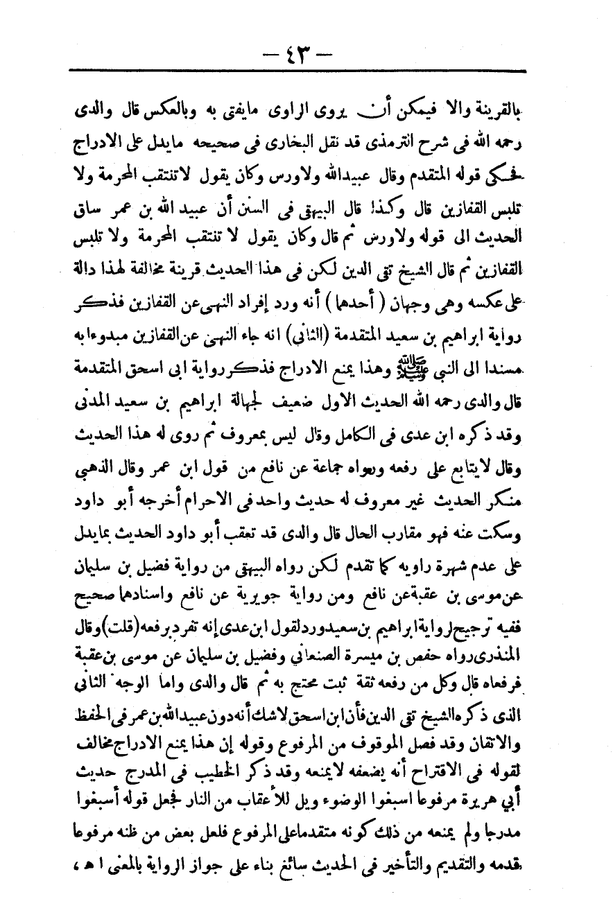 (الثَّانِي) أَنَّهُ جَاءَ النَّهْيُ عَنْ الْقُفَّازَيْنِ مَبْدُوءًا بِهِ مُسْنَدًا إلَى النَّبِيِّ - صَلَّى اللَّهُ عَلَيْهِ وَسَلَّمَ - وَهَذَا يَمْنَعُ الْإِدْرَاجَ فَذَكَرَ رِوَايَةَ أَبِي إِسْحَاقَ الْمُتَقَدِّمَةَ قَالَ وَالِدِي - رَحِمَهُ اللَّهُ - الْحَدِيثُ الْأَوَّلُ ضَعِيفٌ لِجَهَالَةِ إبْرَاهِيمَ بْنِ سَعِيدٍ الْمَدَنِيِّ وَقَدْ ذَكَرَهُ ابْنُ عَدِيٍّ فِي الْكَامِلِ وَقَالَ لَيْسَ بِمَعْرُوفٍ ثُمَّ رَوَى لَهُ هَذَا الْحَدِيثَ وَقَالَ لَا يُتَابِعُ عَلَى رَفْعِهِ رَوَاهُ جَمَاعَةٌ عَنْ نَافِعٍ مِنْ قَوْلِ ابْنِ عُمَرَ وَقَالَ الذَّهَبِيُّ مُنْكَرُ الْحَدِيثِ غَيْرُ مَعْرُوفٍ لَهُ حَدِيثٌ وَاحِدٌ فِي الْإِحْرَامِ أَخْرَجَهُ أَبُو دَاوُد وَسَكَتَ عَنْهُ فَهُوَ مُقَارِبُ الْحَالِ قَالَ وَالِدِي قَدْ تَعَقَّبَ أَبُو دَاوُد الْحَدِيث بِمَا يَدُلُّ عَلَى عَدَمِ شُهْرَةِ رِوَايَةٍ كَمَا تَقَدَّمَ لَكِنْ رَوَاهُ الْبَيْهَقِيُّ مِنْ رِوَايَةِ فُضَيْلٍ بْنِ سُلَيْمَانَ عَنْ مُوسَى بْنِ عُقْبَةَ عَنْ نَافِعٍ وَمِنْ رِوَايَةِ جُوَيْرِيَةَ عَنْ نَافِعٍ وَإِسْنَادُهُمَا صَحِيحٌ فَفِيهِ تَرْجِيحٌ لِرِوَايَةِ إبْرَاهِيمَ بْنِ سَعِيدٍ وَرَدٌّ لِقَوْلِ ابْنِ عَدِيٍّ إنَّهُ تَفَرَّدَ بِرَفْعِهِ (قُلْت) وَقَالَ الْمُنْذِرِيُّ رَوَاهُ حَفْصُ بْنُ مَيْسَرَةَ الصَّنْعَانِيُّ وَفُضَيْلُ بْنُ سُلَيْمَانَ عَنْ مُوسَى بْنِ عُقْبَةَ فَرَفَعَاهُ قَالَ وَكُلُّ مَنْ رَفَعَهُ ثِقَةٌ ثَبْتٌ مُحْتَجٌّ بِهِ ثُمَّ قَالَ وَالِدِي وَأَمَّا الْوَجْهُ الثَّانِي الَّذِي ذَكَرَهُ الشَّيْخُ تَقِيُّ الدِّينِ فَإِنَّ ابْنَ إِسْحَاقَ لَا شَكَّ أَنَّهُ دُونَ عُبَيْدِ اللَّهِ بْنِ عُمَرَ فِي الْحِفْظِ وَالْإِتْقَانِ وَقَدْ فَصَلَ الْمَوْقُوفَ مِنْ الْمَرْفُوعِ وَقَوْلُهُ إنَّ هَذَا يَمْنَعُ الْإِدْرَاجَ مُخَالِفٌ لِقَوْلِهِ فِي الِاقْتِرَاحِ أَنَّهُ يُضَعِّفُهُ لَا يَمْنَعُهُ وَقَدْ ذَكَرَ الْخَطِيبُ فِي الْمَدْرَجِ حَدِيثَ أَبِي هُرَيْرَةَ مَرْفُوعًا «أَسْبِغُوا الْوُضُوءَ وَيْلٌ لِلْأَعْقَابِ مِنْ النَّارِ» فَجَعَلَ قَوْلَهُ أَسْبِغُوا مُدْرَجًا وَلَمْ يَمْنَعْهُ مِنْ ذَلِكَ كَوْنُهُ مُتَقَدِّمًا عَلَى الْمَرْفُوعِ فَلَعَلَّ بَعْضَ مَنْ ظَنَّهُ مَرْفُوعًا قَدَّمَهُ وَالتَّقْدِيمُ وَالتَّأْخِيرُ فِي الْحَدِيثِ سَائِغٌ بِنَاءً عَلَى جَوَازِ الرِّوَايَةِ بِالْمَعْنَى اهـ