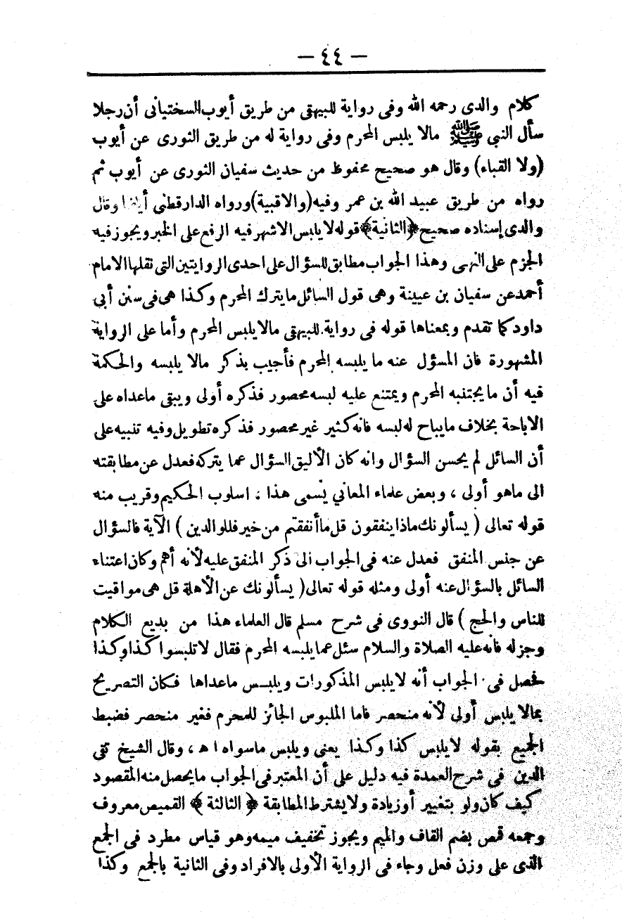 ـــــــــــــــــــــــــــــQكَلَامُ وَالِدِي - رَحِمَهُ اللَّهُ - وَفِي رِوَايَةٍ لِلْبَيْهَقِيِّ مِنْ طَرِيقِ أَيُّوبَ السِّخْتِيَانِيُّ «أَنَّ رَجُلًا سَأَلَ النَّبِيَّ - صَلَّى اللَّهُ عَلَيْهِ وَسَلَّمَ - مَا لَا يَلْبَسُ الْمُحْرِمُ» وَفِي رِوَايَةٍ لَهُ مِنْ طَرِيقِ الثَّوْرِيِّ عَنْ أَيُّوبَ «وَلَا الْقَبَاءَ» وَقَالَ هُوَ صَحِيحٌ مَحْفُوظٌ مِنْ حَدِيثِ سُفْيَانَ الثَّوْرِيِّ عَنْ أَيُّوبَ ثُمَّ رَوَاهُ مِنْ طَرِيق عُبَيْدِ اللَّهِ بْنِ عُمَرَ وَفِيهِ «وَالْأَقْبِيَةَ» .
