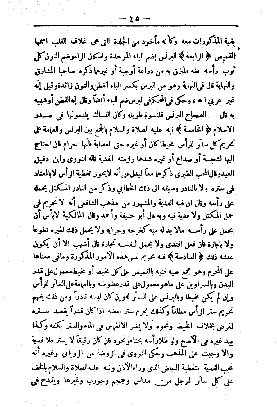 (السَّادِسَةُ) فِيهِ تَحْرِيمُ لُبْسِ هَذِهِ الْأُمُورِ الْمَذْكُورَةِ وَمَا فِي مَعْنَاهَا عَلَى الْمُحْرِمِ وَهُوَ مُجْمَع عَلَيْهِ فَنَبَّهَ بِالْقَمِيصِ عَلَى كُلِّ مَخِيطٍ أَوْ مُحِيطٍ مَعْمُولٍ عَلَى قَدْرِ الْبَدَنِ وَبِالسَّرَاوِيلِ عَلَى مَا هُوَ مَعْمُولٌ عَلَى قَدْرِ عُضْوٍ مِنْهُ وَبِالْعِمَامَةِ عَلَى السَّاتِرِ لِلرَّأْسِ وَإِنْ لَمْ يَكُنْ مَخِيطًا وَبِالْبُرْنُسِ عَلَى السَّاتِرِ لَهُ وَإِنْ كَانَ لُبْسُهُ نَادِرًا وَمِنْ ذَلِكَ يُفْهَمُ تَحْرِيمُ سَتْرِ الرَّأْسِ مُطْلَقًا وَكَذَلِكَ يَحْرُمُ سَتْرُ بَعْضِهِ إذَا كَانَ قَدْرًا يَقْصِدُ سَتْرَهُ لِغَرَضٍ بِخِلَافِ الْخَيْطِ وَنَحْوِهِ وَلَا يَضُرُّ الِانْغِمَاسُ فِي الْمَاءِ وَالسَّتْرُ بِكَفِّهِ وَكَذَا بِيَدِ غَيْرِهِ فِي الْأَصَحِّ وَلَوْ طَلًا رَأْسَهُ بِحِنَّاءٍ وَنَحْوِهِ فَإِنْ كَانَ رَقِيقًا لَا يَسْتُرُ فَلَا فِدْيَةَ وَإِلَّا وَجَبَتْ عَلَى الْمَذْهَبِ وَحَكَى النَّوَوِيُّ فِي الرَّوْضَةِ عَنْ الرُّويَانِيِّ وَغَيْرِهِ أَنَّهُ تَجِبُ الْفِدْيَةُ بِتَغْطِيَةِ الْبَيَاضِ الَّذِي وَرَاءَ الْأُذُنِ وَنَبَّهَ - عَلَيْهِ الصَّلَاةُ وَالسَّلَامُ - بِالْخُفِّ عَلَى كُلِّ سَاتِرٍ لِلرِّجْلِ مِنْ مَدَاسٍ وَجُمْجُمٍ وَجَوْرَبٍ وَغَيْرِهَا وَيَقْدَحُ فِي