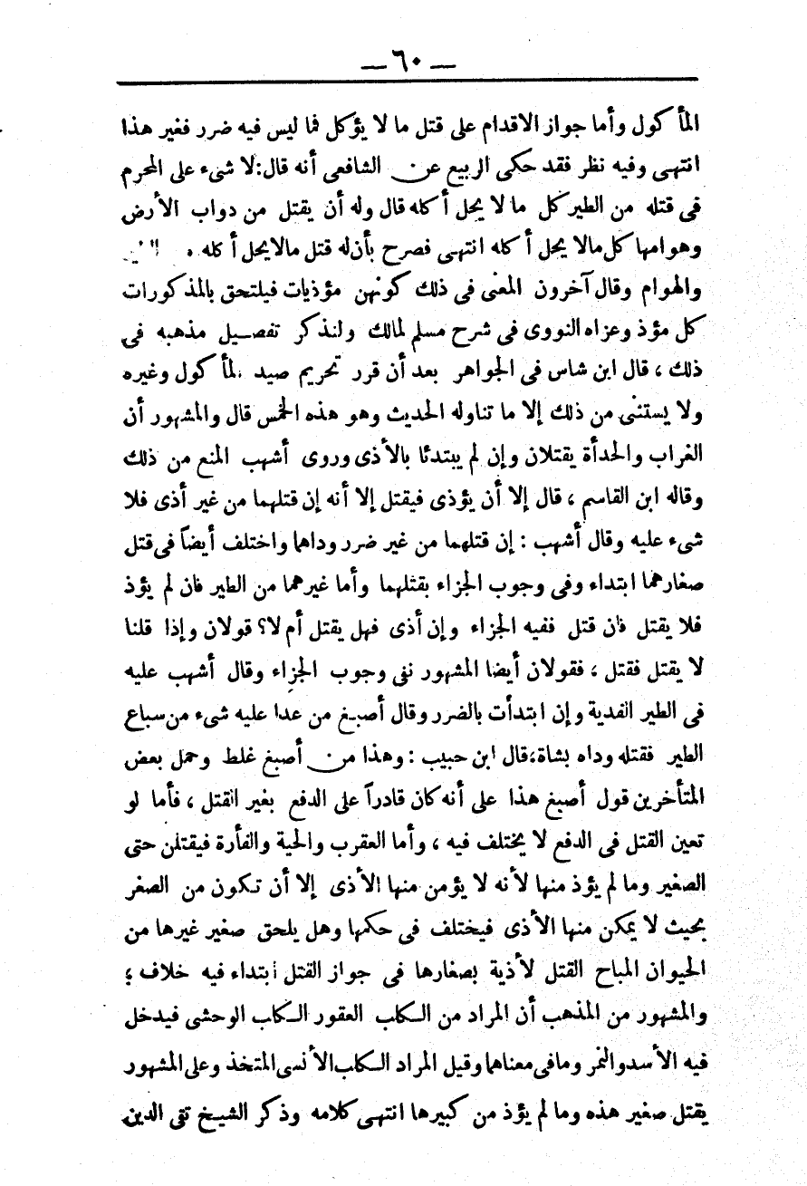 وَأَمَّا جَوَازُ الْإِقْدَامِ عَلَى قَتْلِ مَا لَا يُؤْكَلُ فَمَا لَيْسَ فِيهِ ضَرَرٌ فَغَيْرُ هَذَا انْتَهَى وَفِيهِ نَظَرٌ فَقَدْ حَكَى الرَّبِيعُ عَنْ الشَّافِعِيِّ أَنَّهُ قَالَ: لَا شَيْءَ عَلَى الْمُحْرِمِ فِي قَتْلِهِ مِنْ الطَّيْرِ كُلِّ مَا لَا يَحِلُّ أَكْلُهُ قَالَ وَلَهُ أَنْ يَقْتُلَ مِنْ دَوَابِّ الْأَرْضِ وَهَوَامِّهَا كُلَّ مَا لَا يَحِلُّ أَكْلُهُ انْتَهَى فَصَرَّحَ بِأَنَّ لَهُ قَتْلَ مَا لَا يَحِلُّ أَكْلُهُ مِنْ الطَّيْرِ وَالْهَوَامِّ وَقَالَ آخَرُونَ الْمَعْنَى فِي ذَلِكَ كَوْنُهُنَّ مُؤْذِيَاتٍ فَيَلْتَحِقُ بِالْمَذْكُورَاتِ كُلُّ مُؤْذٍ وَعَزَاهُ النَّوَوِيُّ فِي شَرْحِ مُسْلِمٍ لِمَالِكٍ وَلْنَذْكُرْ تَفْصِيلَ مَذْهَبِهِ فِي ذَلِكَ.