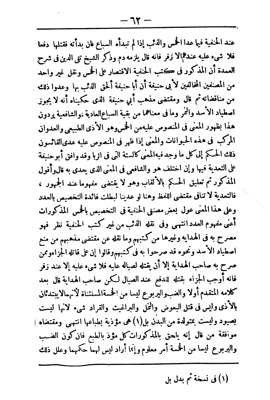 ـــــــــــــــــــــــــــــQعِنْدَ الْحَنَفِيَّةِ فِيمَا عَدَا الْخَمْسَ وَالذِّئْبَ إذَا لَمْ تَبْدَأْهُ السِّبَاعُ فَإِنْ بَدَأَتْهُ فَقَتَلَهَا دَفْعًا فَلَا شَيْءَ عَلَيْهِ عِنْدَهُمْ إلَّا زُفَرُ فَإِنَّهُ قَالَ يَلْزَمُهُ دَمٌ وَذَكَرَ الشَّيْخُ تَقِيُّ الدِّينِ فِي شَرْحِ الْعُمْدَةِ أَنَّ الْمَذْكُورَ فِي كُتُبِ الْحَنَفِيَّةِ الِاقْتِصَارُ عَلَى الْخَمْسِ.