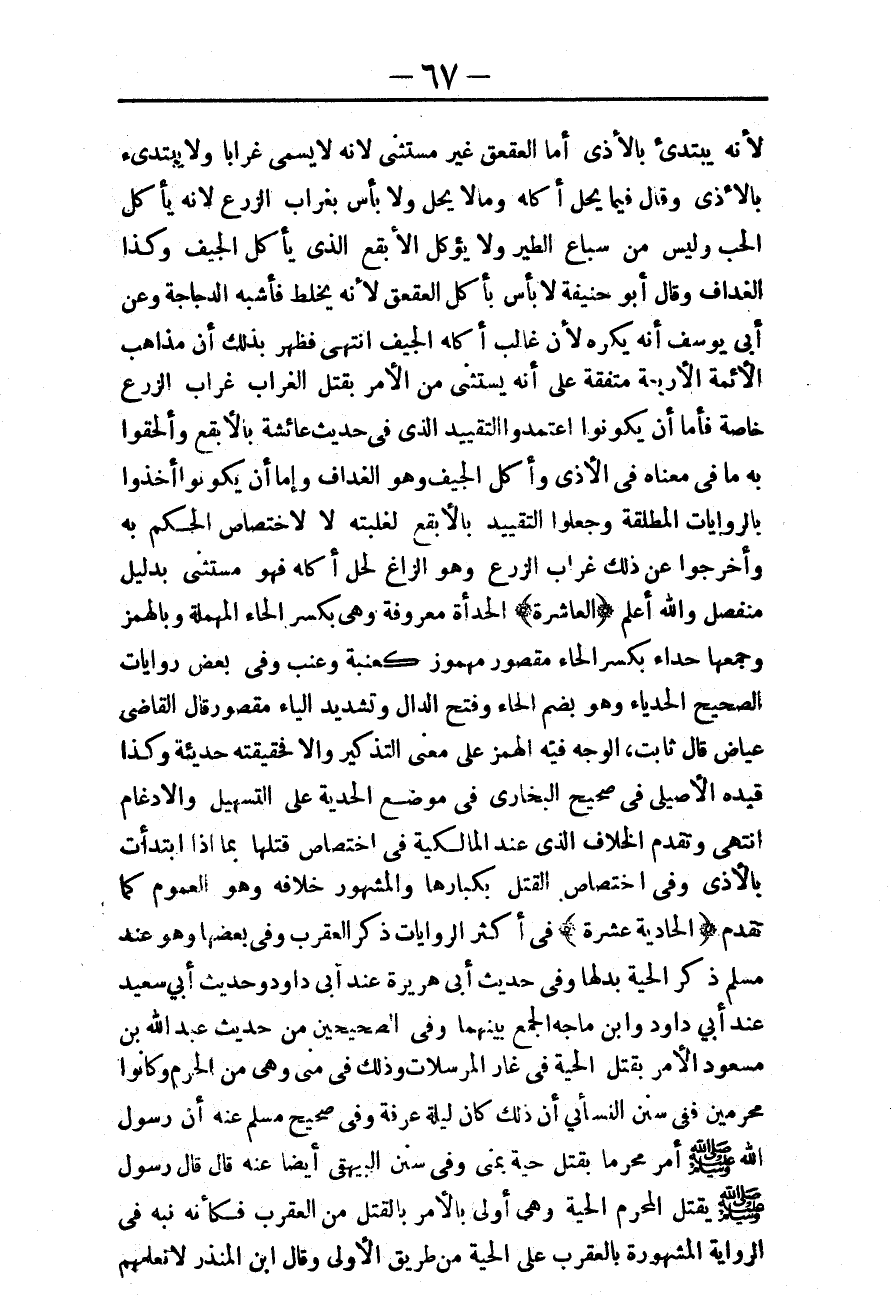 وَفِي سُنَنِ الْبَيْهَقِيّ أَيْضًا عَنْهُ قَالَ قَالَ رَسُولُ - صَلَّى اللَّهُ عَلَيْهِ وَسَلَّمَ - «يَقْتُلُ الْمُحْرِمُ الْحَيَّةَ» وَهِيَ أَوْلَى بِالْأَمْرِ بِالْقَتْلِ مِنْ الْعَقْرَبِ فَكَأَنَّهُ نَبَّهَ فِي الرِّوَايَةِ الْمَشْهُورَةِ بِالْعَقْرَبِ عَلَى الْحَيَّةِ مِنْ طَرِيقِ الْأَوْلَى وَقَالَ ابْنُ الْمُنْذِرِ لَا نَعْلَمُهُمْ