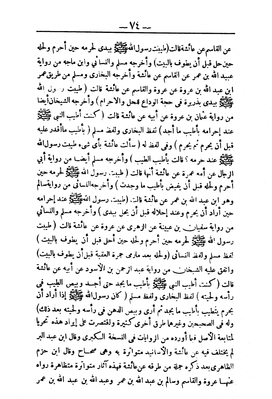وَلَهُ فِي الصَّحِيحَيْنِ وَغَيْرِهِمَا طُرُقٌ أُخْرَى كَثِيرَةٌ وَاقْتَصَرْت عَلَى إيرَادِ هَذِهِ تَحَرِّيًا لِمُتَابَعَةِ الْأَصْلِ فِيمَا أَوْرَدَهُ مِنْ الرِّوَايَاتِ فِي النُّسْخَةِ الْكُبْرَى وَقَالَ ابْنُ عَبْدِ الْبَرِّ لَمْ يُخْتَلَفْ فِيهِ عَنْ عَائِشَةَ وَالْأَسَانِيدُ مُتَوَاتِرَةٌ بِهِ وَهِيَ صِحَاحٌ وَقَالَ ابْنُ حَزْمٍ الظَّاهِر بَعْدَ ذِكْرِهِ جُمْلَةً مِنْ طُرُقِهِ عَنْ عَائِشَةَ فَهَذِهِ آثَارٌ مُتَوَاتِرَةٌ مُتَظَاهِرَةٌ رَوَاهُ عَنْهَا عُرْوَةُ وَالْقَاسِمُ وَسَالِمُ بْنُ عَبْدِ اللَّهِ بْنِ عُمَرَ وَعَبْدُ اللَّهِ بْنُ عَبْدِ اللَّهِ بْنِ عُمَرَ