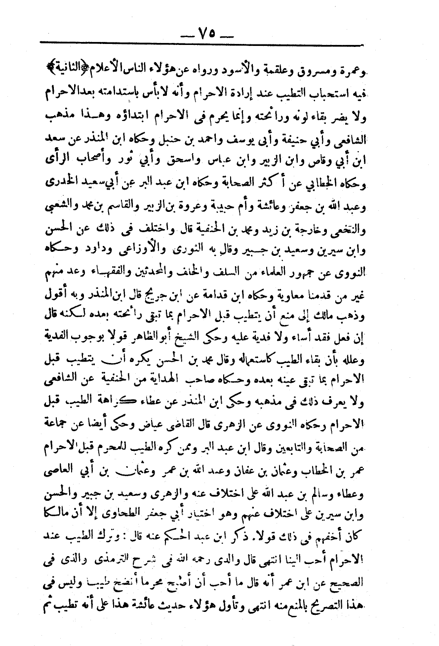 وَذَهَبَ مَالِكٌ إلَى مَنْعِ أَنْ يَتَطَيَّبَ قَبْلَ الْإِحْرَامِ بِمَا تَبْقَى رَائِحَتُهُ بَعْدَهُ لَكِنَّهُ قَالَ إنْ فَعَلَ فَقَدْ أَسَاءَ وَلَا فِدْيَةَ عَلَيْهِ وَحَكَى الشَّيْخُ أَبُو الطَّاهِرِ قَوْلًا بِوُجُوبِ الْفِدْيَةِ وَعَلَّلَهُ بِأَنَّ بَقَاءَ الطِّيبِ كَاسْتِعْمَالِهِ وَقَالَ مُحَمَّدُ بْنُ الْحَسَنِ يُكْرَهُ أَنْ يَتَطَيَّبَ قَبْلَ الْإِحْرَامِ بِمَا تَبْقَى عَيْنُهُ بَعْدَهُ وَحَكَاهُ صَاحِبُ الْهِدَايَةِ مِنْ الْحَنَفِيَّةِ عَنْ الشَّافِعِيِّ وَلَا يُعْرَفُ ذَلِكَ فِي مَذْهَبِهِ وَحَكَى ابْنُ الْمُنْذِرِ عَنْ عَطَاءٍ كَرَاهَةَ الطِّيبِ قَبْلَ الْإِحْرَامِ وَحَكَاهُ النَّوَوِيُّ عَنْ الزُّهْرِيِّ قَالَ الْقَاضِي عِيَاضٌ وَحَكَى أَيْضًا عَنْ جَمَاعَةٍ مِنْ الصَّحَابَةِ وَالتَّابِعِينَ وَقَالَ ابْنُ عَبْدِ الْبَرِّ وَمِمَّنْ كَرِهَ الطِّيبَ لِلْمُحْرِمِ قَبْلَ الْإِحْرَامِ عُمَرُ بْنُ الْخَطَّابِ وَعُثْمَانُ بْنُ عَفَّانَ وَعَبْدُ اللَّهِ بْنُ عُمَرَ وَعُثْمَانُ بْنُ أَبِي الْعَاصِ وَعَطَاءٌ وَسَالِمُ بْنُ عَبْدِ اللَّهِ عَلَى اخْتِلَافٍ عَنْهُ وَالزُّهْرِيُّ وَسَعِيدُ بْنُ جُبَيْرٍ وَالْحَسَنُ وَابْنُ سِيرِينَ عَلَى اخْتِلَافٍ عَنْهُمْ وَهُوَ اخْتِيَارُ أَبِي جَعْفَرٍ الطَّحَاوِيِّ إلَّا أَنَّ مَالِكًا كَانَ أَخَفَّهُمْ فِي ذَلِكَ قَوْلًا.