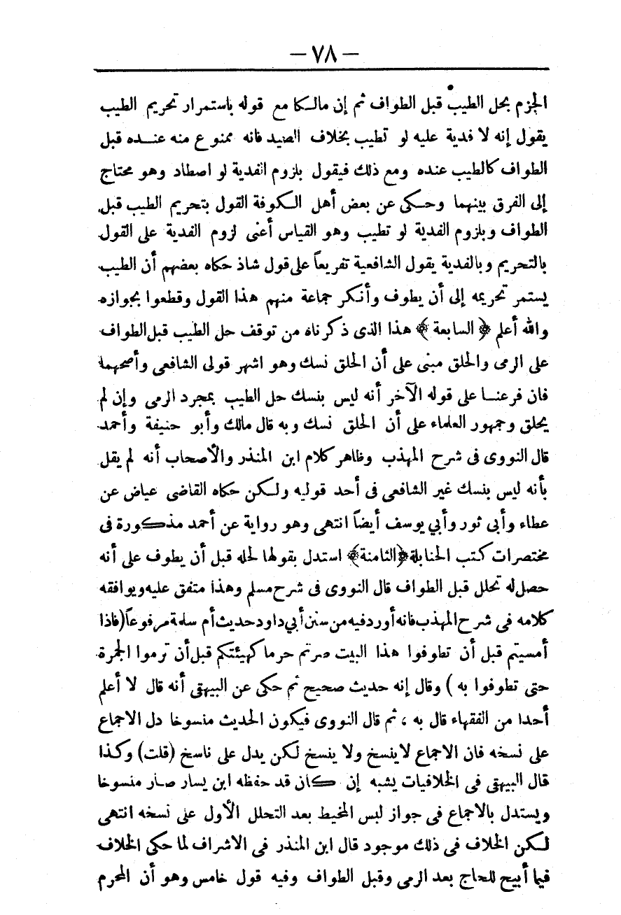(السَّابِعَةُ) هَذَا الَّذِي ذَكَرْنَاهُ مِنْ تَوَقُّفِ حِلِّ الطِّيبِ قَبْلَ الطَّوَافِ عَلَى الرَّمْيِ وَالْحَلْقِ مَبْنِيٌّ عَلَى أَنَّ الْحَلْقَ نُسُكٌ وَهُوَ أَشْهَرُ قَوْلَيْ الشَّافِعِيِّ وَأَصَحُّهُمَا فَإِنْ فَرَّعْنَا عَلَى قَوْلِهِ لِلْآخَرِ أَنَّهُ لَيْسَ بِنُسُكٍ حَلَّ الطِّيبُ بِمُجَرَّدِ الرَّمْيِ وَإِنْ لَمْ يَحْلِقْ وَجُمْهُورُ الْعُلَمَاءِ عَلَى أَنَّ الْحَلْقَ نُسُكٌ وَبِهِ قَالَ مَالِكٌ وَأَبُو حَنِيفَةَ وَأَحْمَدُ قَالَ النَّوَوِيُّ فِي شَرْحِ الْمُهَذَّبِ وَظَاهِرُ كَلَامِ ابْنِ الْمُنْذِرِ وَالْأَصْحَابِ أَنَّهُ لَمْ يَقُلْ بِأَنَّهُ لَيْسَ بِنُسُكِ غَيْرُ الشَّافِعِيِّ فِي أَحَدِ قَوْلَيْهِ وَلَكِنْ حَكَاهُ الْقَاضِي عِيَاضٌ عَنْ عَطَاءٍ وَأَبِي ثَوْرٍ وَأَبِي يُوسُفَ أَيْضًا انْتَهَى وَهُوَ رِوَايَةٌ عَنْ أَحْمَدَ مَذْكُورَةٌ فِي مُخْتَصَرَاتِ كُتُبِ الْحَنَابِلَةِ.