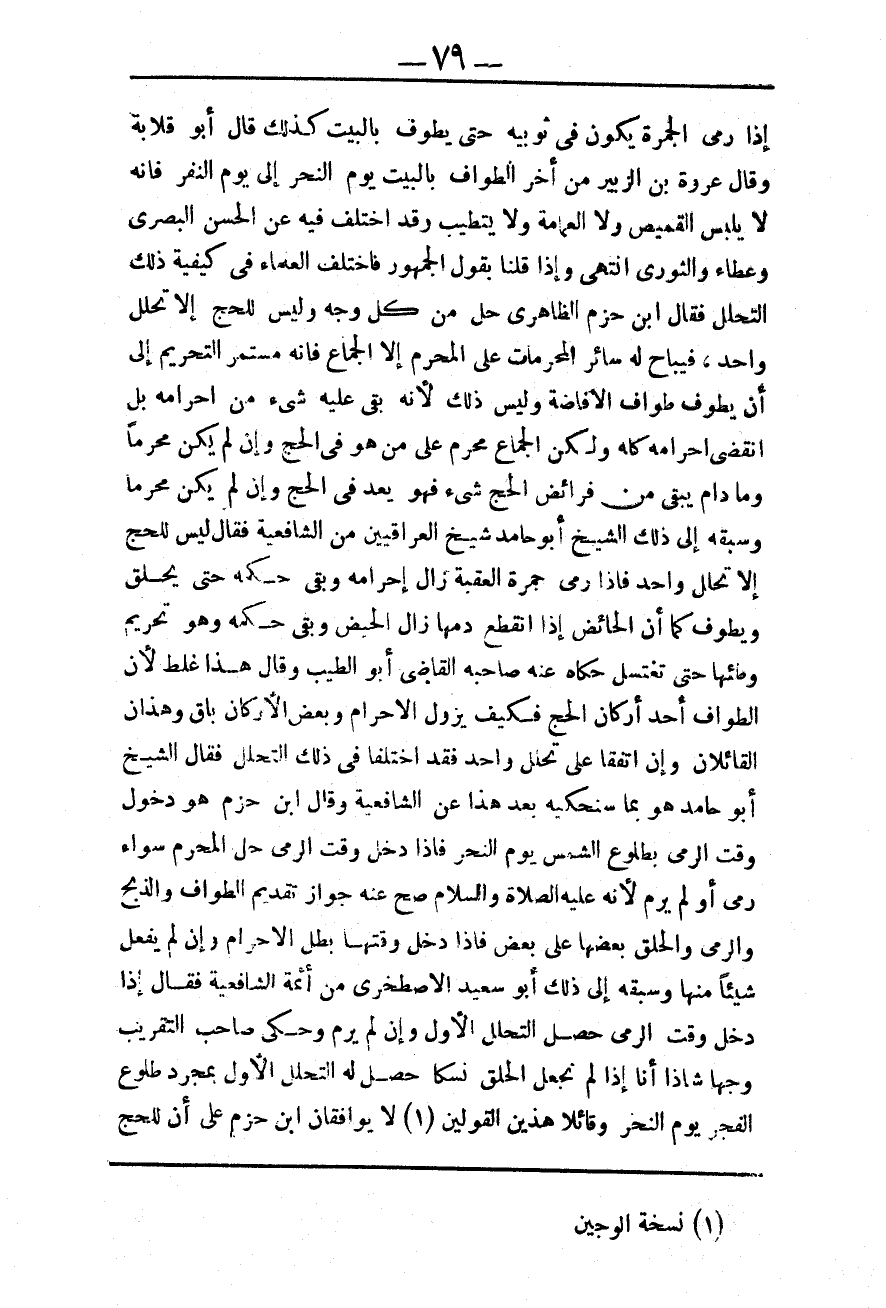 وَإِذَا قُلْنَا بِقَوْلِ الْجُمْهُورِ فَاخْتَلَفَ الْعُلَمَاءُ فِي كَيْفِيَّةِ ذَلِكَ التَّحَلُّلِ فَقَالَ ابْنُ حَزْمٍ الظَّاهِرِيُّ حَلَّ مِنْ كُلِّ وَجْهٍ وَلَيْسَ لِلْحَجِّ إلَّا تَحَلُّلٌ وَاحِدٌ، فَيُبَاحُ لَهُ سَائِرُ الْمُحَرَّمَاتُ عَلَى الْمُحْرِمِ إلَّا الْجِمَاعَ فَإِنَّهُ مُسْتَمِرُّ التَّحْرِيمِ إلَى أَنْ يَطُوفَ طَوَافَ الْإِفَاضَةِ وَلَيْسَ ذَلِكَ لِأَنَّهُ بَقِيَ عَلَيْهِ شَيْءٌ مِنْ إحْرَامِهِ بَلْ انْقَضَى إحْرَامُهُ كُلُّهُ وَلَكِنَّ الْجِمَاعَ مُحَرَّمٌ عَلَى مَنْ هُوَ فِي الْحَجِّ وَإِنْ لَمْ يَكُنْ مُحْرِمًا وَمَا دَامَ يَبْقَى مِنْ فَرَائِضِ الْحَجِّ شَيْءٌ فَهُوَ يُعَدُّ فِي الْحَجِّ وَإِنْ لَمْ يَكُنْ مُحْرِمًا وَسَبَقَهُ إلَى ذَلِكَ الشَّيْخُ أَبُو حَامِدٍ شَيْخُ الْعِرَاقِيِّينَ مِنْ الشَّافِعِيَّةِ فَقَالَ لَيْسَ لِلْحَجِّ إلَّا تَحَلُّلٌ وَاحِدٌ فَإِذَا رَمَى جَمْرَةَ الْعَقَبَةِ زَالَ إحْرَامُهُ وَبَقِيَ حُكْمُهُ حَتَّى يَحْلِقَ وَيَطُوفَ كَمَا أَنَّ الْحَائِضَ إذَا انْقَطَعَ دَمُهَا زَالَ الْحَيْضُ وَبَقِيَ حُكْمُهُ وَهُوَ تَحْرِيمُ وَطِئَهَا حَتَّى تَغْتَسِلَ.