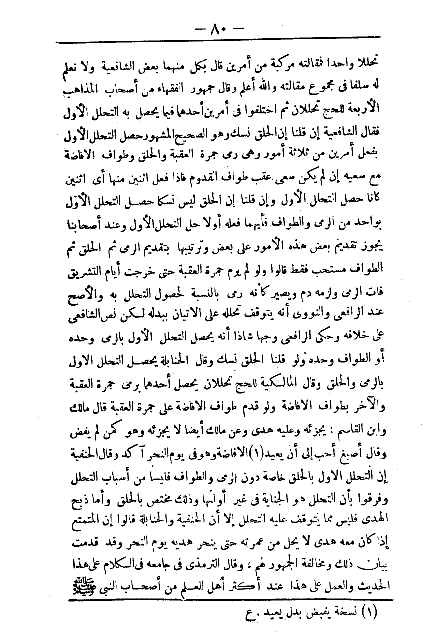 وَقَالَ جُمْهُورُ الْفُقَهَاءِ مِنْ أَصْحَابِ الْمَذَاهِبِ الْأَرْبَعَةِ لِلْحَجِّ تَحَلُّلَانِ ثُمَّ اخْتَلَفُوا فِي أَمْرَيْنِ أَحَدُهُمَا فِيمَا يَحْصُلُ بِهِ التَّحَلُّلُ الْأَوَّلُ فَقَالَ الشَّافِعِيَّةُ إنْ قُلْنَا إنَّ الْحَلْقَ نُسُكٌ وَهُوَ الصَّحِيحُ الْمَشْهُورُ حَصَلَ التَّحَلُّلُ الْأَوَّلُ بِفِعْلِ أَمْرَيْنِ مِنْ ثَلَاثَةِ أُمُورٍ وَهِيَ رَمْيُ جَمْرَةِ الْعَقَبَةِ وَالْحَلْقُ وَطَوَافُ الْإِفَاضَةِ مَعَ سَعْيِهِ إنْ لَمْ يَكُنْ سَعَى عَقِبَ طَوَافِ الْقُدُومِ فَإِذَا فَعَلَ اثْنَيْنِ مِنْهَا أَيُّ اثْنَيْنِ كَانَا حَصَلَ التَّحَلُّلُ الْأَوَّلُ وَإِنْ قُلْنَا إنَّ الْحَلْقَ لَيْسَ نُسُكًا حَصَلَ التَّحَلُّلُ الْأَوَّلُ بِوَاحِدٍ مِنْ الرَّمْيِ وَالطَّوَافِ فَأَيُّهُمَا فَعَلَهُ أَوَّلًا حَلَّ التَّحَلُّلُ الْأَوَّلُ وَعِنْدَ أَصْحَابِنَا يَجُوزُ تَقْدِيمُ بَعْضِ هَذِهِ الْأُمُورِ عَلَى بَعْضٍ وَتَرْتِيبُهَا بِتَقْدِيمِ الرَّمْيِ ثُمَّ الْحَلْقِ ثُمَّ الطَّوَافِ مُسْتَحَبٌّ فَقَطْ.