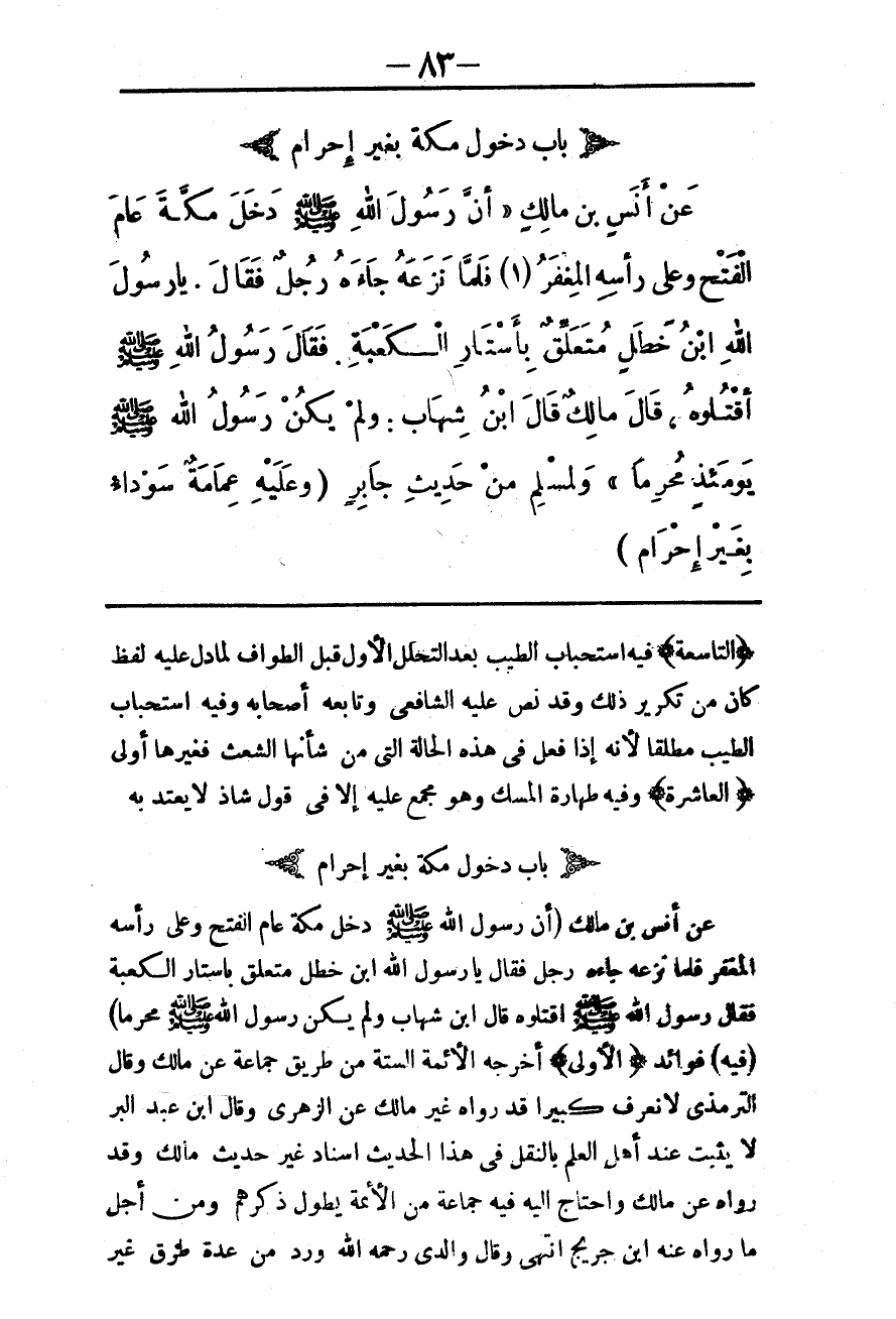 (بَابُ دُخُولِ مَكَّةَ بِغَيْرِ إحْرَامٍ) عَنْ أَنَسِ بْنِ مَالِكٍ «أَنَّ رَسُولَ اللَّهِ - صَلَّى اللَّهُ عَلَيْهِ وَسَلَّمَ - دَخَلَ مَكَّةَ عَامَ الْفَتْحِ وَعَلَى رَأْسِهِ الْمِغْفَرُ فَلَمَّا نَزَعَهُ جَاءَهُ رَجُلٌ فَقَالَ يَا رَسُولَ اللَّهِ ابْنُ خَطَلٍ مُتَعَلِّقٌ بِأَسْتَارِ الْكَعْبَةِ فَقَالَ رَسُولُ اللَّهِ - صَلَّى اللَّهُ عَلَيْهِ وَسَلَّمَ - اُقْتُلُوهُ قَالَ ابْنُ شِهَابٍ وَلَمْ يَكُنْ رَسُولُ اللَّهِ - صَلَّى اللَّهُ عَلَيْهِ وَسَلَّمَ - مُحْرِمًا» (فِيهِ) فَوَائِدُ.