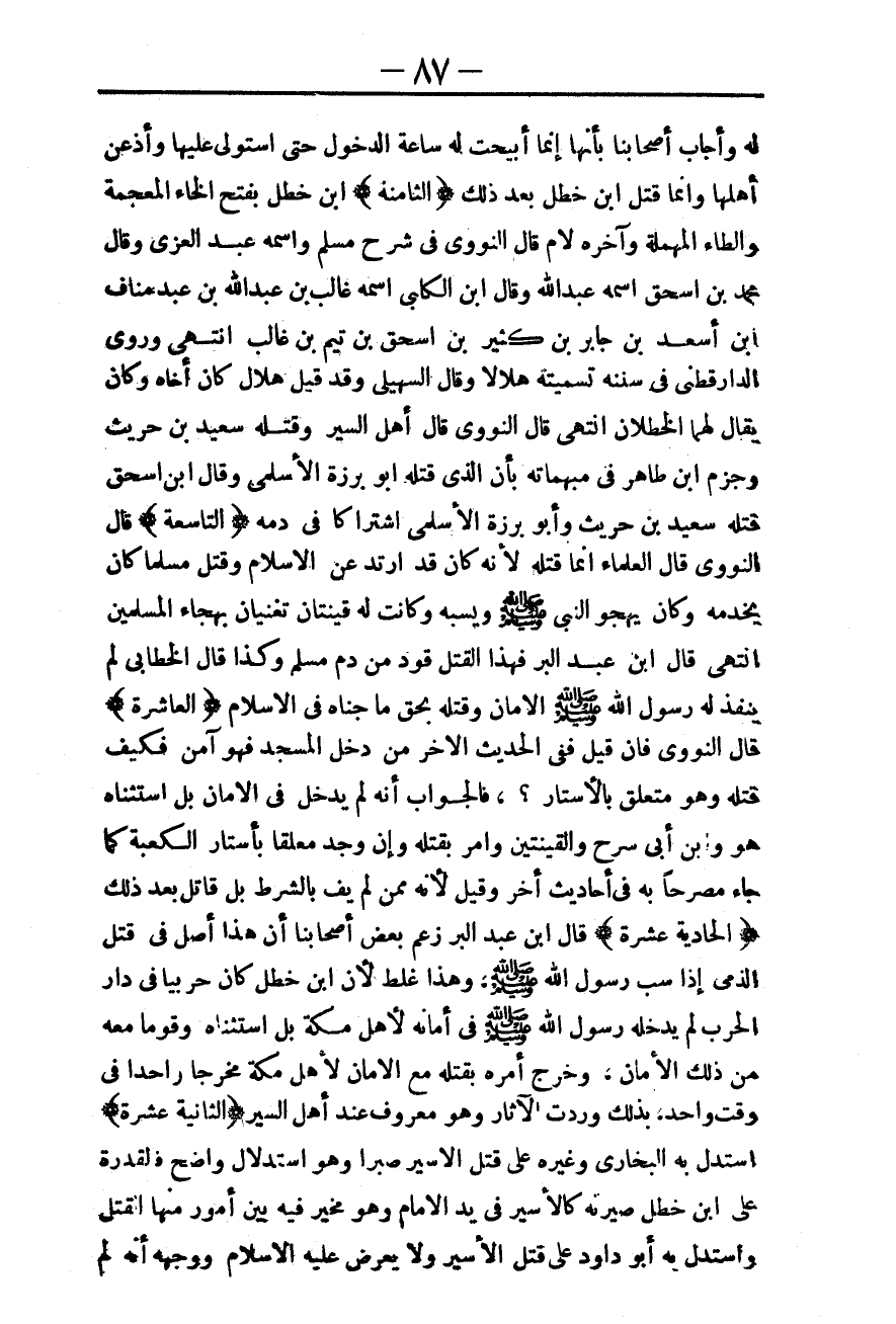 (الثَّامِنَةُ) ابْنُ خَطَلٍ بِفَتْحِ الْخَاءِ الْمُعْجَمَةِ وَالطَّاءِ الْمُهْمَلَةِ وَآخِرُهُ لَامٌ قَالَ النَّوَوِيُّ فِي شَرْحِ مُسْلِمٍ وَاسْمُهُ عَبْدُ الْعُزَّى وَقَالَ مُحَمَّدُ بْنُ إِسْحَاقَ اسْمُهُ عَبْدُ اللَّهِ وَقَالَ ابْنُ الْكَلْبِيِّ اسْمُهُ غَالِبُ بْنُ عَبْدِ اللَّهِ بْنِ عَبْدِ مَنَافِ بْنِ أَسْعَدَ بْنِ جَابِرِ بْنِ كَثِيرِ بْنِ إِسْحَاقَ بْنِ تَيْمِ ابْنِ غَالِبٍ انْتَهَى وَرَوَى الدَّارَقُطْنِيُّ فِي سُنَنِهِ تَسْمِيَتَهُ هِلَالًا وَقَالَ السُّهَيْلِيُّ وَقَدْ قِيلَ هِلَالٌ كَانَ أَخَاهُ وَكَانَ يُقَالُ لَهُمَا الْخَطَلَانِ انْتَهَى قَالَ النَّوَوِيُّ قَالَ أَهْلُ السِّيَرِ وَقَتَلَهُ سَعِيدُ بْنُ حُرَيْثٍ وَجَزَمَ ابْنُ طَاهِرٍ فِي مُبْهَمَاتِهِ بِأَنَّ الَّذِي قَتَلَهُ أَبُو بَرْزَةَ الْأَسْلَمِيُّ وَقَالَ ابْنُ إِسْحَاقَ قَتَلَهُ سَعِيدُ بْنُ حُرَيْثٍ وَأَبُو بَرْزَةَ الْأَسْلَمِيُّ اشْتِرَاكًا فِي دَمِهِ (التَّاسِعَةُ) قَالَ النَّوَوِيُّ قَالَ الْعُلَمَاءُ إنَّمَا قَتَلَهُ لِأَنَّهُ كَانَ قَدْ ارْتَدَّ عَنْ الْإِسْلَامِ وَقَتَلَ مُسْلِمًا كَانَ يَخْدُمُهُ وَكَانَ يَهْجُو النَّبِيَّ - صَلَّى اللَّهُ عَلَيْهِ وَسَلَّمَ - وَيَسُبُّهُ وَكَانَتْ لَهُ قَيْنَتَانِ تُغَنِّيَانِ بِهِجَاءِ الْمُسْلِمِينَ انْتَهَى قَالَ ابْنُ عَبْدِ الْبَرِّ فَهَذَا الْقَتْلُ قَوَدٌ مِنْ دَمِ مُسْلِمٍ وَكَذَا قَالَ الْخَطَّابِيُّ لَمْ يُنَفِّذْ لَهُ رَسُولُ اللَّهِ - صَلَّى اللَّهُ عَلَيْهِ وَسَلَّمَ - الْأَمَانَ وَقَتَلَهُ بِحَقِّ مَا جَنَاهُ فِي الْإِسْلَامِ.