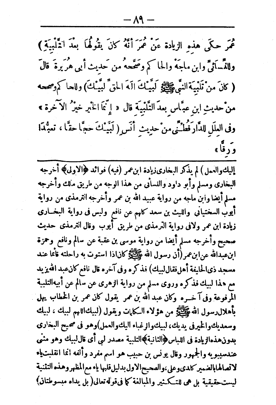 (الْأُولَى) أَخْرَجَهُ الْبُخَارِيُّ وَمُسْلِمٌ وَأَبُو دَاوُد وَالنَّسَائِيُّ مِنْ هَذَا الْوَجْهِ مِنْ طَرِيقِ مَالِكٍ وَأَخْرَجَهُ مُسْلِمٌ أَيْضًا وَابْنُ مَاجَهْ وَمِنْ رِوَايَةِ عُبَيْدِ اللَّهِ بْنِ عُمَرَ. وَأَخْرَجَهُ التِّرْمِذِيُّ مِنْ رِوَايَةِ أَيُّوبَ السِّخْتِيَانِيُّ وَاللَّيْثِ بْنِ سَعْدٍ كُلِّهِمْ عَنْ نَافِعٍ وَلَيْسَ فِي رِوَايَةِ الْبُخَارِيِّ زِيَادَةُ ابْنِ عُمَرَ وَلَا فِي رِوَايَةِ التِّرْمِذِيِّ مِنْ طَرِيقِ أَيُّوبَ وَقَالَ التِّرْمِذِيُّ حَدِيثٌ صَحِيحٌ وَأَخْرَجَهُ مُسْلِمٌ أَيْضًا مِنْ رِوَايَةِ مُوسَى بْنِ عُقْبَةَ عَنْ سَالِمٍ وَنَافِعٍ وَحَمْزَةَ بْنِ عَبْدِ اللَّهِ عَنْ ابْنِ عُمَرَ «أَنَّ رَسُولَ اللَّهِ - صَلَّى اللَّهُ عَلَيْهِ وَسَلَّمَ - كَانَ إذَا اسْتَوَتْ بِهِ رَاحِلَتُهُ قَائِمًا عِنْدَ مَسْجِدِ ذِي الْحُلَيْفَةِ أَهَلَّ فَقَالَ لَبَّيْكَ» . فَذَكَرَهُ وَفِي آخِرِهِ قَالَ نَافِعٌ كَانَ عَبْدُ اللَّهِ يَزِيدُ مَعَ هَذَا لَبَّيْكَ فَذَكَرَهُ وَرَوَى مُسْلِمٌ مِنْ رِوَايَةِ الزُّهْرِيِّ عَنْ سَالِمٍ عَنْ أَبِيهِ التَّلْبِيَةَ الْمَرْفُوعَةَ وَفِي آخِرِهِ وَكَانَ عَبْدُ اللَّهِ بْنُ عُمَرَ يَقُولُ كَانَ عُمَرُ بْنُ الْخَطَّابِ يُهِلُّ بِإِهْلَالِ رَسُولِ اللَّهِ - صَلَّى اللَّهُ عَلَيْهِ وَسَلَّمَ - مِنْ هَؤُلَاءِ الْكَلِمَاتِ وَيَقُولُ «لَبَّيْكَ اللَّهُمَّ لَبَّيْكَ، لَبَّيْكَ وَسَعْدَيْكَ وَالْخَيْرُ فِي يَدَيْك، لَبَّيْكَ وَالرَّغْبَاءُ إلَيْك وَالْعَمَلُ» . وَهُوَ فِي صَحِيحِ الْبُخَارِيِّ بِدُونِ هَذِهِ الزِّيَادَةِ