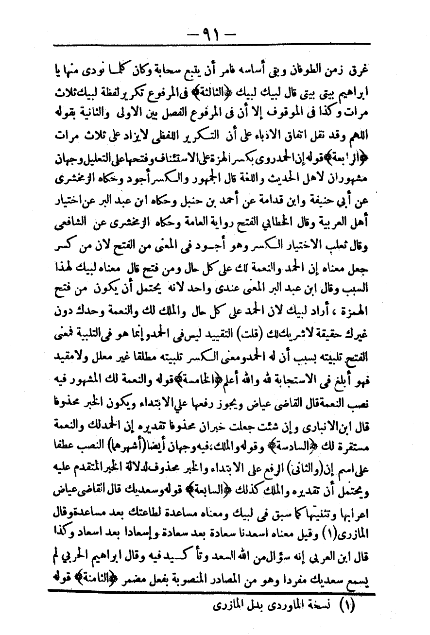 وَقَالَ الْخَطَّابِيُّ الْفَتْحُ رِوَايَةُ الْعَامَّةِ وَحَكَاهُ الزَّمَخْشَرِيّ عَنْ الشَّافِعِيِّ وَقَالَ ثَعْلَبٌ الِاخْتِيَارُ الْكَسْرُ وَهُوَ أَجْوَدُ فِي الْمَعْنَى مِنْ الْفَتْحِ لِأَنَّ مَنْ كَسَرَ جَعَلَ مَعْنَاهُ إنَّ الْحَمْدَ وَالنِّعْمَةَ لَك عَلَى كُلِّ حَالٍ وَمَنْ فَتَحَ قَالَ مَعْنَاهُ لَبَّيْكَ لِهَذَا السَّبَبِ وَقَالَ ابْنُ عَبْدِ الْبَرِّ الْمَعْنَى عِنْدِي وَاحِدٌ لِأَنَّهُ يَحْتَمِلُ أَنْ يَكُونَ مَنْ فَتَحَ الْهَمْزَةَ، أَرَادَ لَبَّيْكَ لِأَنَّ الْحَمْدَ عَلَى كُلِّ حَالٍ وَالْمُلْكَ لَك وَالنِّعْمَةَ وَحْدَك دُونَ غَيْرِك حَقِيقَةً لَا شَرِيكَ لَك (قُلْت) التَّقْيِيدُ لَيْسَ فِي الْحَمْدِ وَإِنَّمَا هُوَ فِي التَّلْبِيَةِ فَمَعْنَى الْفَتْحِ تَلْبِيَتُهُ بِسَبَبِ أَنَّ لَهُ الْحَمْدَ وَمَعْنَى الْكَسْرِ تَلْبِيَتُهُ مُطْلَقًا غَيْرُ مُعَلَّلٍ وَلَا مُقَيَّدٍ فَهُوَ أَبْلَغُ فِي الِاسْتِجَابَةِ لِلَّهِ وَاَللَّهُ أَعْلَمُ.