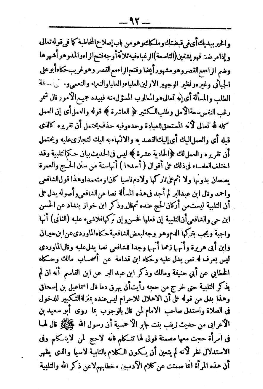 (الْحَادِيَةَ عَشْرَةَ) لَيْسَ فِي الْحَدِيثِ بَيَانُ حُكْمِ التَّلْبِيَةِ وَقَدْ اخْتَلَفَ الْعُلَمَاءُ فِي ذَلِكَ عَلَى أَقْوَالٍ: