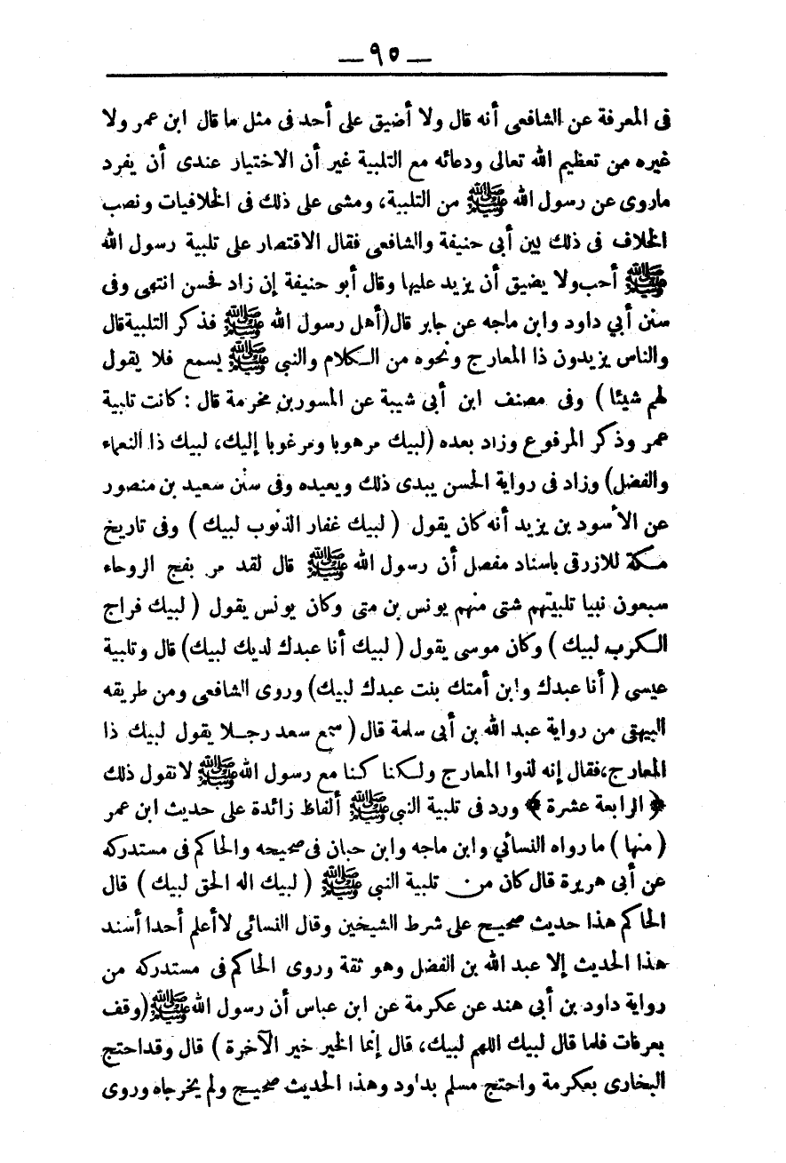 وَفِي تَارِيخِ مَكَّةَ لِلْأَزْرَقِيِّ بِإِسْنَادٍ مُفَصَّلٍ «أَنَّ رَسُولَ اللَّهِ - صَلَّى اللَّهُ عَلَيْهِ وَسَلَّمَ - قَالَ لَقَدْ مَرَّ بِفَجِّ الرَّوْحَاءِ سَبْعُونَ نَبِيًّا تَلْبِيَتُهُمْ شَتَّى مِنْهُمْ يُونُسُ بْنُ مَتَّى. وَكَانَ يُونُسُ يَقُولُ لَبَّيْكَ فَرَّاجَ الْكَرْبِ لَبَّيْكَ وَكَانَ مُوسَى يَقُولُ لَبَّيْكَ أَنَا عَبْدُك لَدَيْك لَبَّيْكَ قَالَ وَتَلْبِيَةُ عِيسَى أَنَا عَبْدُك وَابْنُ أَمَتِك بِنْتِ عَبْدِك لَبَّيْكَ» . وَرَوَى الشَّافِعِيُّ وَمِنْ طَرِيقِهِ الْبَيْهَقِيّ مِنْ رِوَايَةِ عَبْدِ اللَّهِ بْنِ أَبِي سَلَمَةَ قَالَ (سَمِعَ سَعْدٌ رَجُلًا يَقُولُ لَبَّيْكَ ذَا الْمَعَارِجِ، فَقَالَ إنَّهُ لَذُو الْمَعَارِجِ وَلَكِنَّا كُنَّا مَعَ رَسُولِ اللَّهِ - صَلَّى اللَّهُ عَلَيْهِ وَسَلَّمَ - لَا نَقُولُ ذَلِكَ) .