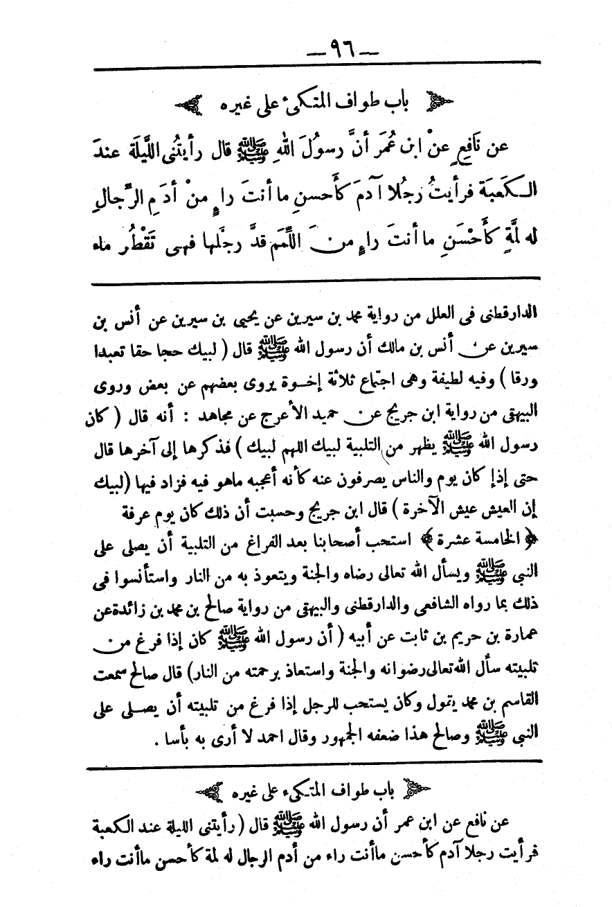 (بَابُ طَوَافِ الْمُتَّكِئِ عَلَى غَيْرِهِ) عَنْ نَافِعٍ عَنْ ابْنِ عُمَرَ «أَنَّ رَسُولَ اللَّهِ - صَلَّى اللَّهُ عَلَيْهِ وَسَلَّمَ - قَالَ رَأَيْتُنِي اللَّيْلَةَ عِنْدَ الْكَعْبَةِ فَرَأَيْتُ رَجُلًا آدَمَ كَأَحْسَنِ مَا أَنْتَ رَاءٍ مِنْ أُدْمِ الرِّجَالِ لَهُ لِمَّةٌ كَأَحْسَنِ مَا أَنْتَ رَاءٍ