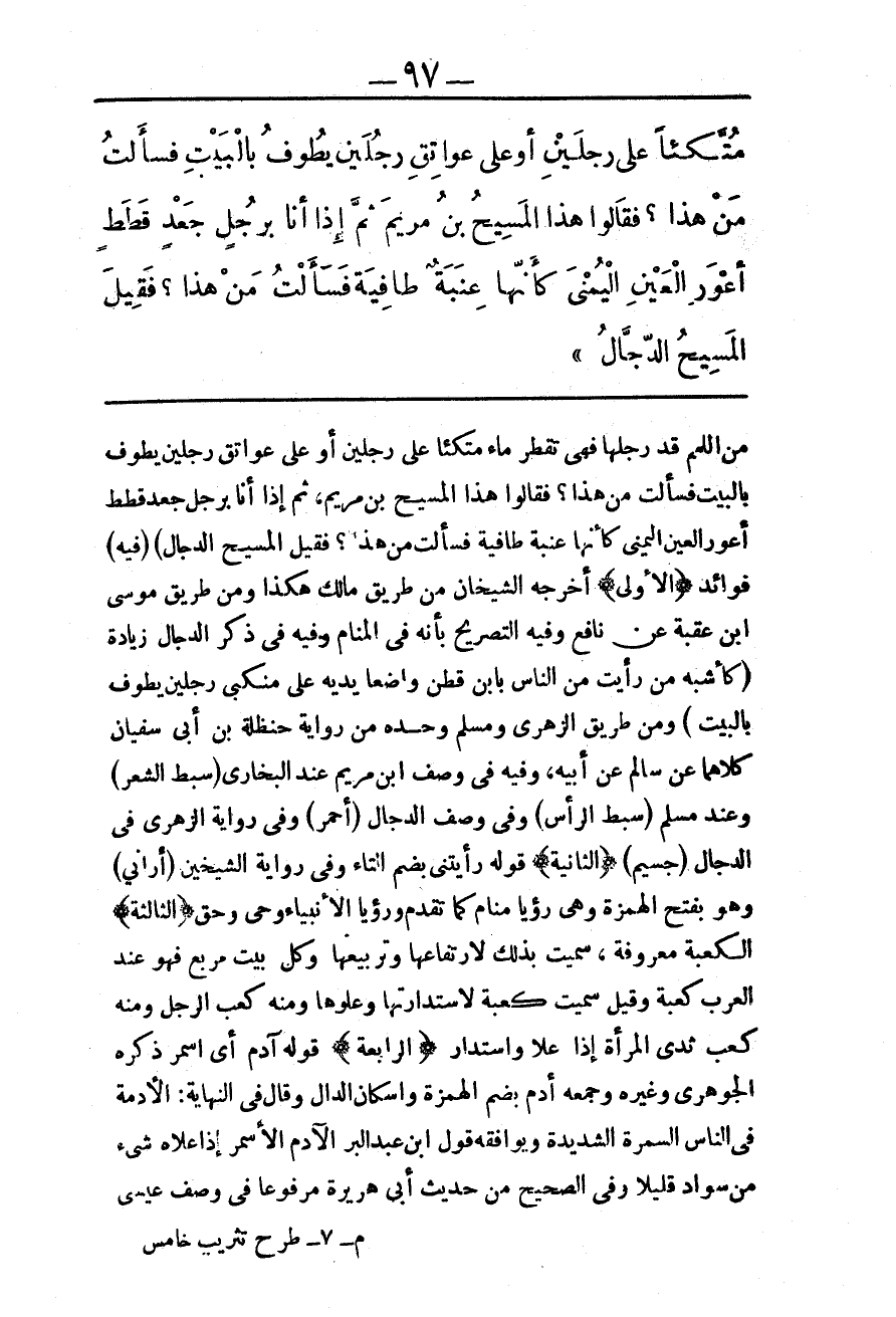 ـــــــــــــــــــــــــــــQمِنْ اللِّمَمِ قَدْ رَجَّلَهَا فَهِيَ تَقْطُرُ مَاءً مُتَّكِئًا عَلَى رَجُلَيْنِ أَوْ عَلَى عَوَاتِقِ رَجُلَيْنِ يَطُوفُ بِالْبَيْتِ فَسَأَلْت مَنْ هَذَا؟ فَقَالُوا هَذَا الْمَسِيحُ ابْنُ مَرْيَمَ، ثُمَّ إذَا أَنَا بِرَجُلٍ جَعْدٍ قَطَطٍ أَعْوَرِ الْعَيْنِ الْيُمْنَى كَأَنَّهَا عِنَبَةٌ طَافِيَةٌ فَسَأَلْت مَنْ هَذَا؟ فَقِيلَ الْمَسِيحُ الدَّجَّالُ» . (فِيهِ) فَوَائِدُ: {الْأُولَى} أَخْرَجَهُ الشَّيْخَانِ مِنْ طَرِيقِ مَالِكٍ هَكَذَا وَمِنْ طَرِيقِ مُوسَى بْنِ عُقْبَةَ عَنْ نَافِعٍ وَفِيهِ التَّصْرِيحُ بِأَنَّهُ فِي الْمَنَامِ وَفِيهِ فِي ذِكْرِ الدَّجَّالِ زِيَادَةٌ «كَأَشْبَهَ مَنْ رَأَيْت مِنْ النَّاسِ بِابْنِ قُطْنٍ وَاضِعًا يَدَيْهِ عَلَى مَنْكِبَيْ رَجُلَيْنِ يَطُوفُ بِالْبَيْتِ» وَمِنْ طَرِيقِ الزُّهْرِيِّ وَمُسْلِمٍ وَحْدَهُ مِنْ رِوَايَةِ حَنْظَلَةَ بْنِ أَبِي سُفْيَانَ كِلَاهُمَا عَنْ سَالِمٍ عَنْ أَبِيهِ، وَفِيهِ فِي وَصْفِ ابْنِ مَرْيَمَ عِنْدَ الْبُخَارِيِّ «سَبْطَ الشَّعْرِ» . وَعِنْدَ مُسْلِمٍ «سَبْطَ الرَّأْسِ» وَفِي وَصْفِ الدَّجَّالِ «أَحْمَرَ» وَفِي رِوَايَةِ الزُّهْرِيِّ فِي الدَّجَّالِ «جَسِيمٌ» .