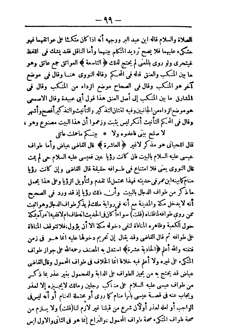 (الْعَاشِرَةُ) قَالَ الْقَاضِي عِيَاضٌ وَأَمَّا طَوَافُ عِيسَى - عَلَيْهِ السَّلَامُ - بِالْبَيْتِ فَإِنْ كَانَتْ رُؤْيَا عَيْنٍ فَعِيسَى - عَلَيْهِ السَّلَامُ - حَيٌّ لَمْ يَمُتْ قَالَ النَّوَوِيُّ يَعْنِي فَلَا امْتِنَاعَ فِي طَوَافِهِ حَقِيقَةً قَالَ الْقَاضِي وَإِنْ كَانَتْ رُؤْيَا مَنَامٍ كَمَا بَيَّنَهُ ابْنُ عُمَرَ فِي حَدِيثِهِ فَهَذَا مُحْتَمِلٌ لِمَا تَقَدَّمَ وَلِتَأْوِيلِ الرُّؤْيَا وَعَلَى هَذَا يُحْمَلُ مَا ذُكِرَ مِنْ طَوَافِ الدَّجَّالِ بِالْبَيْتِ وَأَنَّ ذَلِكَ رُؤْيَا إذْ قَدْ وَرَدَ فِي الصَّحِيحِ أَنَّهُ لَا يَدْخُلُ مَكَّةَ وَالْمَدِينَةِ مَعَ أَنَّهُ فِي رِوَايَةِ مَالِكٍ لَمْ يَذْكُرْ طَوَافَ الدَّجَّالِ وَهُوَ أَثْبَتُ مِمَّنْ رَوَى طَوَافَهُ لِمَا قُلْنَا (قُلْت) سَوَاءٌ أَكَانَ فِي الْحَدِيثِ أَنَّهُ طَافَ أَمْ لَا فَفِيهِ أَنَّهُ رَآهُ بِمَكَّةَ حَوْلَ الْكَعْبَةِ وَظَاهِرُهُ الْمُنَافَاةُ لِنَفْيِ دُخُولِهِ مَكَّةَ إلَّا أَنْ يُؤَوَّلَ.