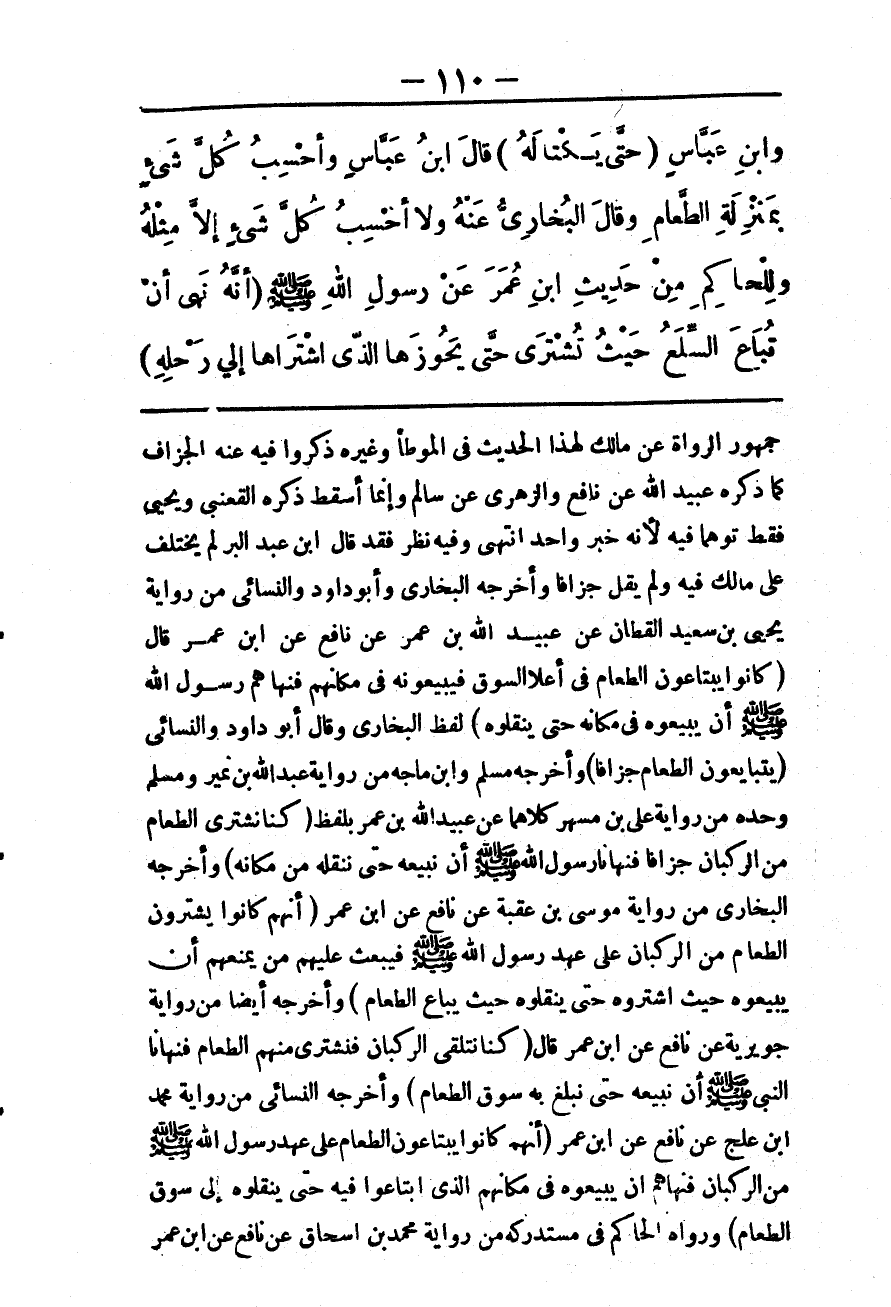وَفِيهِ نَظَرٌ فَقَدْ قَالَ ابْنُ عَبْدِ الْبَرِّ لَمْ يُخْتَلَفْ عَلَى مَالِكٍ فِيهِ وَلَمْ يَقُلْ جُزَافًا، وَأَخْرَجَهُ الْبُخَارِيُّ، وَأَبُو دَاوُد وَالنَّسَائِيُّ مِنْ رِوَايَةِ يَحْيَى بْنِ سَعِيدٍ الْقَطَّانِ عَنْ عُبَيْدِ اللَّهِ بْنِ عُمَرَ عَنْ نَافِعٍ عَنْ ابْنِ عُمَرَ قَالَ «كَانُوا يَبْتَاعُونَ الطَّعَامَ فِي أَعْلَى السُّوقِ فَيَبِيعُونَهُ فِي مَكَانِهِمْ فَنَهَاهُمْ رَسُولُ اللَّهِ - صَلَّى اللَّهُ عَلَيْهِ وَسَلَّمَ - أَنْ يَبِيعُوهُ فِي مَكَانِهِ حَتَّى يَنْقُلُوهُ» لَفْظُ الْبُخَارِيِّ وَقَالَ أَبُو دَاوُد وَالنَّسَائِيُّ (يَتَبَايَعُونَ الطَّعَامَ جُزَافًا) وَأَخْرَجَهُ مُسْلِمٌ وَابْنُ مَاجَهْ مِنْ رِوَايَةِ عَبْدِ اللَّهِ بْنِ نُمَيْرٍ وَمُسْلِمٌ وَحْدَهُ مِنْ رِوَايَةِ عَلِيِّ بْنِ مُسْهِرٍ كِلَاهُمَا عَنْ عُبَيْدِ اللَّهِ بْنِ عُمَرَ بِلَفْظِ «كُنَّا نَشْتَرِي الطَّعَامَ مِنْ الرُّكْبَانِ جُزَافًا فَنَهَانَا رَسُولُ اللَّهِ - صَلَّى اللَّهُ عَلَيْهِ وَسَلَّمَ - أَنْ نَبِيعَهُ حَتَّى نَنْقُلَهُ مِنْ مَكَانِهِ» ، وَأَخْرَجَهُ الْبُخَارِيُّ مِنْ رِوَايَةِ مُوسَى بْنِ عُقْبَةَ عَنْ نَافِعٍ «عَنْ ابْنِ عُمَرَ أَنَّهُمْ كَانُوا يَشْتَرُونَ الطَّعَامَ مِنْ الرُّكْبَانِ عَلَى عَهْدِ رَسُولِ اللَّهِ - صَلَّى اللَّهُ عَلَيْهِ وَسَلَّمَ - فَيَبْعَثُ عَلَيْهِمْ مَنْ يَمْنَعُهُمْ أَنْ يَبِيعُوهُ حَيْثُ اشْتَرَوْهُ حَتَّى يَنْقُلُوهُ حَيْثُ يُبَاعُ الطَّعَامُ» ، وَأَخْرَجَهُ أَيْضًا مِنْ رِوَايَةِ جُوَيْرِيَةَ عَنْ نَافِعٍ عَنْ ابْنِ عُمَرَ قَالَ «كُنَّا نَتَلَقَّى الرُّكْبَانَ فَنَشْتَرِي مِنْهُمْ الطَّعَامَ فَنَهَانَا النَّبِيُّ - صَلَّى اللَّهُ عَلَيْهِ وَسَلَّمَ - أَنْ نَبِيعَهُ حَتَّى نَبْلُغَ بِهِ سُوقَ الطَّعَامِ» . وَأَخْرَجَهُ النَّسَائِيّ مِنْ رِوَايَةِ مُحَمَّدِ بْنِ عَلَجٍ عَنْ نَافِعٍ عَنْ ابْنِ عُمَرَ أَنَّهُمْ «كَانُوا يَبْتَاعُونَ الطَّعَامَ عَلَى عَهْدِ رَسُولِ اللَّهِ - صَلَّى اللَّهُ عَلَيْهِ وَسَلَّمَ - مِنْ الرُّكْبَانِ فَنَهَاهُمْ أَنْ يَبِيعُوهُ فِي مَكَانِهِمْ الَّذِي ابْتَاعُوا فِيهِ حَتَّى يَنْقُلُوهُ إلَى سُوقِ الطَّعَامِ» وَرَوَاهُ الْحَاكِمُ فِي مُسْتَدْرَكِهِ مِنْ رِوَايَةِ مُحَمَّدِ بْنِ إِسْحَاقَ عَنْ نَافِعٍ عَنْ ابْنِ عُمَرَ