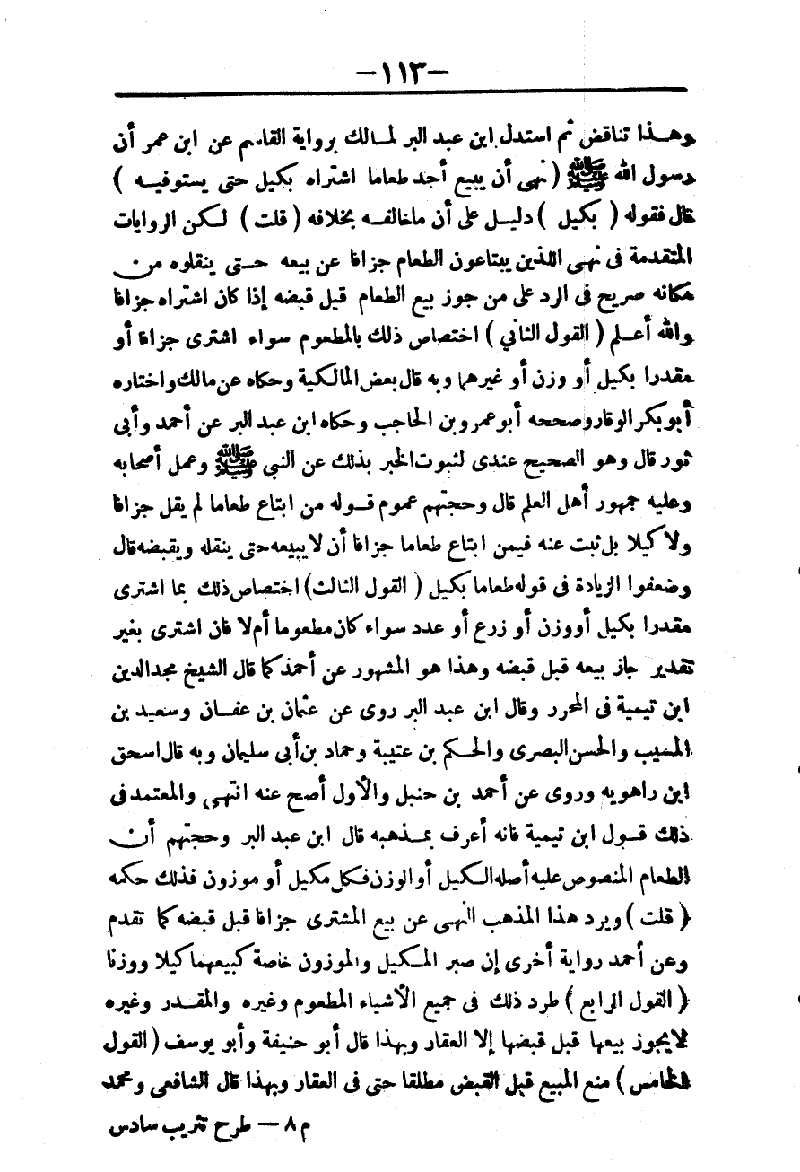 وَالْمُعْتَمَدُ فِي ذَلِكَ قَوْلُ ابْنِ تَيْمِيَّةَ فَإِنَّهُ أَعْرَفُ بِمَذْهَبِهِ قَالَ ابْنُ عَبْدِ الْبَرِّ: وَحُجَّتُهُمْ أَنَّ الطَّعَامَ الْمَنْصُوصَ عَلَيْهِ أَصْلُهُ الْكَيْلُ أَوْ الْوَزْنُ فَكُلُّ مَكِيلٍ أَوْ مَوْزُونٍ فَذَلِكَ حُكْمُهُ.