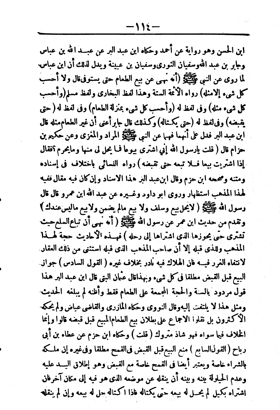 ـــــــــــــــــــــــــــــQوَمُحَمَّدُ بْنُ الْحَسَنِ وَهُوَ رِوَايَةٌ عَنْ أَحْمَدَ وَحَكَاهُ ابْنُ عَبْدِ الْبَرِّ عَنْ عَبْدِ اللَّهِ بْنِ عَبَّاسٍ وَجَابِرِ بْنِ عَبْدِ اللَّهِ وَسُفْيَانَ الثَّوْرِيِّ وَسُفْيَانَ بْنِ عُيَيْنَةَ وَيَدُلُّ لِذَلِكَ أَنَّ ابْنَ عَبَّاسٍ لَمَّا رَوَى عَنْ النَّبِيِّ - صَلَّى اللَّهُ عَلَيْهِ وَسَلَّمَ - «أَنَّهُ نَهَى عَنْ بَيْعِ الطَّعَامِ حَتَّى يُسْتَوْفَى قَالَ وَلَا أَحْسَبُ كُلَّ شَيْءٍ إلَّا مِثْلَهُ» رَوَاهُ الْأَئِمَّةُ السِّتَّةُ، وَهَذَا لَفْظُ الْبُخَارِيِّ وَلَفْظُ مُسْلِمٍ (وَأَحْسَبُ كُلَّ شَيْءٍ مِثْلَهُ) وَفِي لَفْظٍ لَهُ (وَأَحْسَبُ كُلَّ شَيْءٍ بِمَنْزِلَةِ الطَّعَامِ) وَفِي لَفْظٍ لَهُ (حَتَّى يَقْبِضَهُ) وَفِي لَفْظٍ لَهُ (حَتَّى يَكْتَالَهُ) وَكَذَلِكَ قَالَ جَابِرٌ أَعْنِي أَنَّ غَيْرَ الطَّعَامِ مِثْلُهُ قَالَ ابْنُ عَبْدِ الْبَرِّ: فَدَلَّ عَلَى أَنَّهُمَا فَهِمَا عَنْ النَّبِيِّ - صَلَّى اللَّهُ عَلَيْهِ وَسَلَّمَ - الْمُرَادَ وَالْمَغْزَى وَعَنْ حَكِيمِ بْنِ حِزَامٍ قَالَ: «قُلْت يَا رَسُولَ اللَّهِ إنِّي أَشْتَرِي بُيُوعًا فَمَا يَحِلُّ لِي مِنْهَا وَمَا يَحْرُمُ؟ فَقَالَ إذَا اشْتَرَيْت بَيْعًا فَلَا تَبِعْهُ حَتَّى تَقْبِضَهُ» رَوَاهُ النَّسَائِيّ بِاخْتِلَافٍ فِي إسْنَادِهِ وَمَتْنِهِ وَصَحَّحَهُ ابْنُ حَزْمٍ وَقَالَ ابْنُ عَبْدِ الْبَرِّ: هَذَا الْإِسْنَادُ، وَإِنْ كَانَ فِيهِ مَقَالٌ فَفِيهِ لِهَذَا الْمَذْهَبِ اسْتِظْهَارٌ وَرَوَى أَبُو دَاوُد وَغَيْرُهُ عَنْ عَبْدِ اللَّهِ بْنِ عُمَرَ وَقَالَ: قَالَ رَسُولُ اللَّهِ - صَلَّى اللَّهُ عَلَيْهِ وَسَلَّمَ - «لَا يَحِلُّ بَيْعٌ وَسَلَفٌ وَلَا بَيْعُ مَا لَمْ يُضْمَنْ وَلَا بَيْعُ مَا لَيْسَ عِنْدَك» وَتَقَدَّمَ مِنْ حَدِيثِ ابْنِ عُمَرَ عَنْ رَسُولِ اللَّهِ - صَلَّى اللَّهُ عَلَيْهِ وَسَلَّمَ - «أَنَّهُ نَهَى أَنْ تُبَاعَ السِّلَعَ حَيْثُ تُشْتَرَى حَتَّى يَحُوزَهَا الَّذِي اشْتَرَاهَا إلَى رَحْلِهِ» فَهَذِهِ الْأَحَادِيثُ حُجَّةٌ لِهَذَا الْمَذْهَبِ وَلِلَّذِي قَبْلَهُ إلَّا أَنَّ صَاحِبَ الْمَذْهَبِ الَّذِي قَبْلَهُ اسْتَثْنَى مِنْ ذَلِكَ الْعَقَارَ؛ لِانْتِفَاءِ الْغَرَرِ فِيهِ فَإِنَّ الْهَلَاكَ فِيهِ نَادِرٌ بِخِلَافِ غَيْرِهِ.