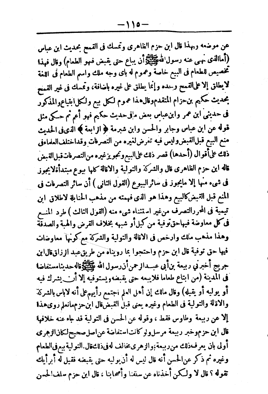 ـــــــــــــــــــــــــــــQعَنْ مَوْضِعِهِ وَبِهَذَا قَالَ ابْنُ حَزْمٍ الظَّاهِرِيُّ وَتَمَسَّكَ فِي الْقَمْحِ بِحَدِيثِ ابْنِ عَبَّاسٍ (أَمَّا الَّذِي نَهَى عَنْهُ رَسُولُ اللَّهِ - صَلَّى اللَّهُ عَلَيْهِ وَسَلَّمَ - أَنْ يُبَاعَ حَتَّى يُقْبَضَ فَهُوَ الطَّعَامُ) وَقَالَ فَهَذَا تَخْصِيصٌ لِلطَّعَامِ فِي الْبَيْعِ خَاصَّةً وَعُمُومٌ لَهُ بِأَيِّ وَجْهِ مِلْكٍ، وَاسْمُ الطَّعَامِ فِي اللُّغَةِ لَا يُطْلَقُ إلَّا عَلَى الْقَمْحِ وَحْدَهُ، وَإِنَّمَا يُطْلَقُ عَلَى غَيْرِهِ بِإِضَافَةٍ، وَتَمَسَّكَ فِي غَيْرِ الْقَمْحِ بِحَدِيثِ حَكِيمِ بْنِ حِزَامٍ الْمُتَقَدِّمِ وَقَالَ هَذَا عُمُومٌ لِكُلِّ بَيْعٍ وَلِكُلِّ ابْتِيَاعٍ وَالْمَذْكُورُ فِي حَدِيثَيْ ابْنِ عُمَرَ وَابْنِ عَبَّاسٍ بَعْضُ مَا فِي حَدِيثِ حَكِيمِ فَهُوَ أَعَمُّ ثُمَّ حَكَى مِثْلَ قَوْلِهِ عَنْ ابْنِ عَبَّاسٍ وَجَابِرٍ وَالْحَسَنِ وَابْنُ شُبْرُمَةَ.