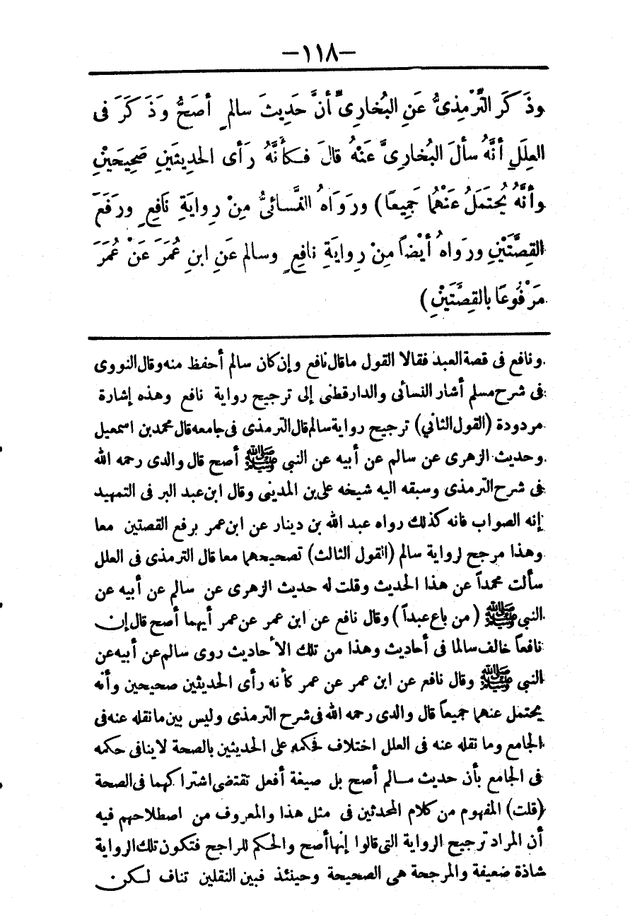 وَذَكَرَ التِّرْمِذِيُّ عَنْ الْبُخَارِيِّ أَنَّ حَدِيثَ سَالِمٍ أَصَحُّ، وَذَكَرَ فِي الْعِلَلِ أَنَّهُ سَأَلَ الْبُخَارِيَّ عَنْهُ قَالَ فَكَأَنَّهُ رَأَى الْحَدِيثَيْنِ صَحِيحَيْنِ، وَأَنَّهُ يَحْتَمِلُ عَنْهُمَا جَمِيعًا وَرَوَاهُ النَّسَائِيّ مِنْ رِوَايَةِ نَافِعٍ وَرَفَعَ الْقِصَّتَيْنِ وَرَوَاهُ أَيْضًا مِنْ رِوَايَةِ نَافِعٍ وَسَالِمٍ عَنْ ابْنِ عُمَرَ عَنْ عُمَرَ مَرْفُوعًا بِالْقِصَّتَيْنِ..