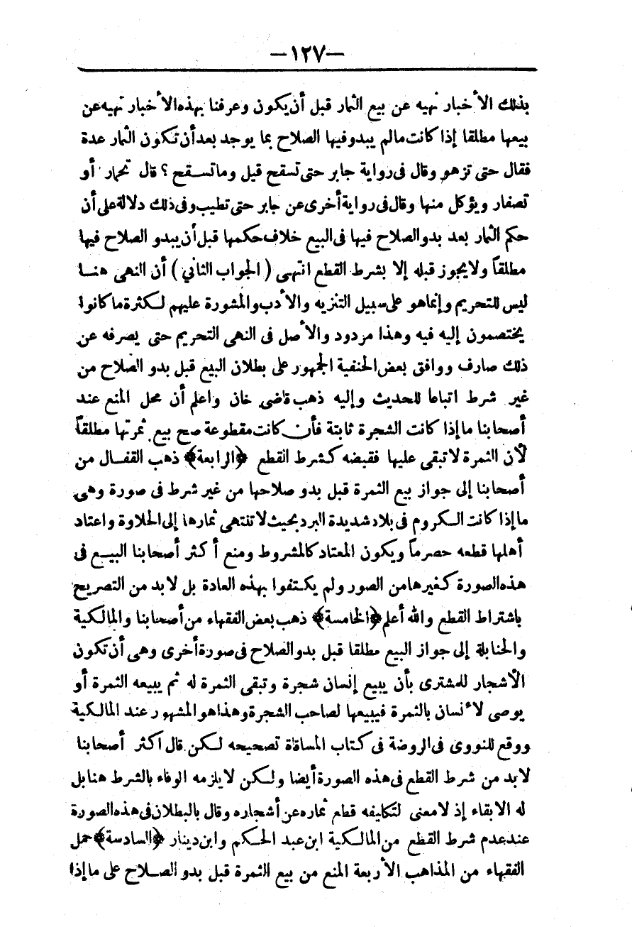 (الْجَوَابُ الثَّانِي) أَنَّ النَّهْيَ هُنَا لَيْسَ لِلتَّحْرِيمِ، وَإِنَّمَا هُوَ عَلَى سَبِيلِ التَّنْزِيهِ وَالْأَدَبِ وَالْمَشُورَةِ عَلَيْهِمْ لِكَثْرَةِ مَا كَانُوا يَخْتَصِمُونَ إلَيْهِ فِيهِ وَهَذَا مَرْدُودٌ، وَالْأَصْلُ فِي النَّهْيِ التَّحْرِيمُ حَتَّى يَصْرِفَهُ عَنْ ذَلِكَ صَارِفٌ وَوَافَقَ بَعْضُ الْحَنَفِيَّةِ الْجُمْهُورَ عَلَى بُطْلَانِ الْبَيْعِ قَبْلَ بُدُوِّ الصَّلَاحِ مِنْ غَيْرِ شَرْطٍ اتِّبَاعًا لِلْحَدِيثِ، وَإِلَيْهِ ذَهَبَ قَاضِي خَانَ. وَاعْلَمْ أَنَّ مَحَلَّ الْمَنْعِ عِنْدَ أَصْحَابِنَا مَا إذَا كَانَتْ الشَّجَرَةُ ثَابِتَةً فَإِنْ كَانَتْ مَقْطُوعَةً صَحَّ بَيْعُ ثَمَرَتِهَا مُطْلَقًا؛ لِأَنَّ الثَّمَرَةَ لَا تَبْقَى عَلَيْهَا فَقَبْضُهُ كَشَرْطِ الْقَطْعِ. {الرَّابِعَةُ} ذَهَبَ الْقَفَّالُ مِنْ أَصْحَابِنَا إلَى جَوَازِ بَيْعِ الثَّمَرَةِ قَبْلَ بُدُوِّ صَلَاحِهَا مِنْ غَيْرِ شَرْطٍ فِي صُورَةٍ وَهِيَ مَا إذَا كَانَتْ الْكُرُومُ فِي بِلَادٍ شَدِيدَةِ الْبَرْدِ بِحَيْثُ لَا تَنْتَهِي ثِمَارُهَا إلَى الْحَلَاوَةِ وَاعْتَادَ أَهْلُهَا قَطَعَهُ حِصْرِمًا وَيَكُونُ الْمُعْتَادُ كَالْمَشْرُوطِ وَمَنَعَ أَكْثَرُ أَصْحَابِنَا الْبَيْعَ فِي هَذِهِ الصُّورَةِ كَغَيْرِهَا مِنْ الصُّوَرِ، وَلَمْ يَكْتَفُوا بِهَذِهِ الْعَادَةِ بَلْ لَا بُدَّ مِنْ التَّصْرِيحِ بِاشْتِرَاطِ الْقَطْعِ وَاَللَّهُ أَعْلَمُ.