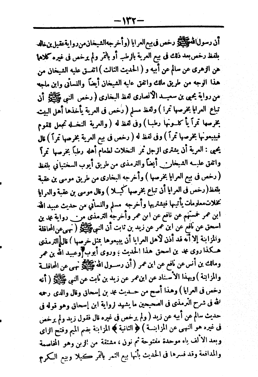 وَ (الْحَدِيثُ الثَّالِثُ) اتَّفَقَ عَلَيْهِ الشَّيْخَانِ مِنْ هَذَا الْوَجْهِ مِنْ طَرِيقِ مَالِكٍ وَاتَّفَقَ عَلَيْهِ الشَّيْخَانِ أَيْضًا وَالنَّسَائِيُّ وَابْنُ مَاجَهْ مِنْ رِوَايَةِ يَحْيَى بْنِ سَعِيدٍ الْأَنْصَارِيِّ لَفْظُ الْبُخَارِيِّ «رَخَّصَ النَّبِيُّ - صَلَّى اللَّهُ عَلَيْهِ وَسَلَّمَ - أَنْ تُبَاعَ الْعَرَايَا بِخَرْصِهَا تَمْرًا» . وَلَفْظُ مُسْلِمٍ «رَخَّصَ فِي الْعَرِيَّةِ يَأْخُذُهَا أَهْلُ الْبَيْتِ بِخَرْصِهَا تَمْرًا يَأْكُلُونَهَا رُطَبًا» وَفِي لَفْظٍ لَهُ «وَالْعَرِيَّةُ النَّخْلَةُ تُجْعَلُ لِلْقَوْمِ فَيَبِيعُونَهَا بِخَرْصِهَا تَمْرًا» . وَفِي لَفْظٍ لَهُ «رَخَّصَ فِي بَيْعِ الْعَرِيَّةِ بِخَرْصِهَا تَمْرًا» قَالَ يَحْيَى: الْعَرِيَّةُ أَنْ يَشْتَرِيَ الرَّجُلُ ثَمَرَ النَّخَلَاتِ لِطَعَامِ أَهْلِهِ رُطَبًا بِخَرْصِهَا تَمْرًا وَاتَّفَقَ عَلَيْهِ الشَّيْخَانِ أَيْضًا وَالتِّرْمِذِيُّ مِنْ طَرِيقِ أَيُّوبَ السِّخْتِيَانِيُّ بِلَفْظِ «رَخَّصَ فِي بَيْعِ الْعَرَايَا بِخَرْصِهَا» . وَأَخْرَجَهُ الْبُخَارِيُّ مِنْ طَرِيقِ مُوسَى بْنِ عُقْبَةَ بِلَفْظِ «رَخَّصَ فِي الْعَرَايَا أَنْ تُبَاعَ بِخَرْصِهَا كَيْلًا» وَقَالَ مُوسَى بْنُ عُقْبَةَ وَالْعَرَايَا نَخَلَاتٌ مَعْلُومَاتٌ يَأْتِيهَا فَيَشْتَرِيهَا، وَأَخْرَجَهُ مُسْلِمٌ وَالنَّسَائِيُّ مِنْ حَدِيثِ عُبَيْدِ اللَّهِ بْنِ عُمَرَ خَمْسَتُهُمْ عَنْ نَافِعٍ عَنْ ابْنِ عُمَرَ، وَأَخْرَجَهُ التِّرْمِذِيُّ مِنْ رِوَايَةِ مُحَمَّدِ بْنِ إِسْحَاقَ عَنْ نَافِعٍ عَنْ ابْنِ عُمَرَ عَنْ زَيْدِ بْنِ ثَابِتٍ أَنَّ النَّبِيَّ - صَلَّى اللَّهُ عَلَيْهِ وَسَلَّمَ - «نَهَى عَنْ الْمُحَاقَلَةِ وَالْمُزَابَنَةِ إلَّا أَنَّهُ قَدْ أَذِنَ لِأَهْلِ الْعَرَايَا أَنْ يَبِيعُوهَا بِمِثْلِ خَرْصِهَا» . قَالَ التِّرْمِذِيُّ هَكَذَا رَوَى مُحَمَّدُ بْنُ إِسْحَاقَ هَذَا الْحَدِيثَ؛ وَرَوَى أَيُّوبُ وَعُبَيْدُ اللَّهِ بْنُ عُمَرَ وَمَالِكُ بْنُ أَنَسٍ عَنْ نَافِعٍ عَنْ ابْنِ عُمَرَ أَنَّ رَسُولَ اللَّهِ - صَلَّى اللَّهُ عَلَيْهِ وَسَلَّمَ - «نَهَى عَنْ الْمُحَاقَلَةِ وَالْمُزَابَنَةِ» . وَبِهَذَا الْأَسْنَادِ عَنْ ابْنِ عُمَرَ عَنْ زَيْدِ بْنِ ثَابِتٍ عَنْ النَّبِيِّ - صَلَّى اللَّهُ عَلَيْهِ وَسَلَّمَ - «أَنَّهُ رَخَّصَ فِي الْعَرَايَا» وَهَذَا أَصَحُّ مِنْ حَدِيثِ مُحَمَّدِ بْنِ إِسْحَاقَ وَقَالَ وَالِدِي - رَحِمَهُ اللَّهُ - فِي شَرْحِ التِّرْمِذِيِّ فِي الصَّحِيحَيْنِ مَا يَشْهَدُ لِرِوَايَةِ ابْنِ إِسْحَاقَ وَهُوَ قَوْلُهُ فِي حَدِيثِ سَالِمٍ عَنْ أَبِيهِ عَنْ زَيْدٍ (وَلَمْ يُرَخِّصْ فِي غَيْرِهِ قَالَ فَقَوْل زَيْدٍ وَلَمْ يُرَخِّصْ فِي غَيْرِهِ هُوَ النَّهْيُ عَنْ الْمُزَابَنَةِ) .